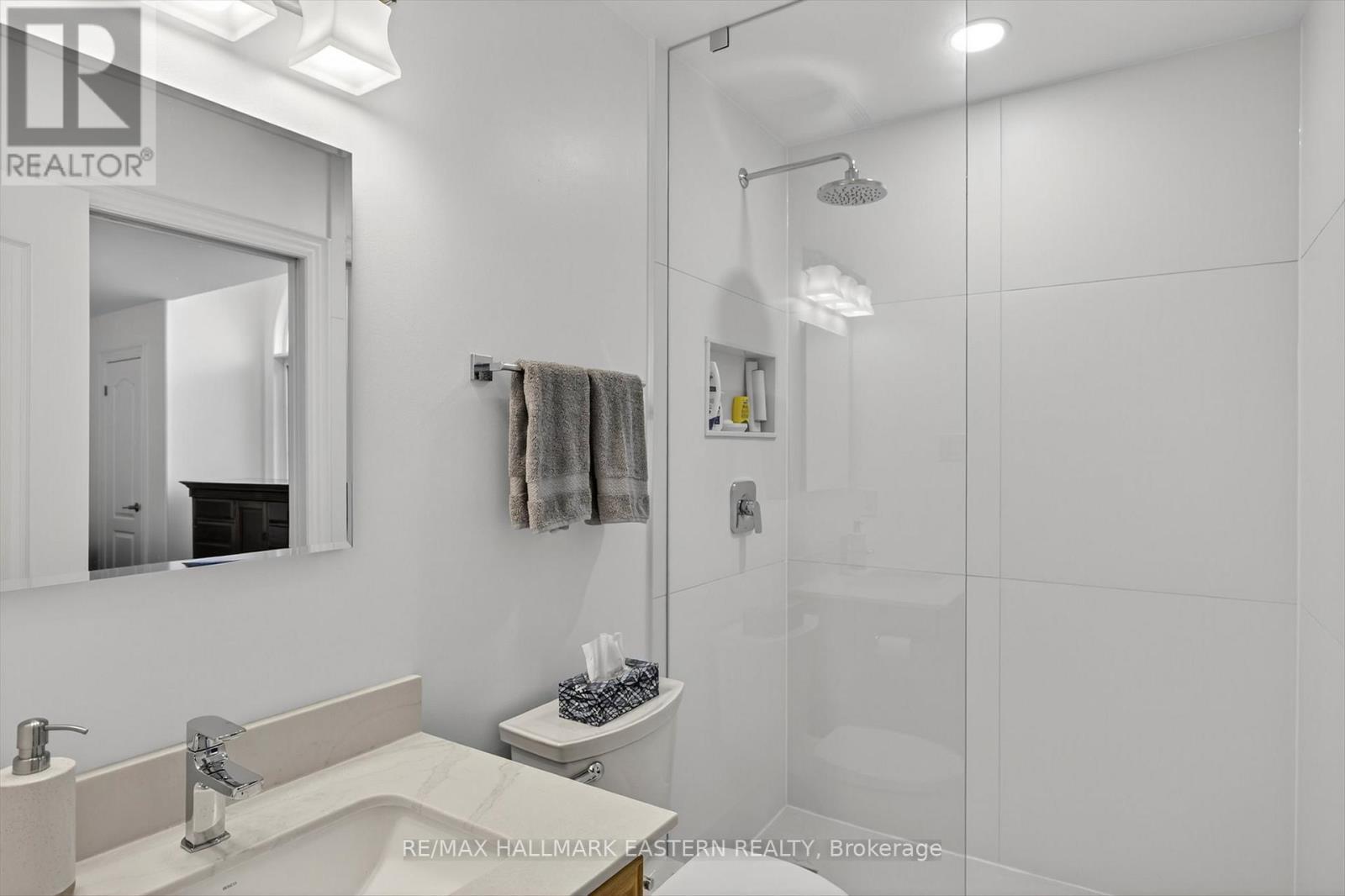 Beautifully renovated west-end end-unit condo offering turnkey, low-maintenance living in one of Peterborough's most desirable neighbourhoods. This bright and modern bungalow-style unit features a fully updated main floor with 2 bedrooms, a brand-new bathroom with a walk-in glass shower, and convenient main-floor laundry with upgraded tile flooring. The home showcases all-new 3/4-inch birch hardwood floors, custom trim, and an inviting open-concept living and dining area complete with a cozy gas fireplace and a walkout to a private deck overlooking mature trees and green space. The large, upgraded kitchen is perfect for cooking and entertaining, offering quality cabinetry and granite countertops. The renovated lower level adds exceptional living space with new flooring throughout, featuring a spacious bedroom, an additional bathroom, a generous rec room with a second fireplace, and a walkout to the backyard-ideal for guests, hobbies, or multi-generational living. Parking and storage are easy with an attached garage that offers direct access into the unit. This beautifully finished end-unit combines modern upgrades, privacy, and functionality in a quiet, well-maintained community close to parks, trails, shopping, and all west-end amenities. (id:61423)