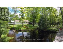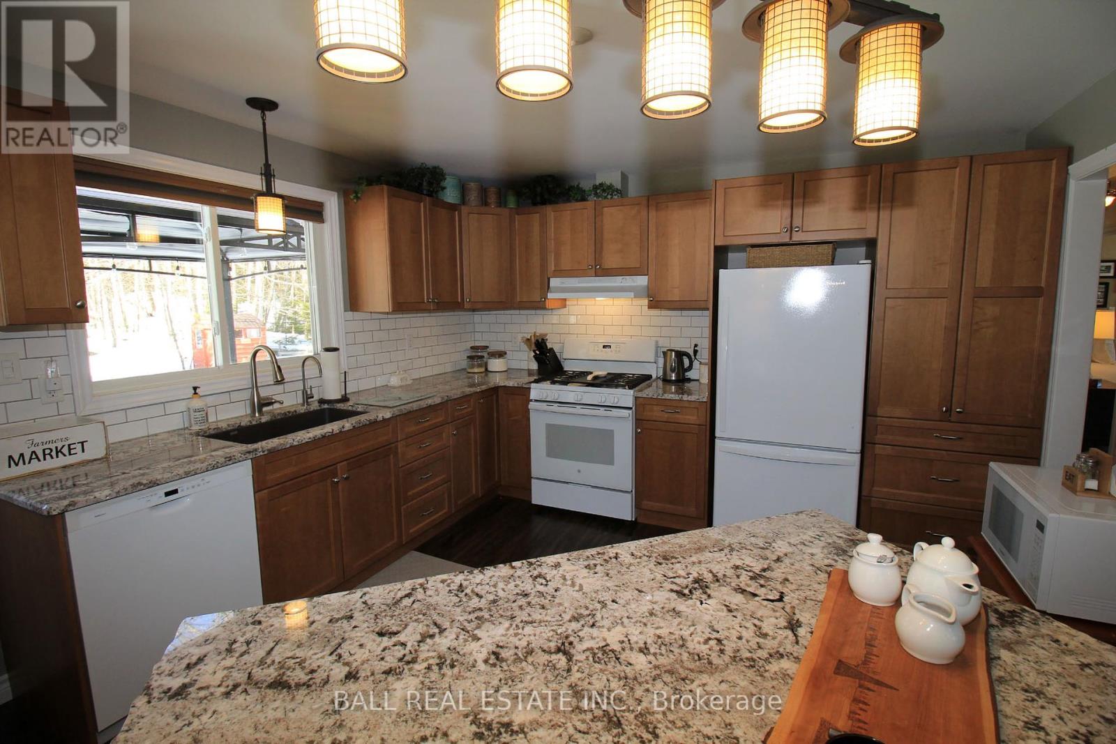 Extensively and beautifully renovated 3 bedroom - 2 bathroom home in the heart of cottage country is not to be missed. This ranch style beauty has a long list of upgrades and features including open concept kitchen-dining-living room, propane kitchen stove, attractive cupboards and granite counter tops. High quality fixtures throughout, a spacious and bright primary bedroom with 3 piece ensuite, 2 spare bedrooms and a 4 piece main bathroom all on the main floor. The office with separate entrance could be used for a home based business or a handy mud room with access from the attached 1.5 car garage. The large 1.39 acre lot with 347 feet of frontage offers great privacy and is beautifully landscaped with gardens, a deck for entertaining, a flowing creek and two ponds with four waterfalls! The large pond is swimmable with 6 feet depth off the dock, and a small beach. Other fine features include forced air propane heat with central air conditioner, impressive stone fireplace with efficient air tight woodstove insert, Generac standby generator, attached garage plus a detached 17'x30' shop for all the tools and toys! A short walk to the grocery store, LCBO, gift store, restaurant, curling club, new municipal park and beach! A short drive takes you to the boat launch and beach on Wilbermere Lake. Under 30 minutes gets you to Haliburton Village or 35 minutes to the Town of Bancroft for shopping and services. (id:61423)