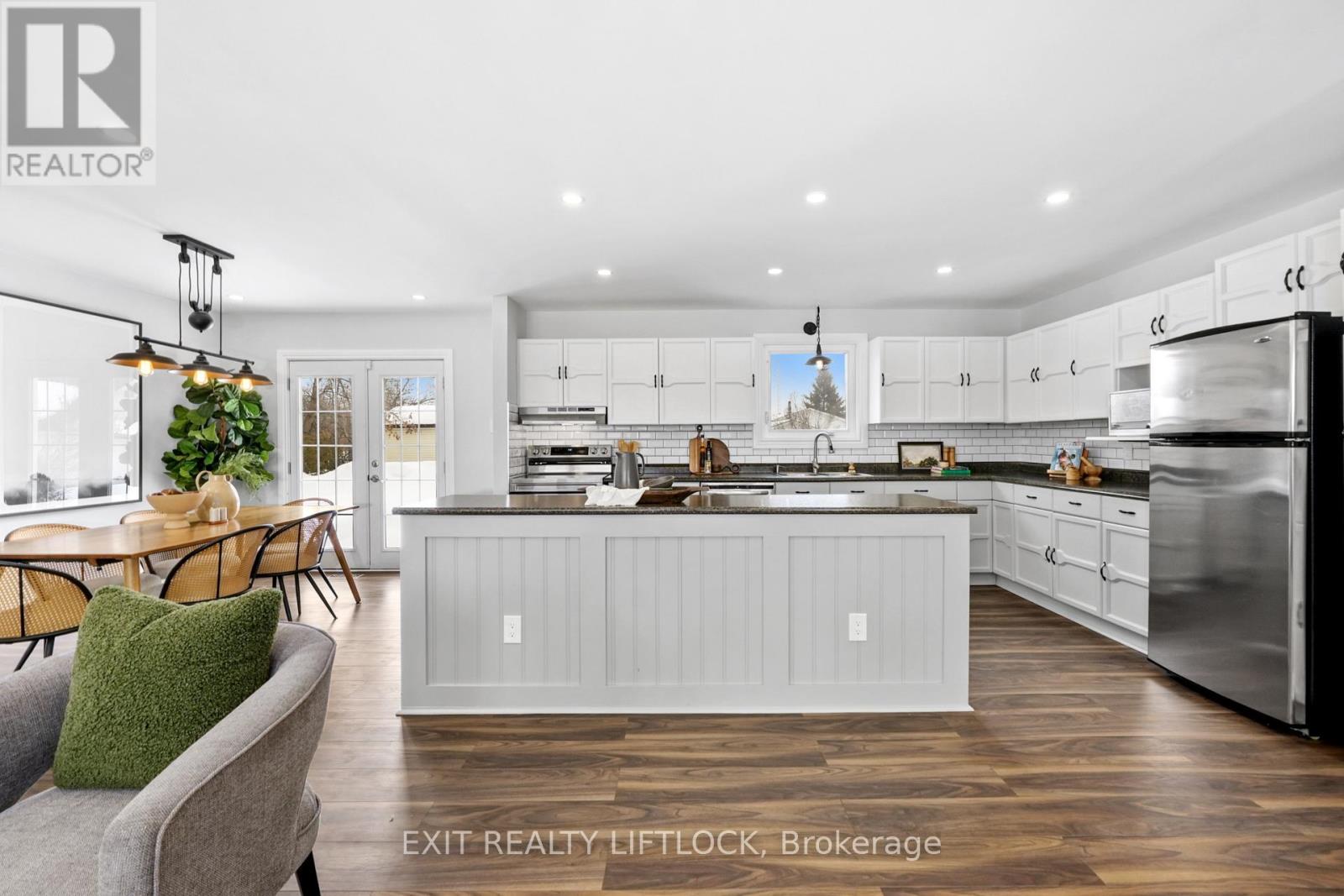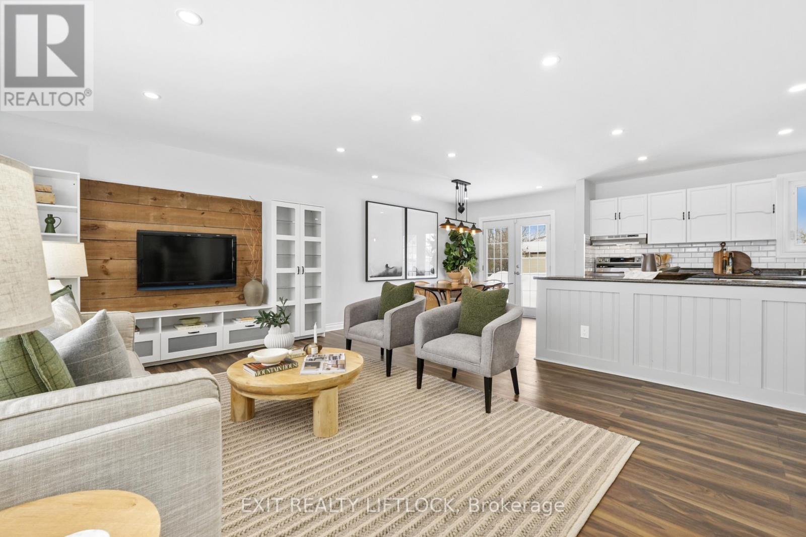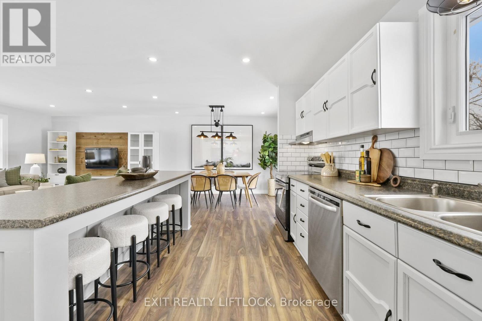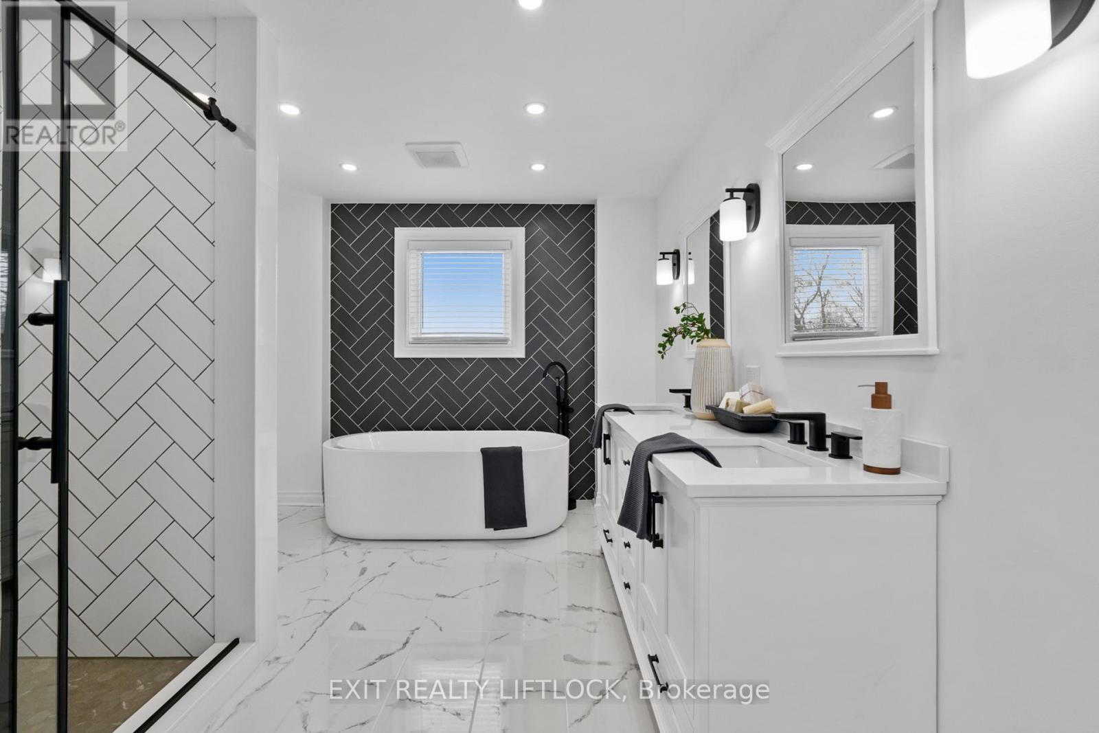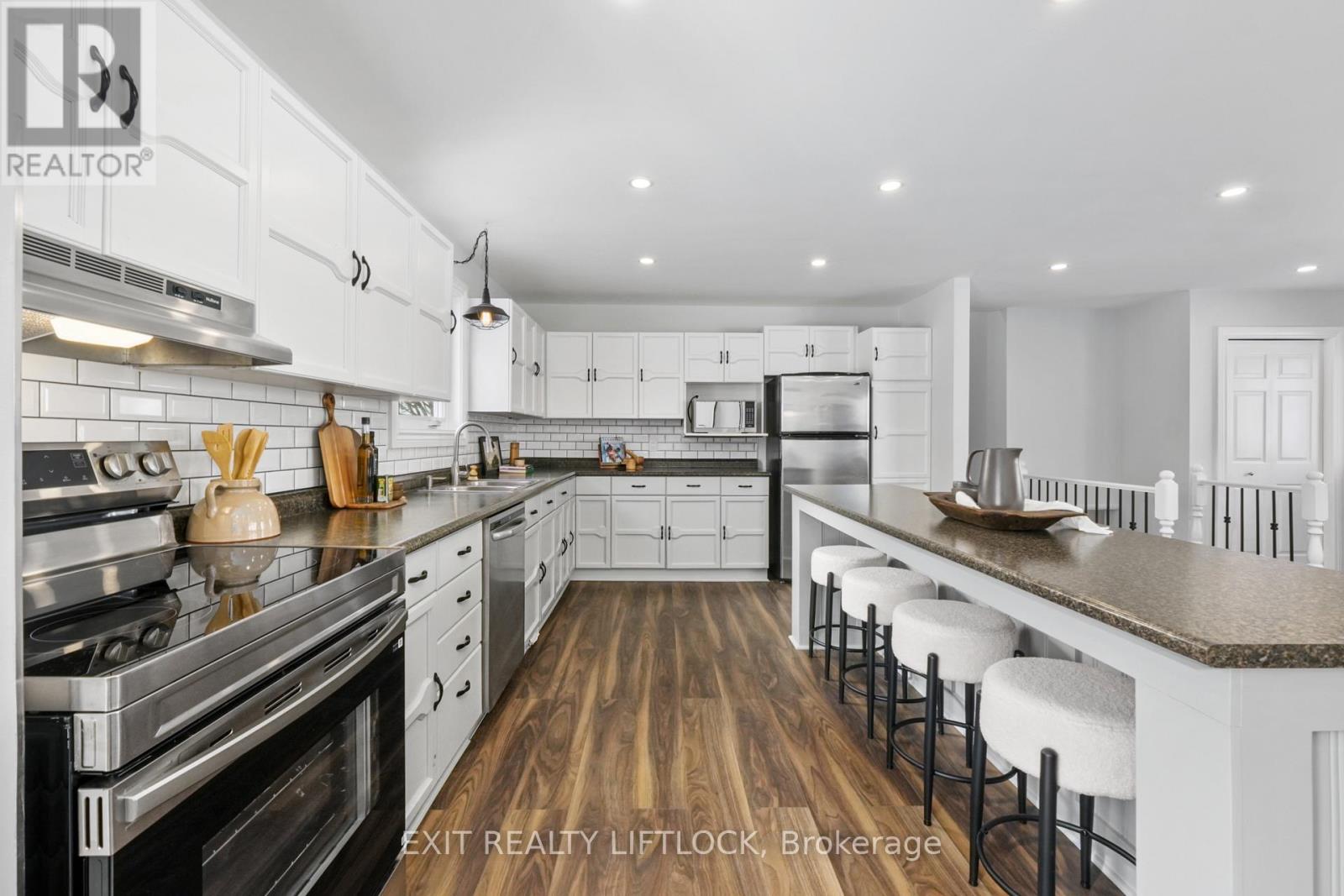 Set on a large, private lot on the edge of town, this beautifully updated four-level side-split offers the best of country-style living with everyday convenience close by. A bright, open-concept main level welcomes you with seamless living, dining, and kitchen spaces, complemented by stainless steel appliances and an inviting flow ideal for entertaining. The upper level features three bedrooms, including a stylish primary retreat with a striking feature wall and hardwood flooring throughout. The spa-inspired main bathroom is a true showstopper, complete with a standalone air-jet tub, walk-in shower, and modern LED pot lighting. The lower level adds versatility with a fourth bedroom, a convenient two-piece bath, and a beautifully finished laundry room with sink and high counters. The large drive is paved and continues behind the garage to the shed. It was formerly used as a basketball court. An attached double-car garage and a serene, oversized lot just minutes from town complete this exceptional offering. (id:61423)