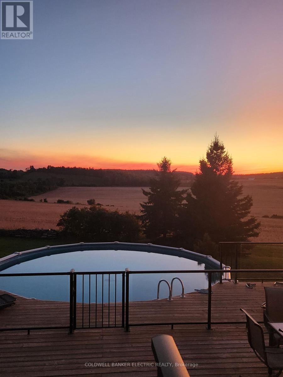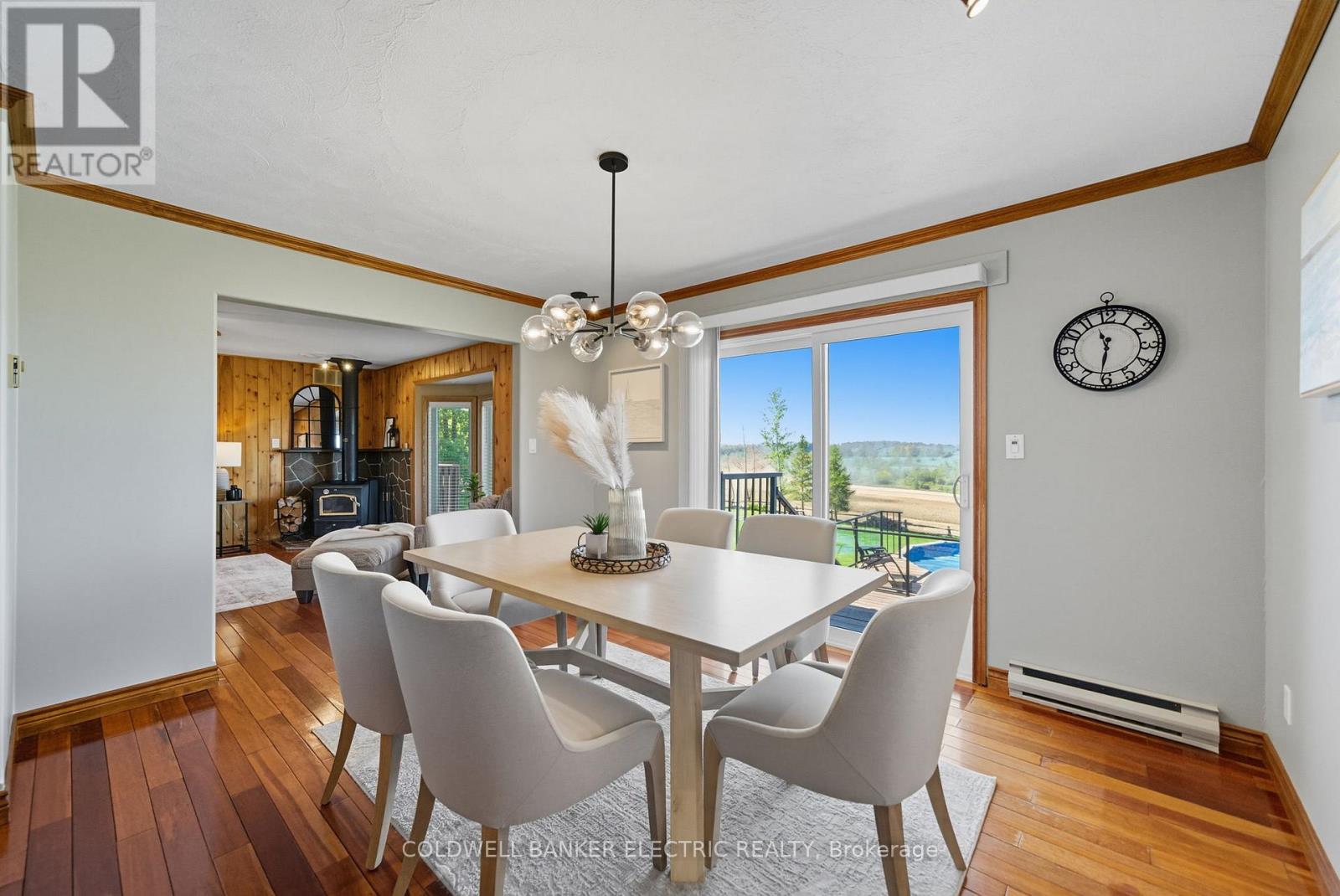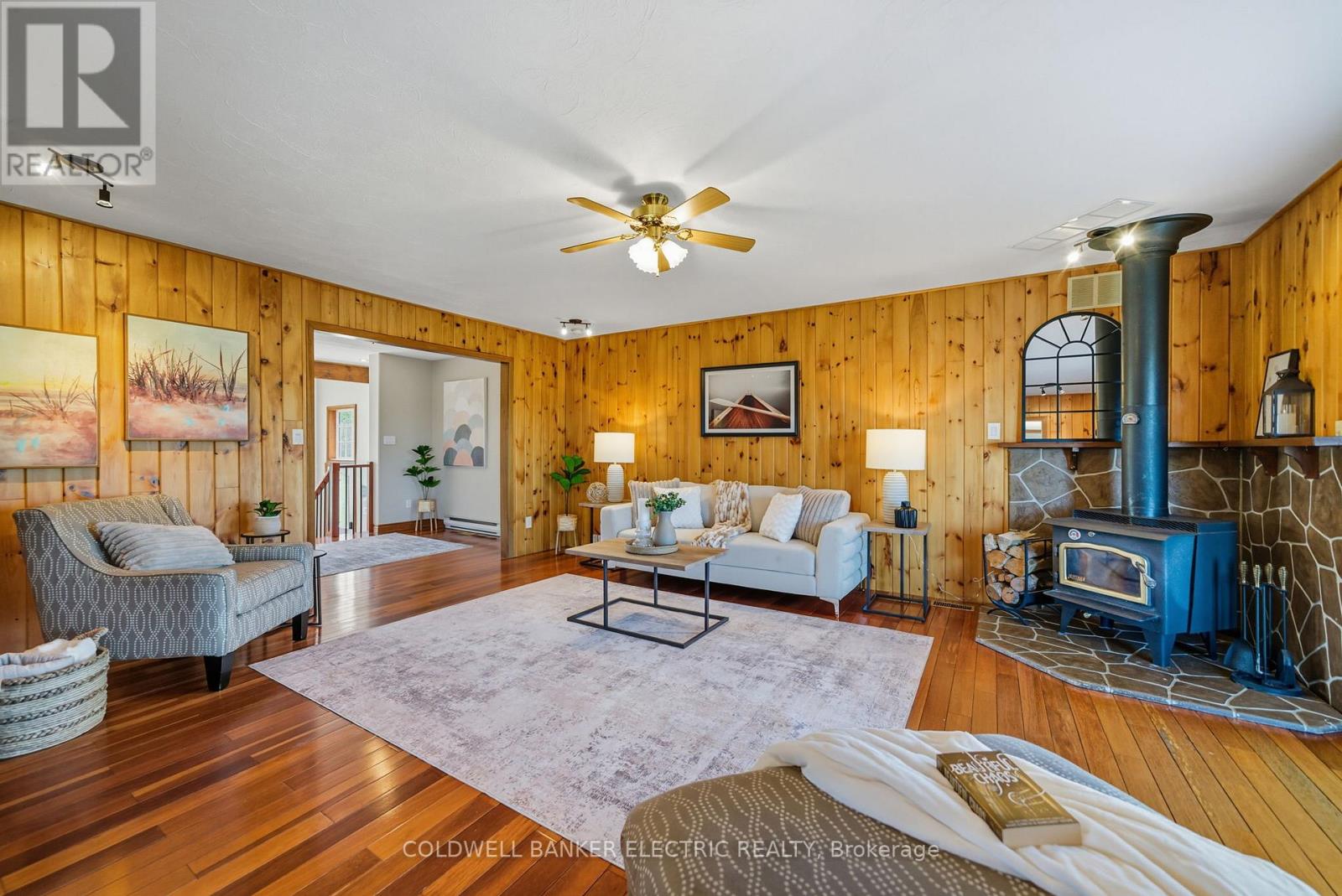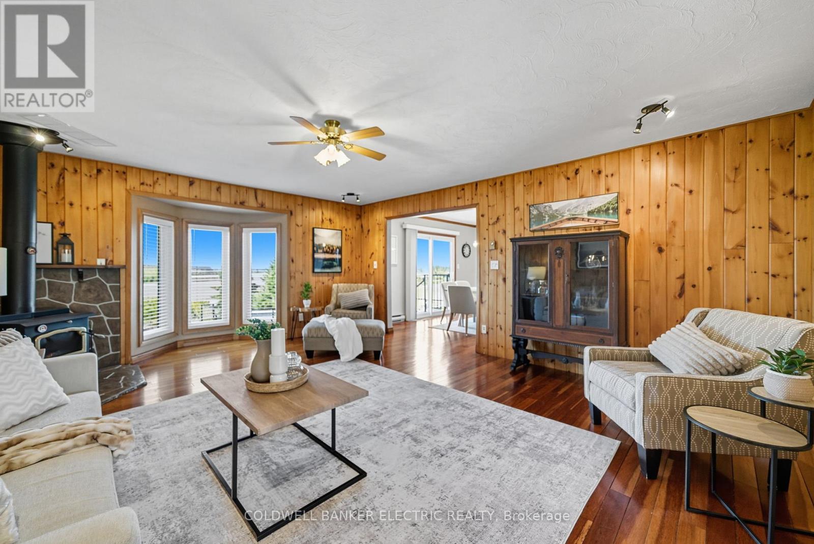 Enjoy cottage vibes without the cottage bills! This raised bungalow on Serpent Mounds Road offers a perfect balance of comfort, charm and practicality. With 3 + 2 bedrooms and 4 baths, you're getting dramatic rural panoramas and even glimpses of Rice Lake and just a minute (yes, I timed it) to the boat launch. Best part: no waterfront taxes, just pure lakeside joy. Step inside through a grand entry to the main floor, where gleaming Brazilian cherry wood floors shine. An oversized living room warmed by a wood stove features a heating redistribution system that sends cozy heat throughout the main floor, keeping you comfortable no matter where you are. The kitchen is both functional and generous: tons of cabinetry, a walk-in pantry, laundry room, plus direct access to the garage. The dining area leads out to a newer back deck (glass railings) overlooking a pool (liner replaced in 2025). Downstairs, the lower level is your custom-built chill zone: large family room with a stone gas fireplace, built-in hot tub for year-round relaxation, and two flexible rooms for bedrooms, office, hobby your choice. Outside, the fun continues: above-ground pool, fire pit, horseshoe pit, and wide open yard space for summer games or moonlit gatherings. The elevated lot gives you full 360-degree views, gorgeous sunsets, real wow moments. Location? Spot on. Close to Peterborough. Within walking reach of Keenes offerings: restaurant, pharmacy, LCBO / general store, library, school, medical centre, community centre with year-round events. Privacy, space and entertaining under one roof. A rare find near Rice Lake. (id:61423)