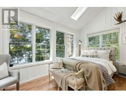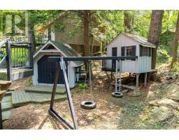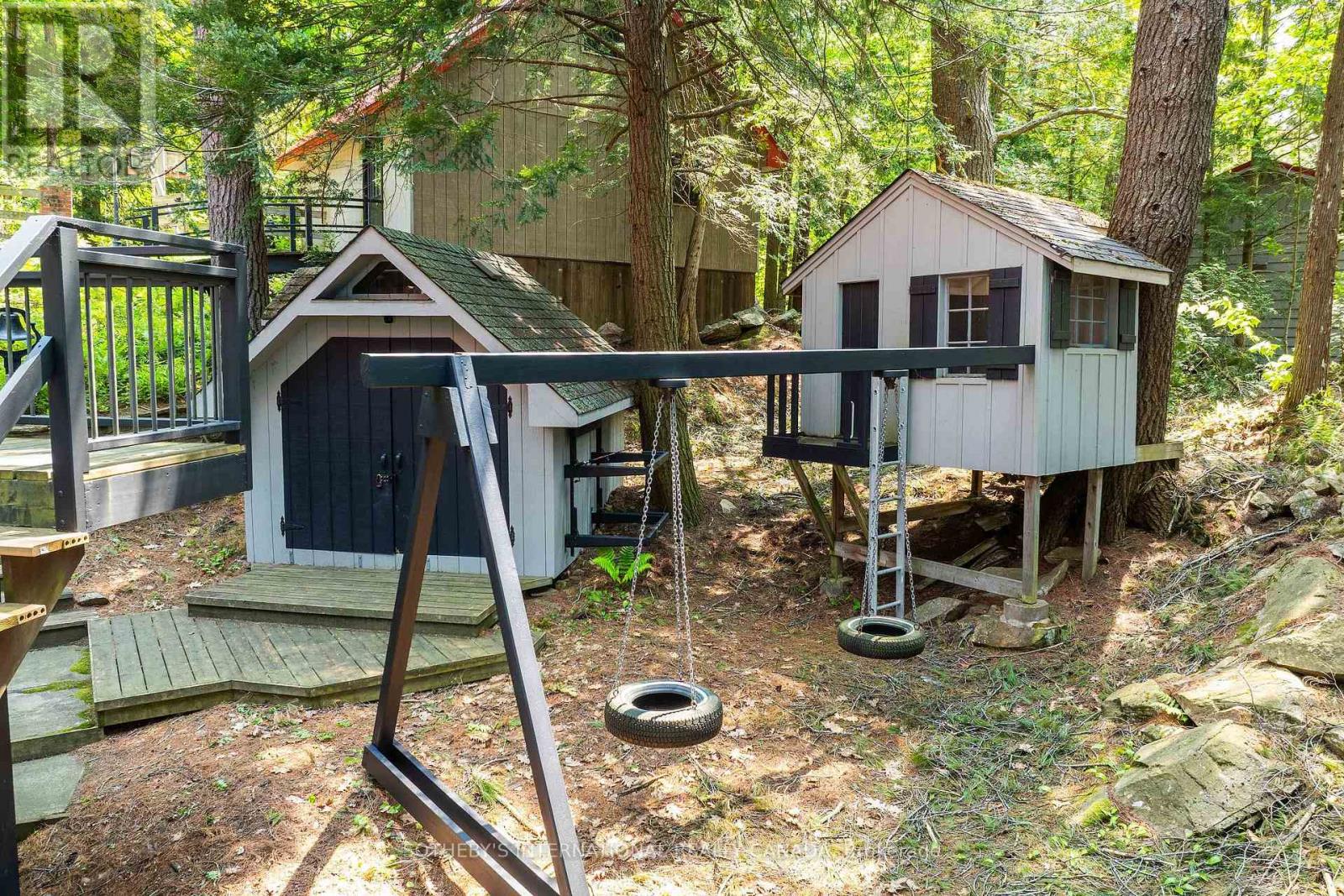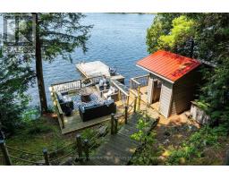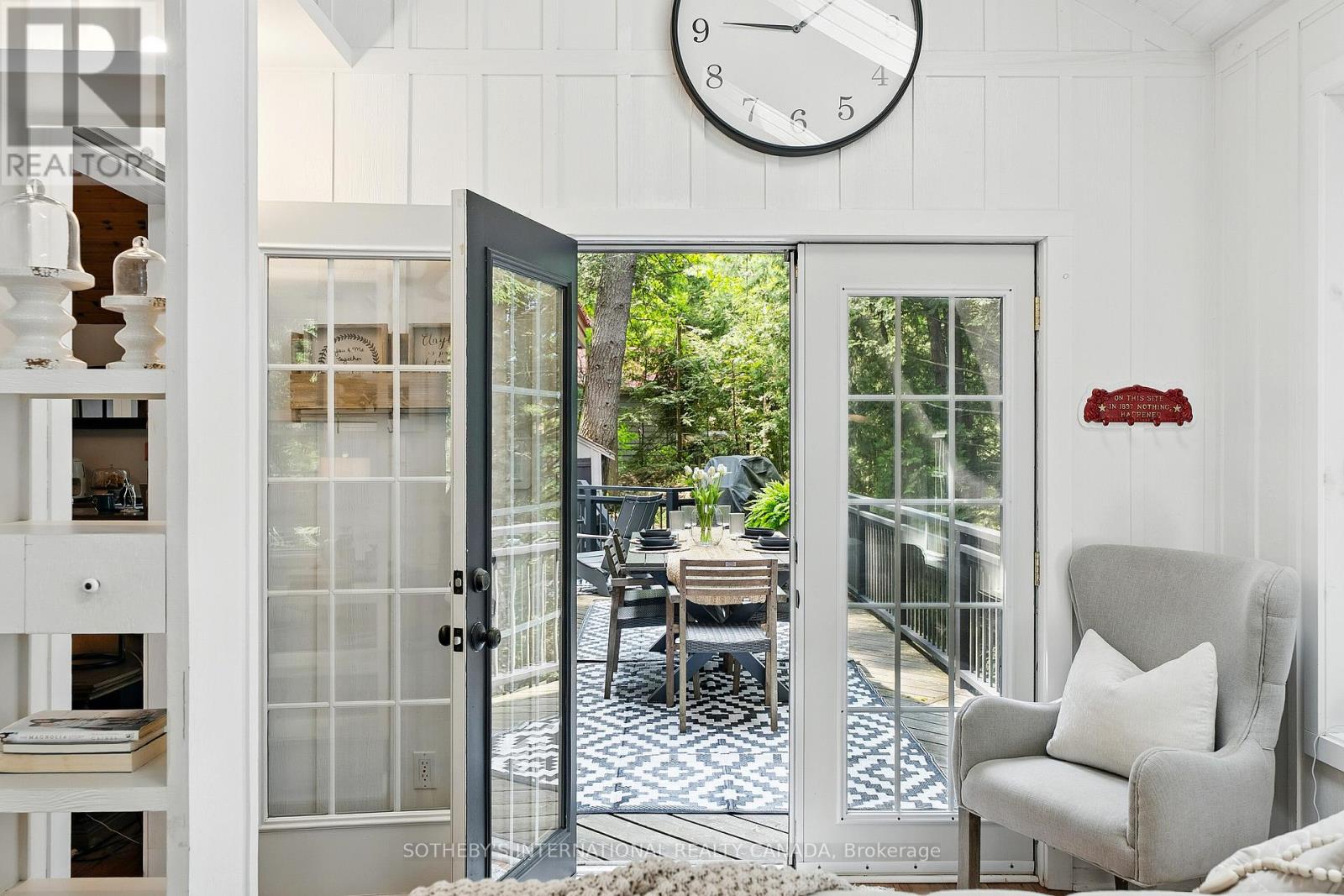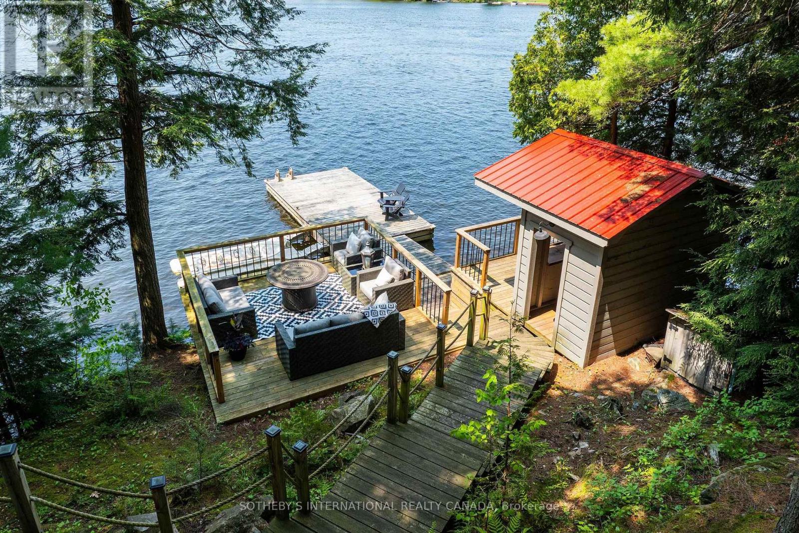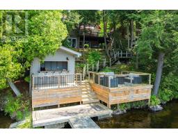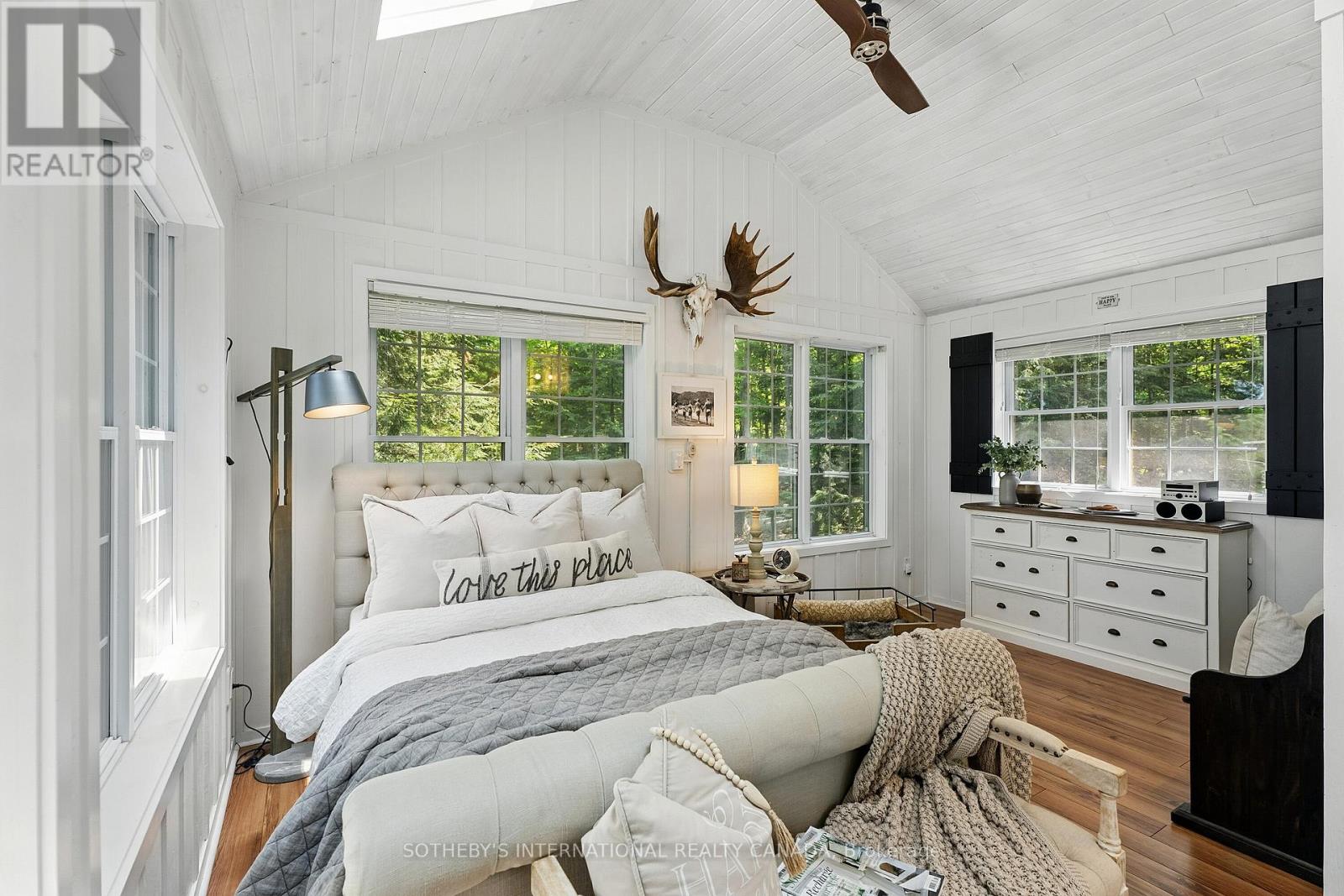 Moore Lake Renovated Lakefront Retreat with Sunset Views. Exquisite west-facing lakefront property on beautiful MooreLake, just two hours from the GTA. This private, maturely treed lot offers 154 feet of shoreline and spectacular sunset views, with year-round access at the end of a quiet cul-de-sac. Extensively renovated, the charming 1.5-storey cottage has been transformed into a refined four season retreat, blending modern comforts with rustic character. Inside, soaring cathedral pine ceilings, custom built-ins, and a sun-filled open concept layout create a warm and welcoming atmosphere. The sunroom flows seamlessly to the expansive lake-facing deck, offering the perfect space for entertaining or relaxing. The fully updated kitchen and bathrooms, stylish lighting, and high-quality finishes through out make this home move-in ready. The lower level offers flexible space with a walkout ideal for a third bedroom, studio, or workshop. Step outside to enjoy curated outdoor living at its best: a new outdoor kitchen, professionally landscaped stone pathways, a lakeside firepit, and 470 square feet of decking plus an extensive dock system ideal for swimming and boating. A detached double garage, adorable bunkie, and charming children's playhouse complete the package. Whether you are seeking a peaceful family getaway or an entertainer's dream, this turnkey property delivers timeless lakefront living with all the modern upgrades. (id:61423)