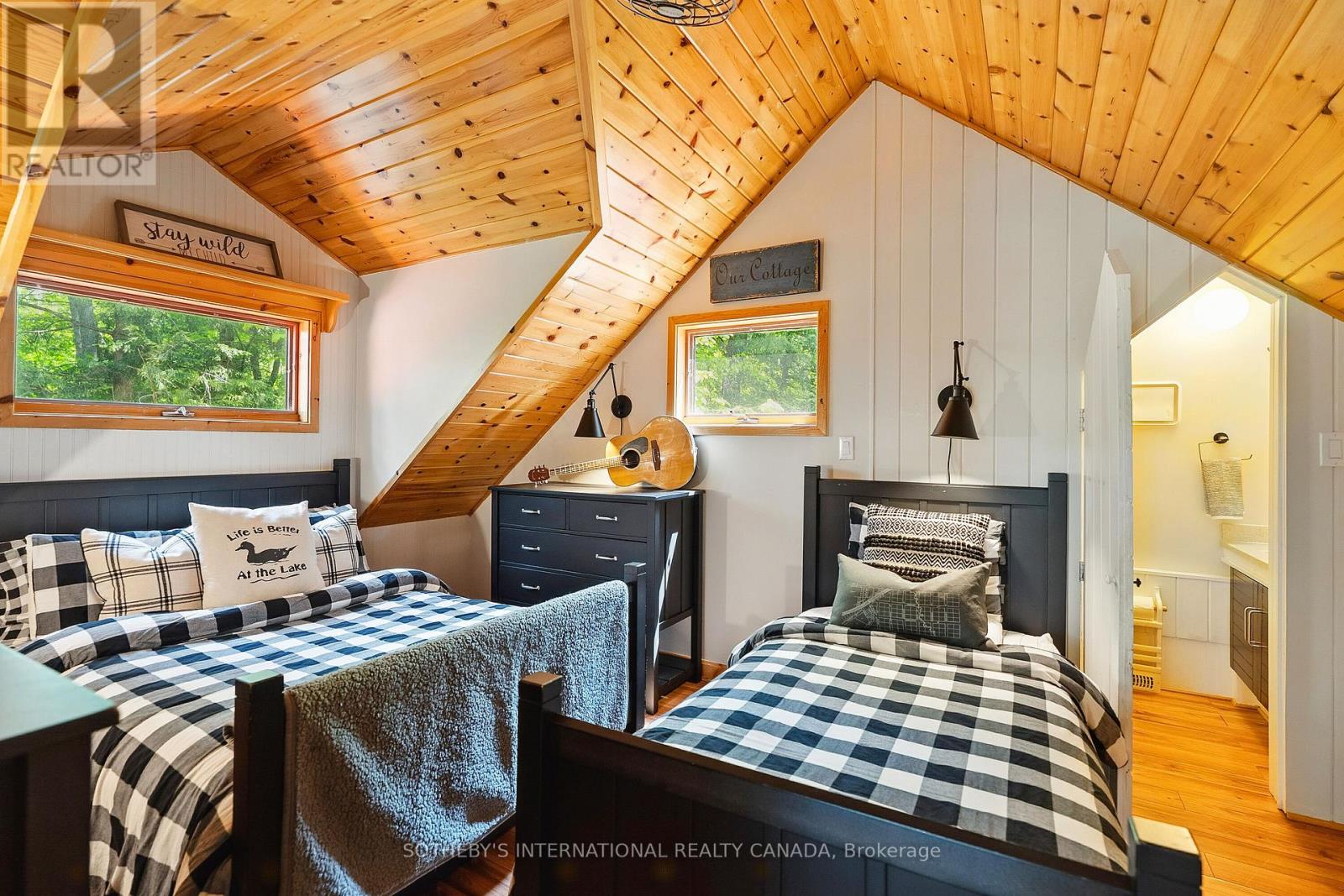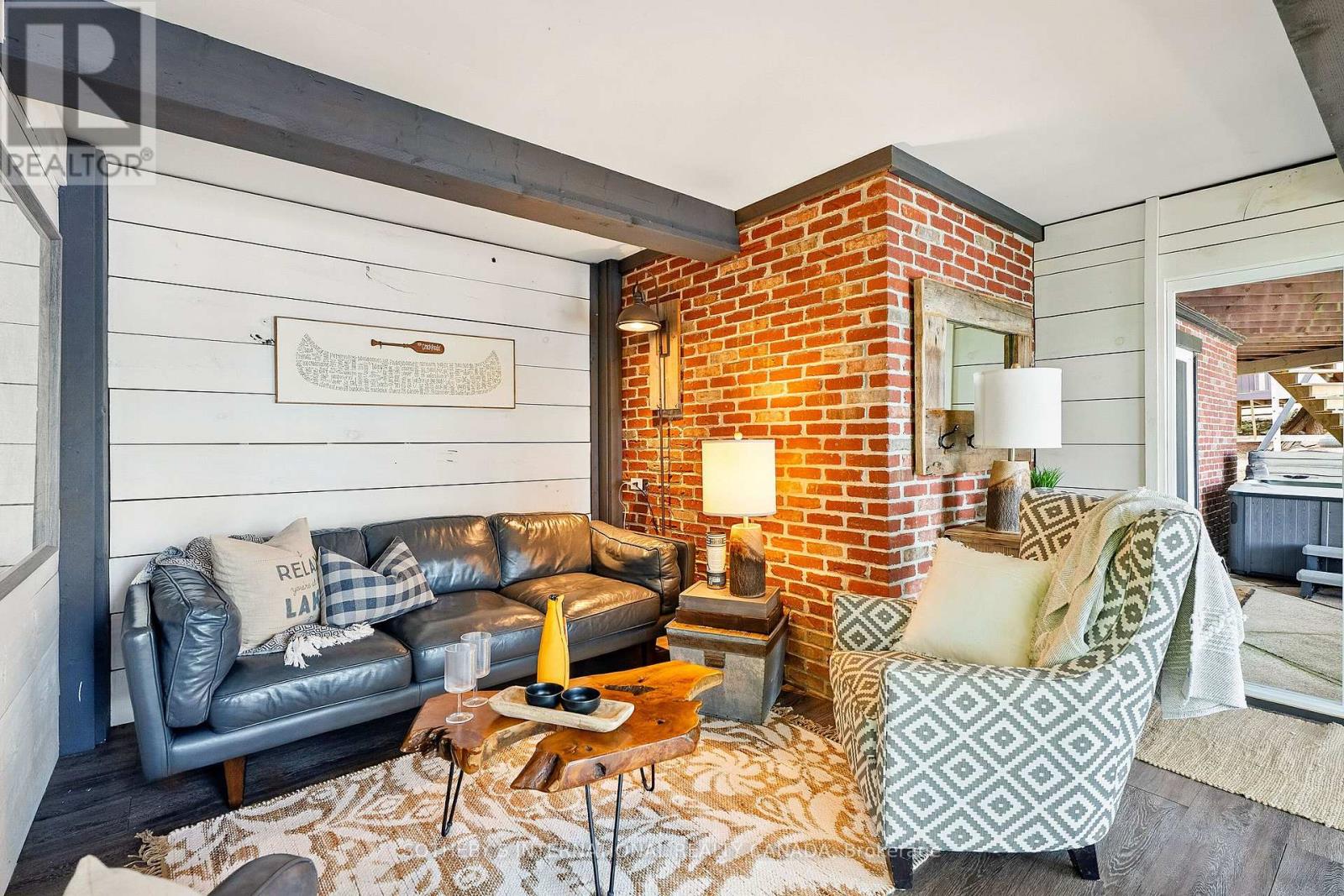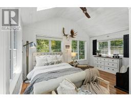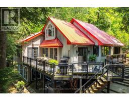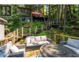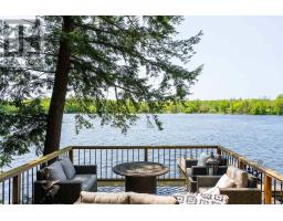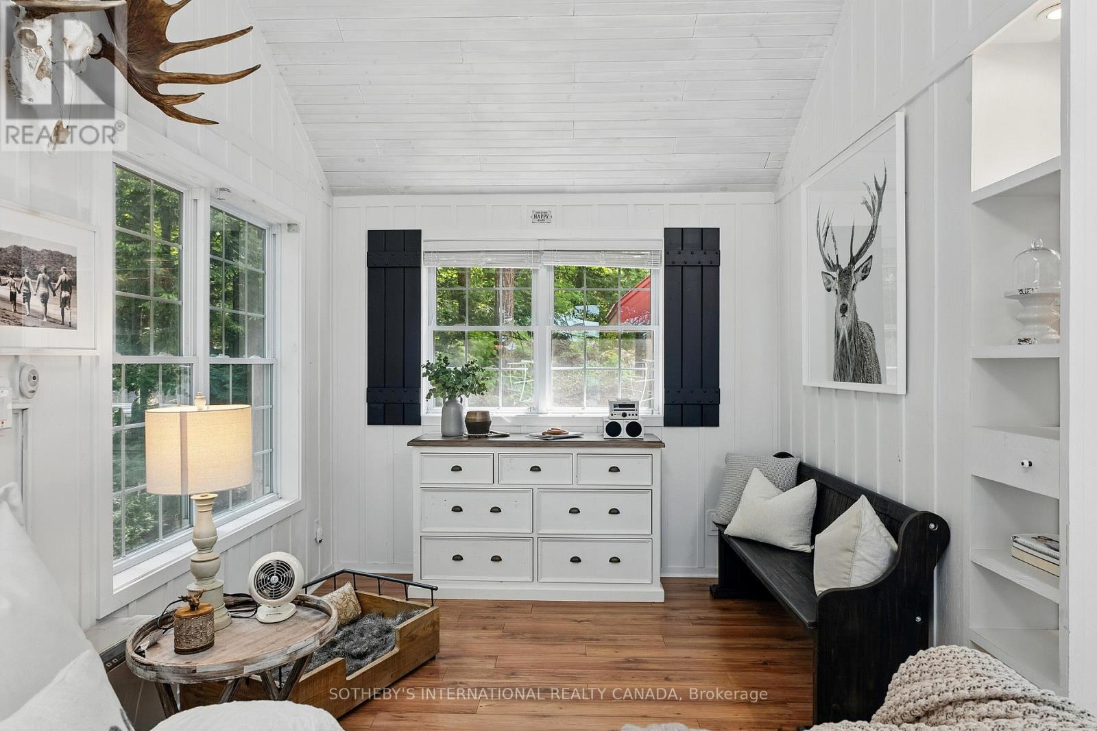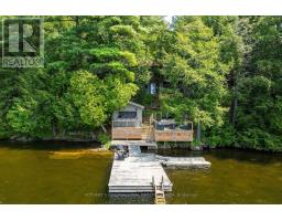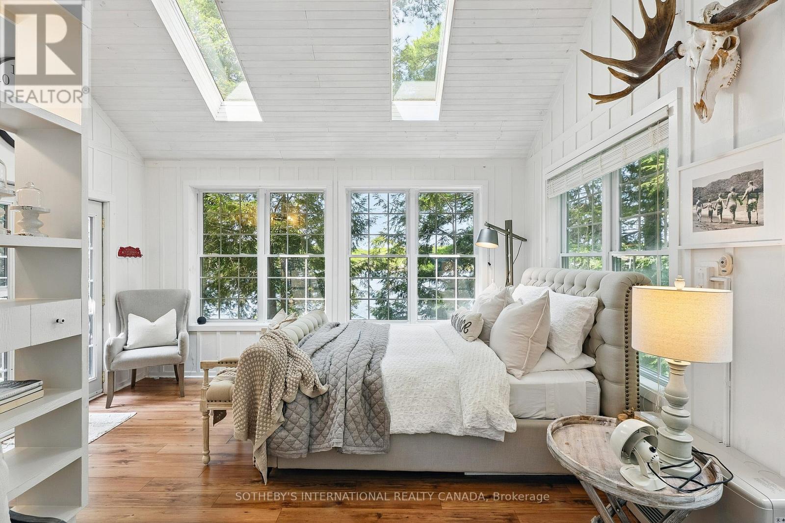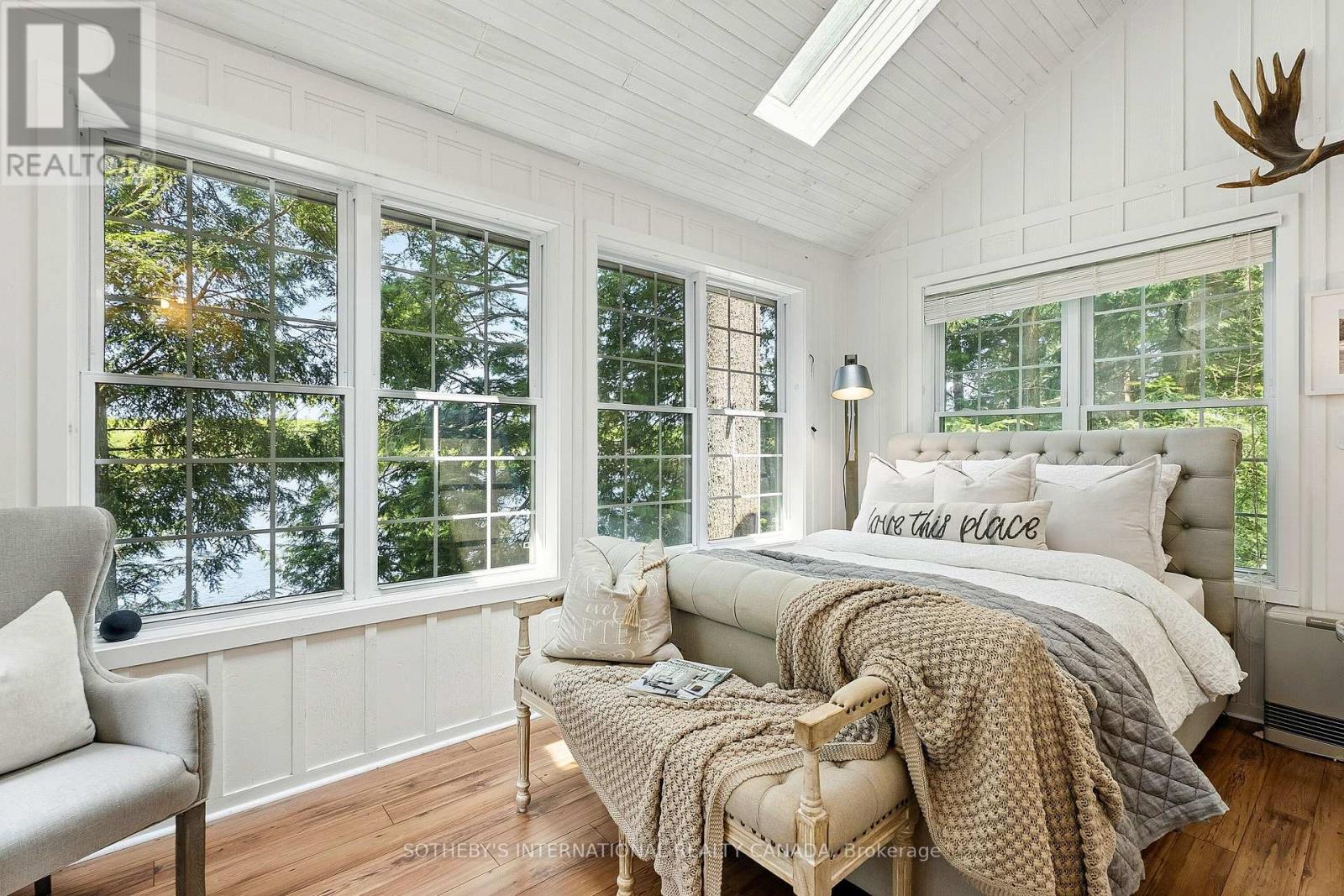 Moore Lake Renovated Lakefront Retreat with Sunset Views. Exquisite west-facing lakefront property on beautiful MooreLake, just two hours from the GTA. This private, maturely treed lot offers 154 feet of shoreline and spectacular sunset views, with year-round access at the end of a quiet cul-de-sac. Extensively renovated, the charming 1.5-storey cottage has been transformed into a refined four season retreat, blending modern comforts with rustic character. Inside, soaring cathedral pine ceilings, custom built-ins, and a sun-filled open concept layout create a warm and welcoming atmosphere. The sunroom flows seamlessly to the expansive lake-facing deck, offering the perfect space for entertaining or relaxing. The fully updated kitchen and bathrooms, stylish lighting, and high-quality finishes through out make this home move-in ready. The lower level offers flexible space with a walkout ideal for a third bedroom, studio, or workshop. Step outside to enjoy curated outdoor living at its best: a new outdoor kitchen, professionally landscaped stone pathways, a lakeside firepit, and 470 square feet of decking plus an extensive dock system ideal for swimming and boating. A detached double garage, adorable bunkie, and charming children's playhouse complete the package. Whether you are seeking a peaceful family getaway or an entertainer's dream, this turnkey property delivers timeless lakefront living with all the modern upgrades. (id:61423)