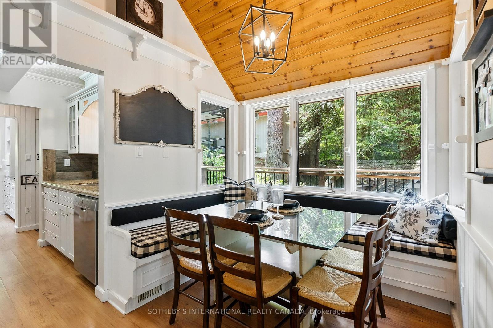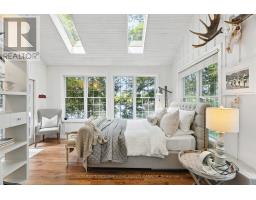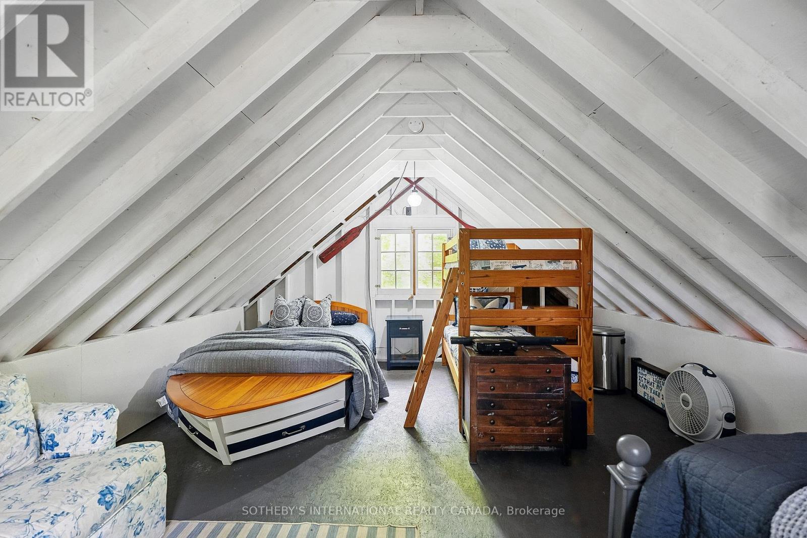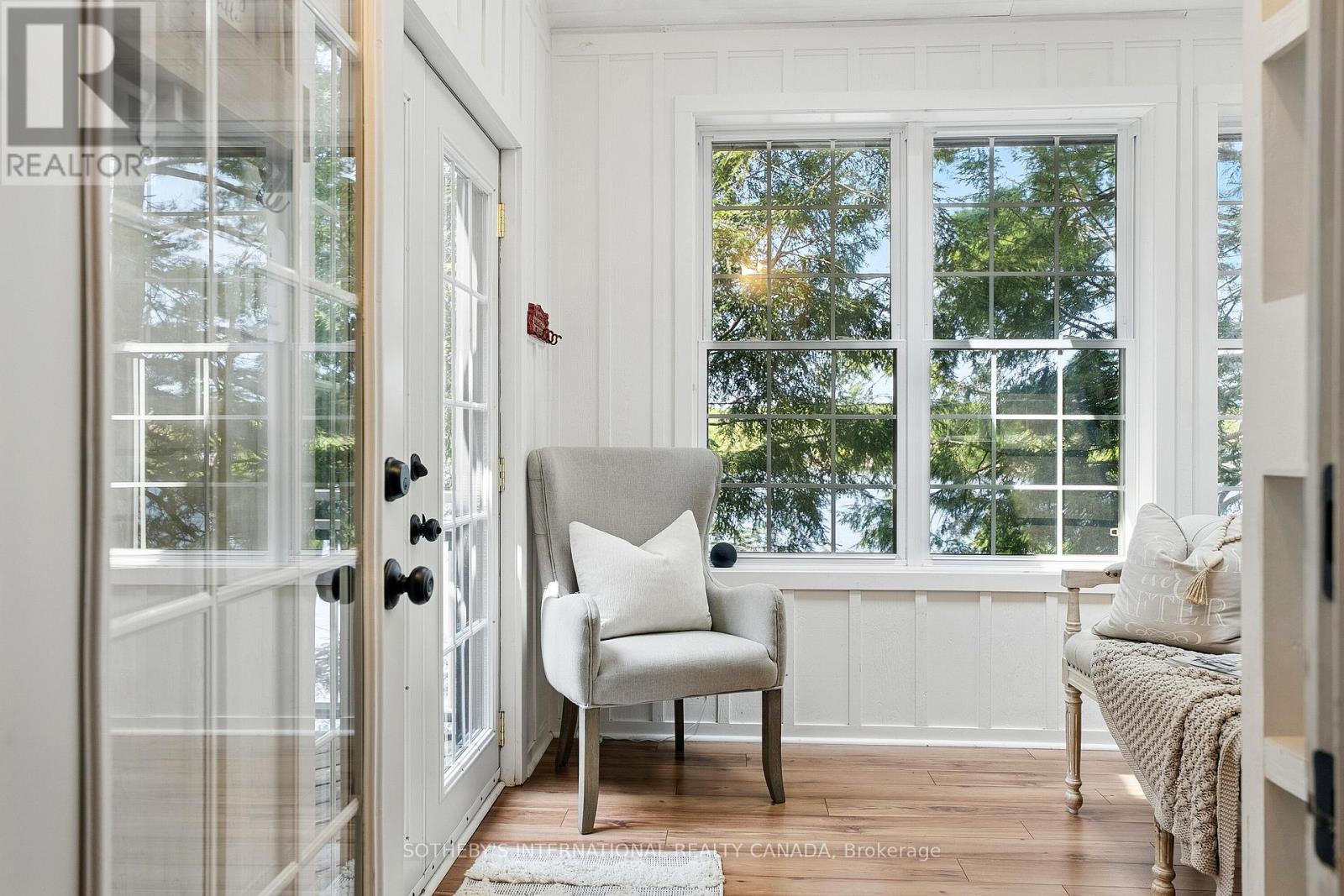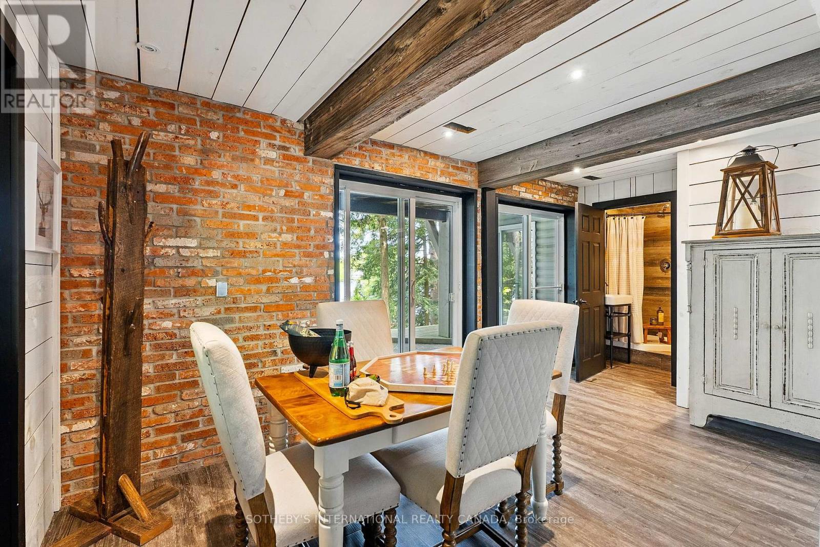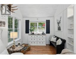 Moore Lake Renovated Lakefront Retreat with Sunset Views. Exquisite west-facing lakefront property on beautiful MooreLake, just two hours from the GTA. This private, maturely treed lot offers 154 feet of shoreline and spectacular sunset views, with year-round access at the end of a quiet cul-de-sac. Extensively renovated, the charming 1.5-storey cottage has been transformed into a refined four season retreat, blending modern comforts with rustic character. Inside, soaring cathedral pine ceilings, custom built-ins, and a sun-filled open concept layout create a warm and welcoming atmosphere. The sunroom flows seamlessly to the expansive lake-facing deck, offering the perfect space for entertaining or relaxing. The fully updated kitchen and bathrooms, stylish lighting, and high-quality finishes through out make this home move-in ready. The lower level offers flexible space with a walkout ideal for a third bedroom, studio, or workshop. Step outside to enjoy curated outdoor living at its best: a new outdoor kitchen, professionally landscaped stone pathways, a lakeside firepit, and 470 square feet of decking plus an extensive dock system ideal for swimming and boating. A detached double garage, adorable bunkie, and charming children's playhouse complete the package. Whether you are seeking a peaceful family getaway or an entertainer's dream, this turnkey property delivers timeless lakefront living with all the modern upgrades. (id:61423)