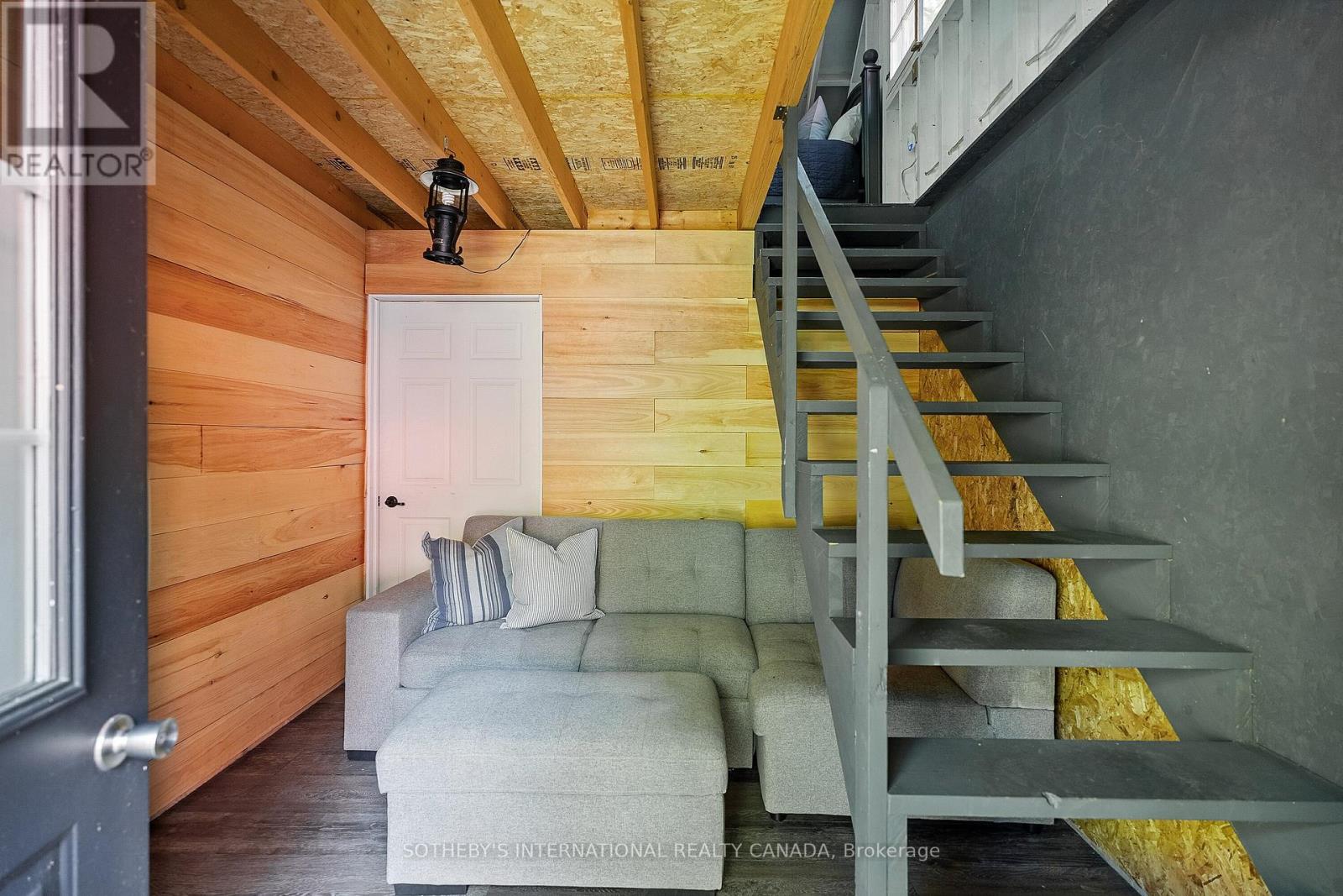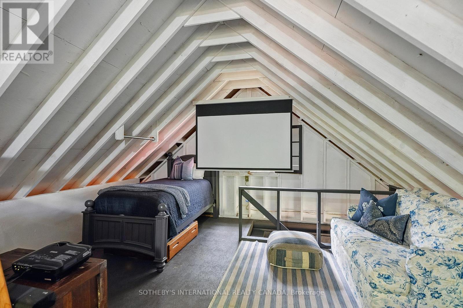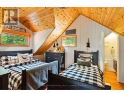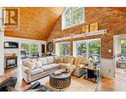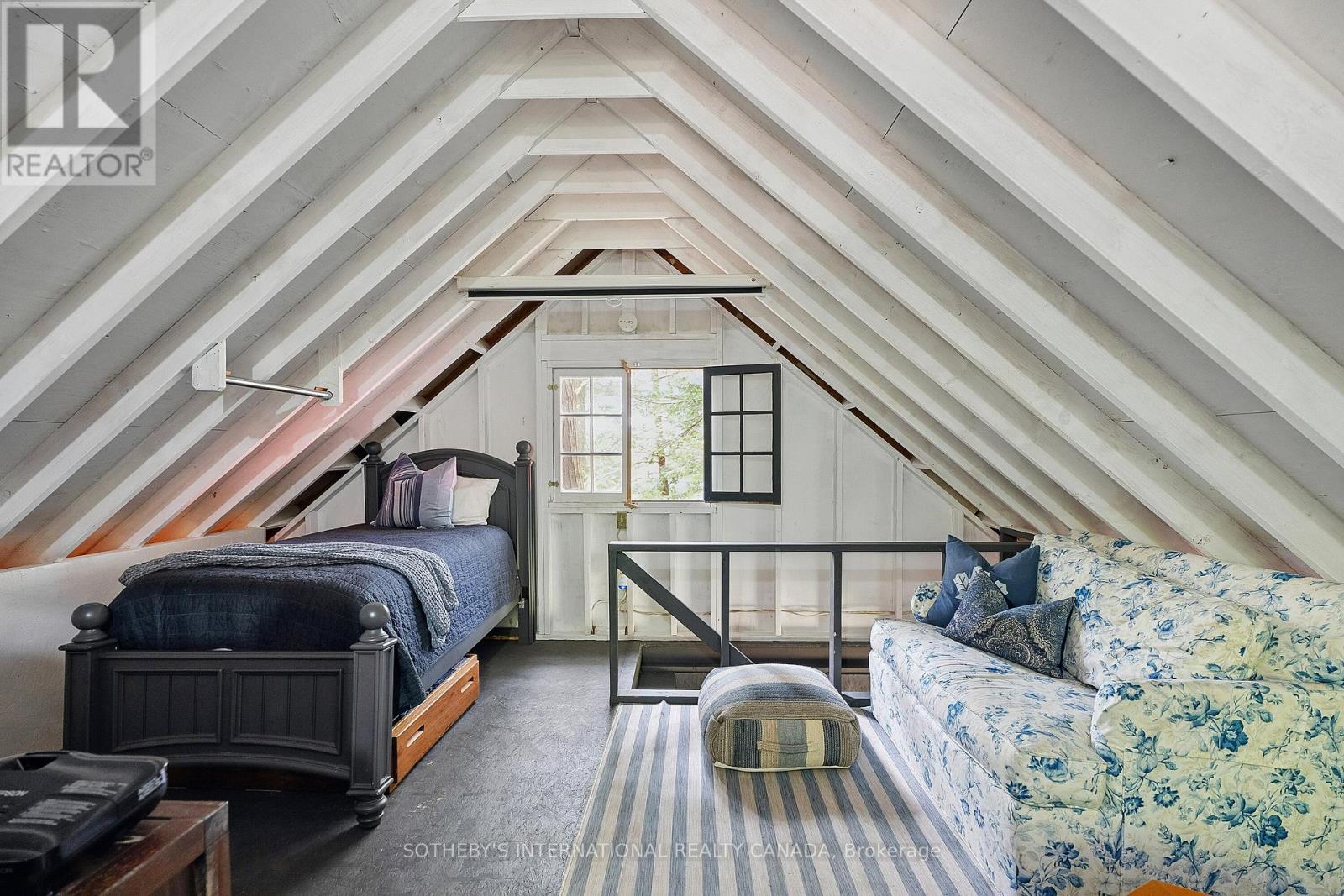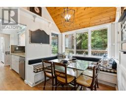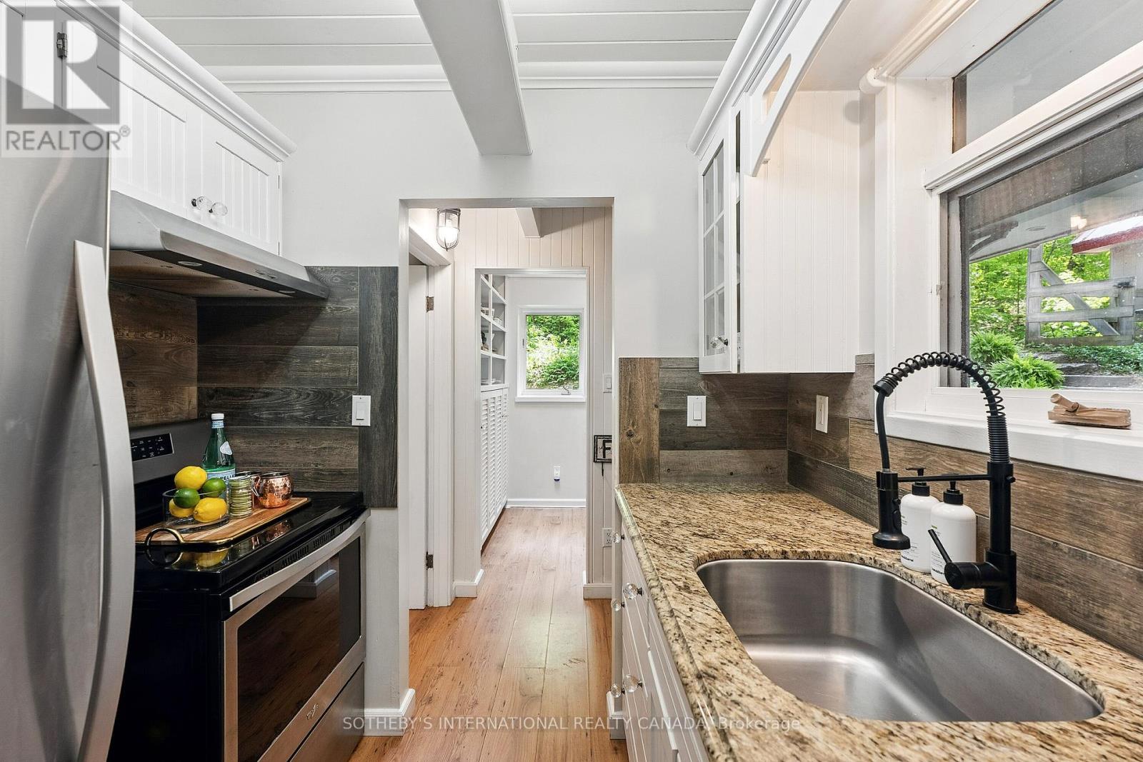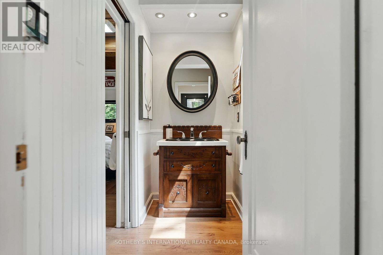 Moore Lake Renovated Lakefront Retreat with Sunset Views. Exquisite west-facing lakefront property on beautiful MooreLake, just two hours from the GTA. This private, maturely treed lot offers 154 feet of shoreline and spectacular sunset views, with year-round access at the end of a quiet cul-de-sac. Extensively renovated, the charming 1.5-storey cottage has been transformed into a refined four season retreat, blending modern comforts with rustic character. Inside, soaring cathedral pine ceilings, custom built-ins, and a sun-filled open concept layout create a warm and welcoming atmosphere. The sunroom flows seamlessly to the expansive lake-facing deck, offering the perfect space for entertaining or relaxing. The fully updated kitchen and bathrooms, stylish lighting, and high-quality finishes through out make this home move-in ready. The lower level offers flexible space with a walkout ideal for a third bedroom, studio, or workshop. Step outside to enjoy curated outdoor living at its best: a new outdoor kitchen, professionally landscaped stone pathways, a lakeside firepit, and 470 square feet of decking plus an extensive dock system ideal for swimming and boating. A detached double garage, adorable bunkie, and charming children's playhouse complete the package. Whether you are seeking a peaceful family getaway or an entertainer's dream, this turnkey property delivers timeless lakefront living with all the modern upgrades. (id:61423)