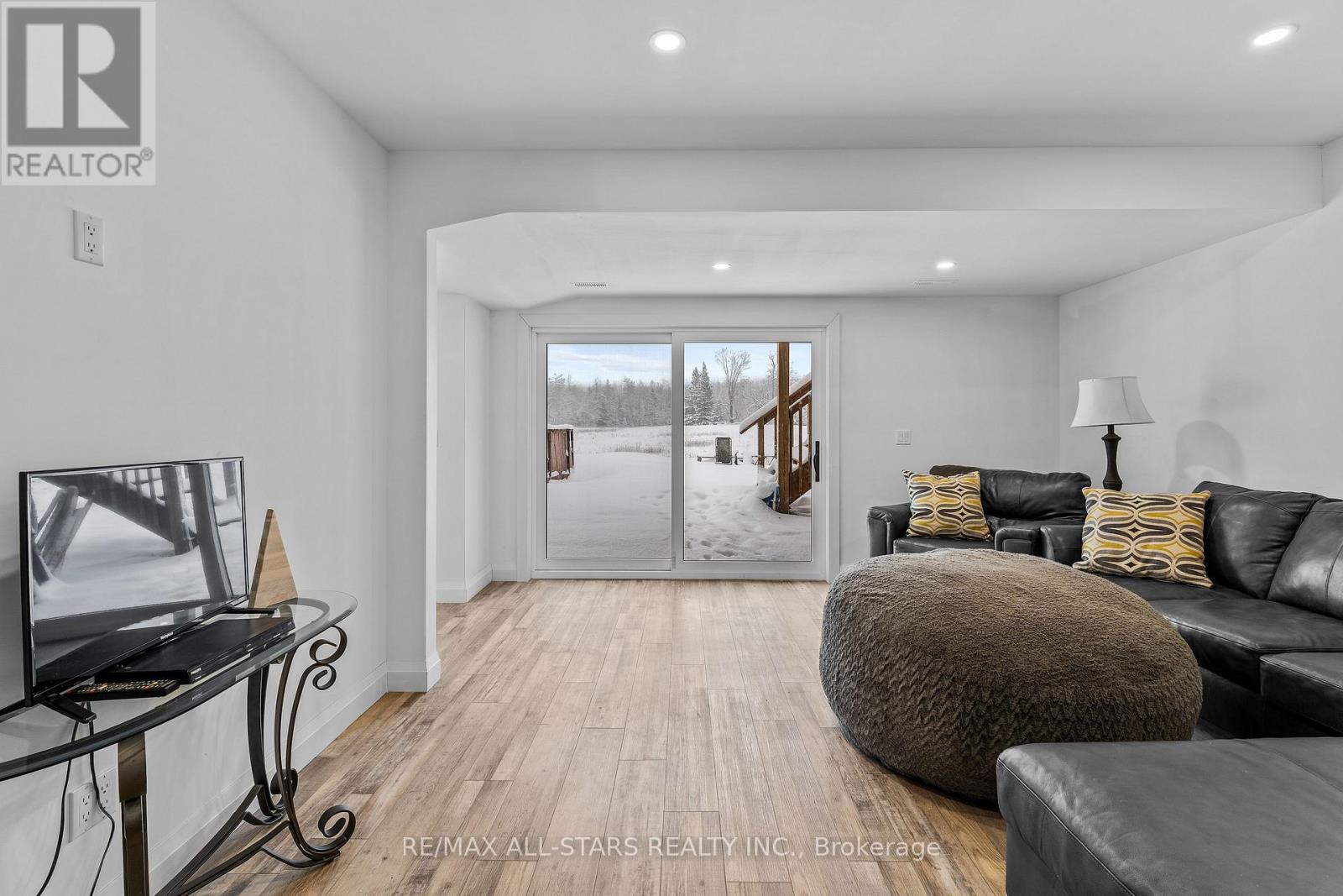 Beautifully built in 2023, this modern bungalow offers stylish living and a detached 1.5-car garage. Step into the welcoming front foyer, where heated tile floors extend seamlessly into the kitchen for added comfort and luxury. The bright living room features a cozy propane fireplace, creating a warm and inviting space to relax. The open-concept kitchen and dining area are perfect for entertaining, complete with a sleek island, ample counter space. The main floor also includes a convenient laundry room, a 2-piece bath, and a spacious primary bedroom with a walk-in closet and a luxurious 5-piece en-suite featuring a soaker tub. The fully finished walkout basement provides exceptional additional living space, offering a large recreation room, a utility room, two generous bedrooms-each with its own walk-in closet-and a 3-piece bath. Outdoors, enjoy a large deck overlooking the above-ground pool, built-in BBQ, fire pit, and a charming chicken coop. Located close to ATV trails, this property is ideal for outdoor enthusiasts seeking both comfort and adventure. (id:61423)