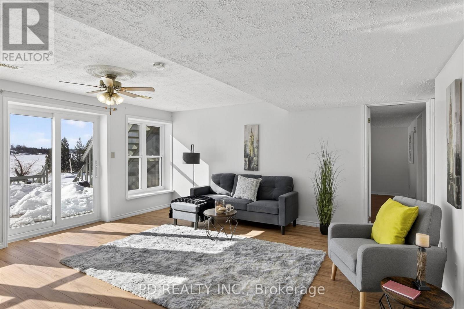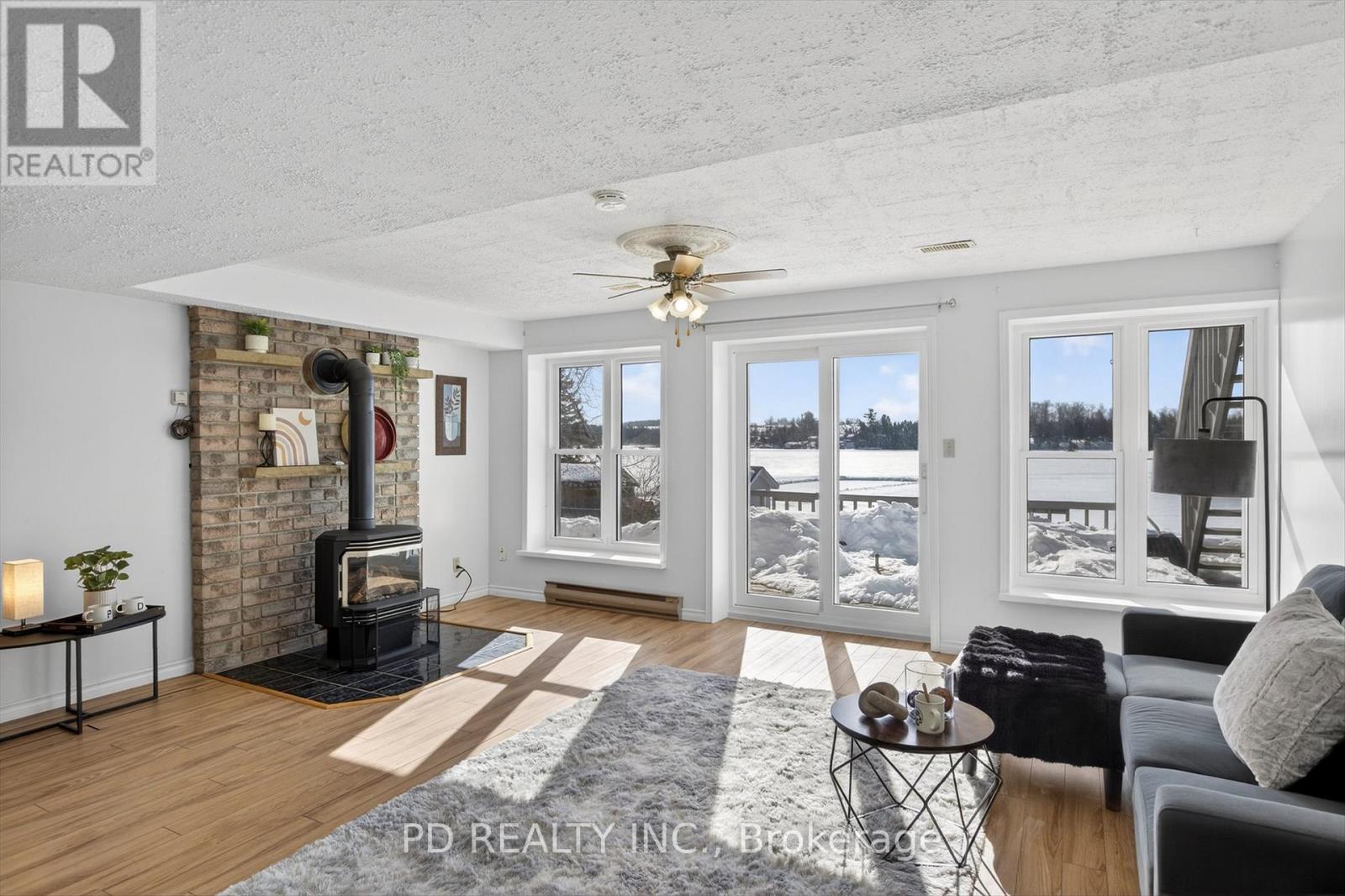 This 3+1 bedroom, 3 bathroom raised bungalow offers peaceful waterfront living on just under half an acre, with 122 feet of frontage along the picturesque Pigeon River, part of the renowned Trent-Severn Waterway. Step inside to a spacious living room filled with natural light, and a dining room with walkout to a large deck overlooking the water, offering breathtaking panoramic views. The generously sized eat in kitchen also enjoys beautiful waterfront vistas. Three well proportioned bedrooms and two full bathrooms complete the main level. The fully finished lower level is equally impressive, featuring a large recreation room with a wall of windows and walkout to the waterfront. A separate entrance from the driveway provides a convenient mudroom space. You will also find a spacious fourth bedroom with walkout to a covered deck, a huge three piece bathroom, laundry room, and direct access to the built in two car garage. Outside, enjoy a spacious deck perfect for relaxing or entertaining while taking in the serene water views. Just a short boat ride away is the popular sandbar, known for its excellent swimming. With direct access to the Trent Severn system, this property is perfect for boating, fishing, entertaining, or simply embracing the tranquility of waterfront living. This home combines comfort, privacy, and convenience in an exceptional waterfront setting. It is just waiting for you to make it your own. (id:61423)