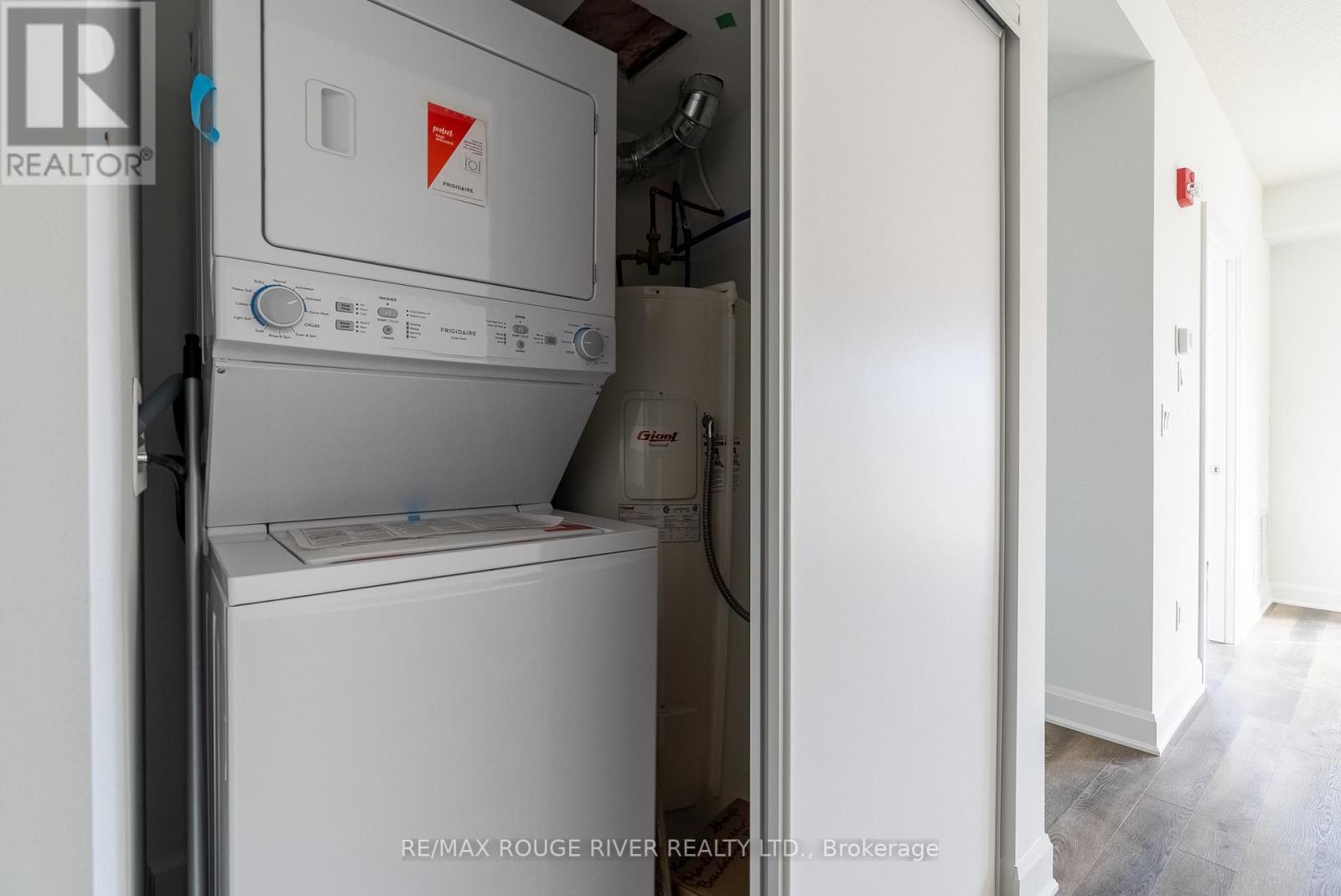 Welcome to luxury lakeside living in this stunning 1-bedroom plus den condo apartment at the prestigious Harbourview Grand development overlooking beautiful Lake Ontario. Modern elegance meets waterfront serenity in this bright and spacious unit featuring soaring 9-foot ceilings that create an airy, open atmosphere throughout. The thoughtfully designed layout maximizes both living space and natural light from the southern exposure, while the primary bedroom boasts a luxurious 4-piece en-suite bathroom for ultimate privacy and convenience. The versatile den provides the perfect space for a home office or can easily accommodate a single bed for guests, with additional convenience offered by a powder room for entertaining. Step out onto your private terrace balcony where you can sip your morning coffee while taking in the breathtaking lake views and fresh Ontario air, watching sailboats drift by and enjoying spectacular sunrises over the water, all enhanced by central air conditioning to ensure year-round comfort. The building offers exceptional amenities including fitness facilities and party room, and is pet-friendly with restrictions, situated in the desirable Newcastle neighbourhood of Clarington with easy access to Highway 401, local shopping, top-rated schools including Clarke High School and Newcastle Elementary, parks, and recreational facilities. This represents the perfect opportunity to own a piece of waterfront paradise with low maintenance fees including utilities, plus one parking spot included, all in a modern building that's less than 5 years old. Exceptional value in today's market for those seeking the ultimate combination of lakefront lifestyle, modern amenities, and convenient location in Durham Region's most sought-after waterfront community (id:61423)