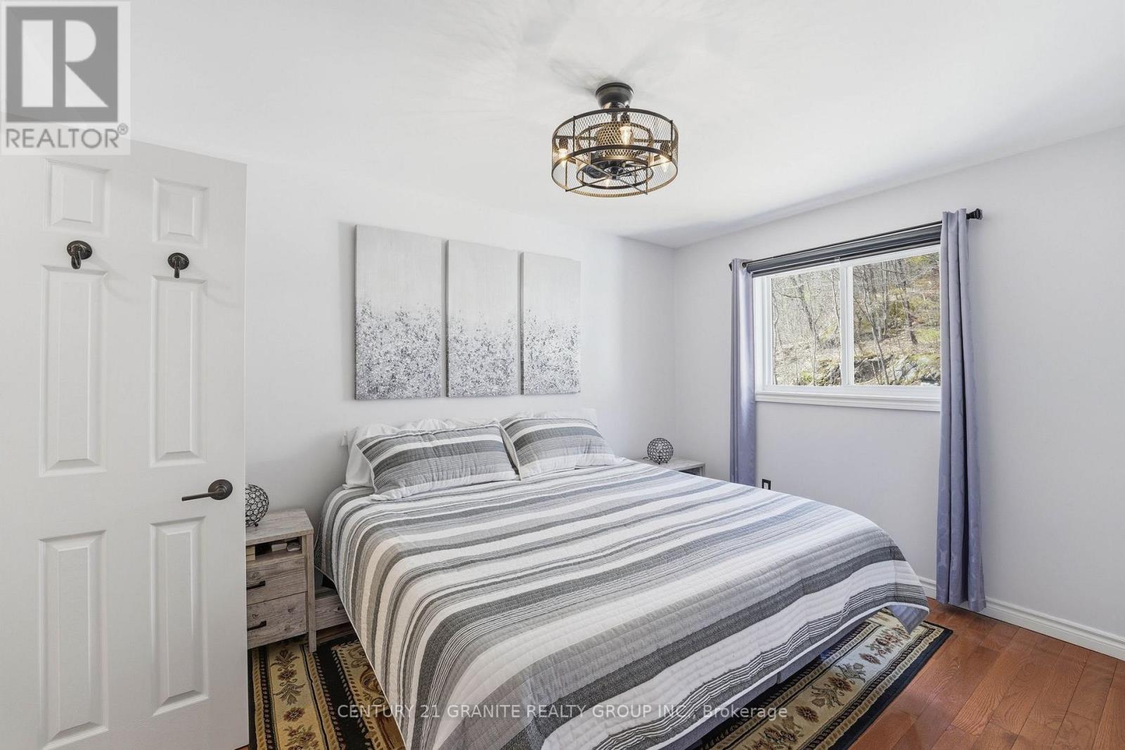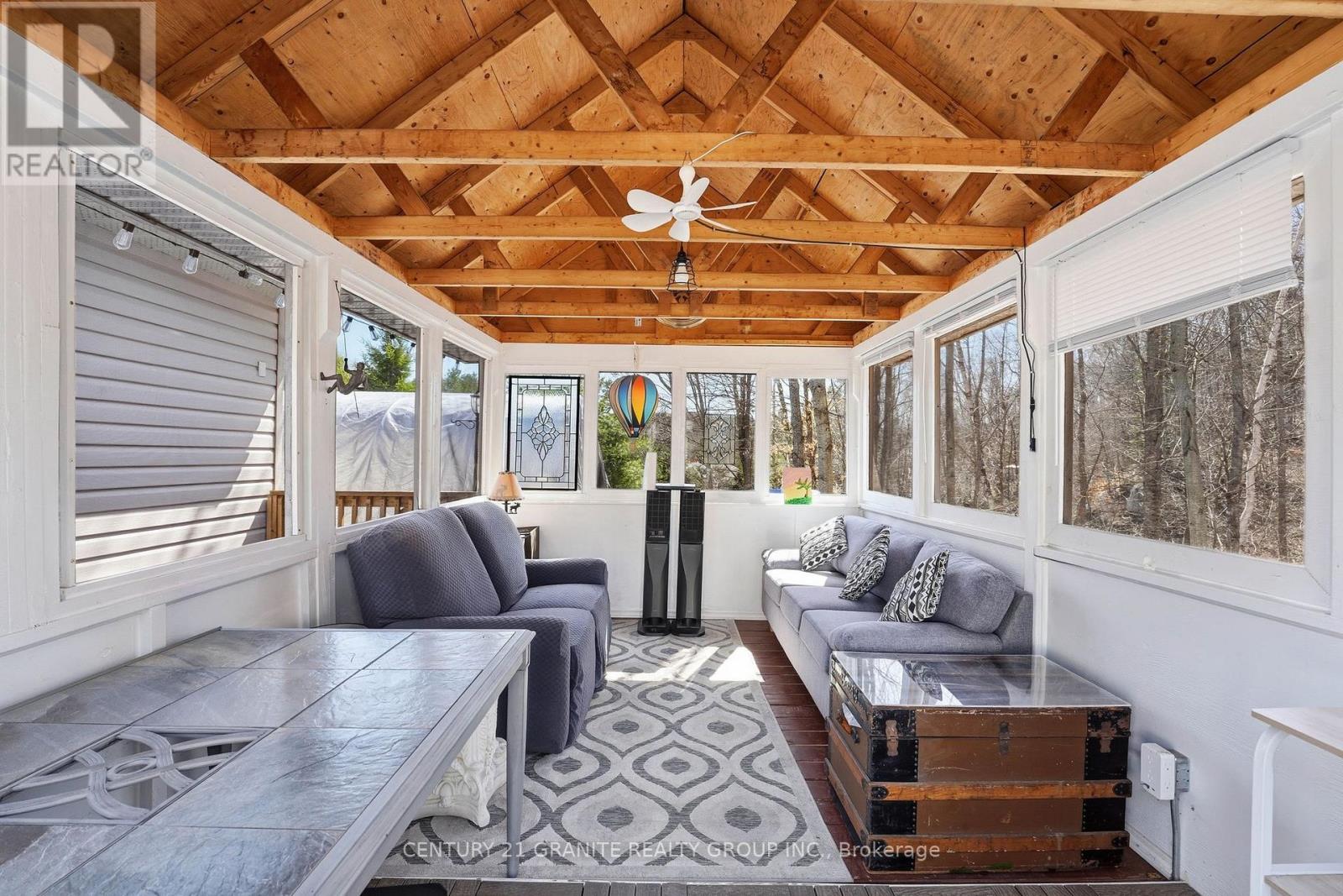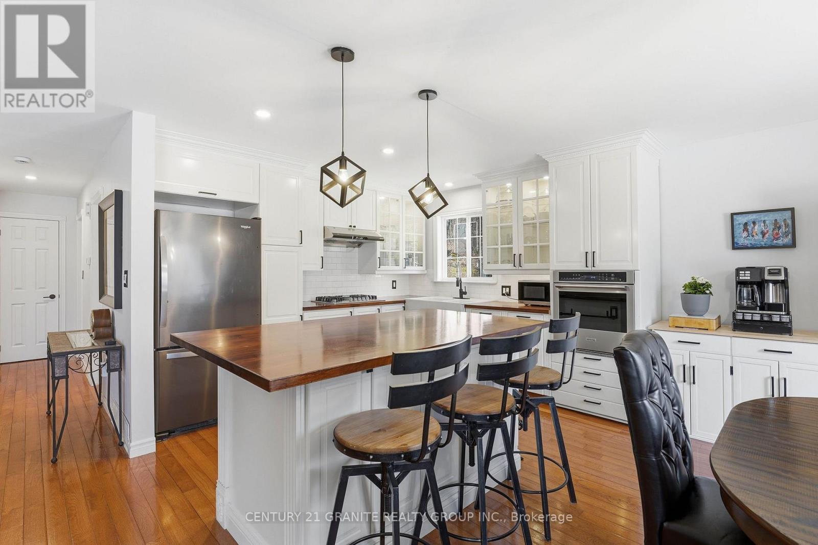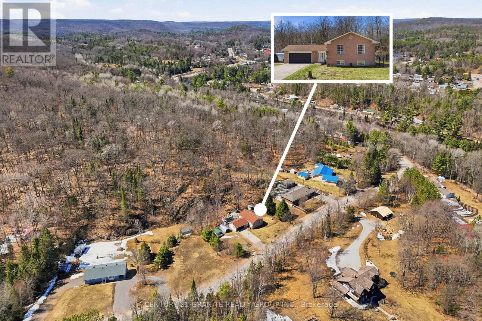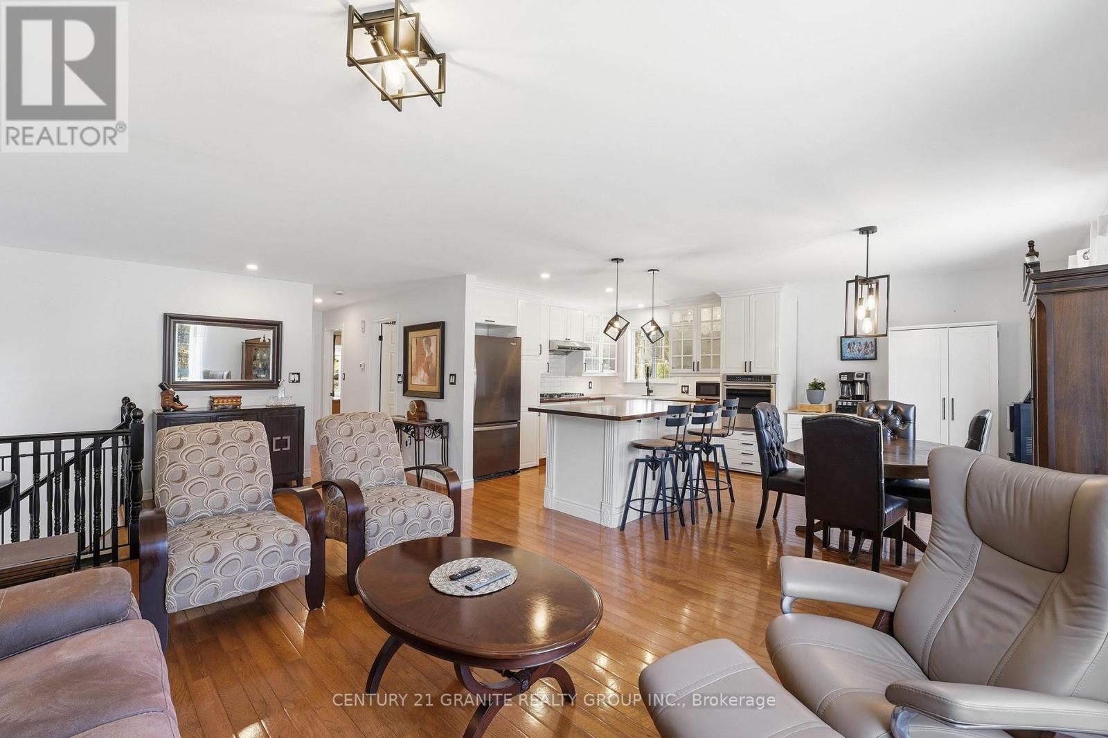 Positioned just minutes from Bancroft's amenities, this custom built brick side split offers a strategic combination of durability, efficiency, and turnkey living. Built in 2006 to R2000 efficiency standards, the home delivers low operating costs and long term performance. Offering over 2,000 sq. ft. of finished living space, this 4 bedroom, 3 bathroom home is designed with functionality in mind. The open concept living, dining, and kitchen area is bright and cohesive, featuring an updated kitchen with stainless steel appliances and strong flow for everyday living and entertaining. Main floor laundry adds practical convenience. The interior presents as exceptionally well maintained, supported by forced air propane heating and central air conditioning. The primary bedroom includes a private ensuite, while a standout feature is the beautiful sunroom off the rear bedroom, creating a quiet, light filled retreat. Extensive upgrades have been completed throughout, ensuring the property is truly move-in ready. Set on a municipally maintained road, the home offers excellent access, a poured concrete driveway, and an attached double car garage, reinforcing both curb appeal and functionality. Outdoors, the property delivers a highly private setting with a striking backdrop of hardwood trees, exposed granite outcropping and over 1,200 sq. ft. of terraced, cantilevered decking, designed for elevated outdoor living and seamless entertaining. Multiple sitting areas invite morning coffee, evening dining, and quiet reflection, all immersed in a natural, shielded landscape. A screened-in gazebo extends seasonal use in comfort, while the dog run, bunkie, and storage sheds add both flexibility and function to this thoughtfully curated outdoor environment. Located near the Hastings Heritage Trail, this property supports four-season recreation in a quiet country setting just steps from town. A well executed, energy efficient home offering space, privacy, and a true turnkey opportunity. (id:61423)