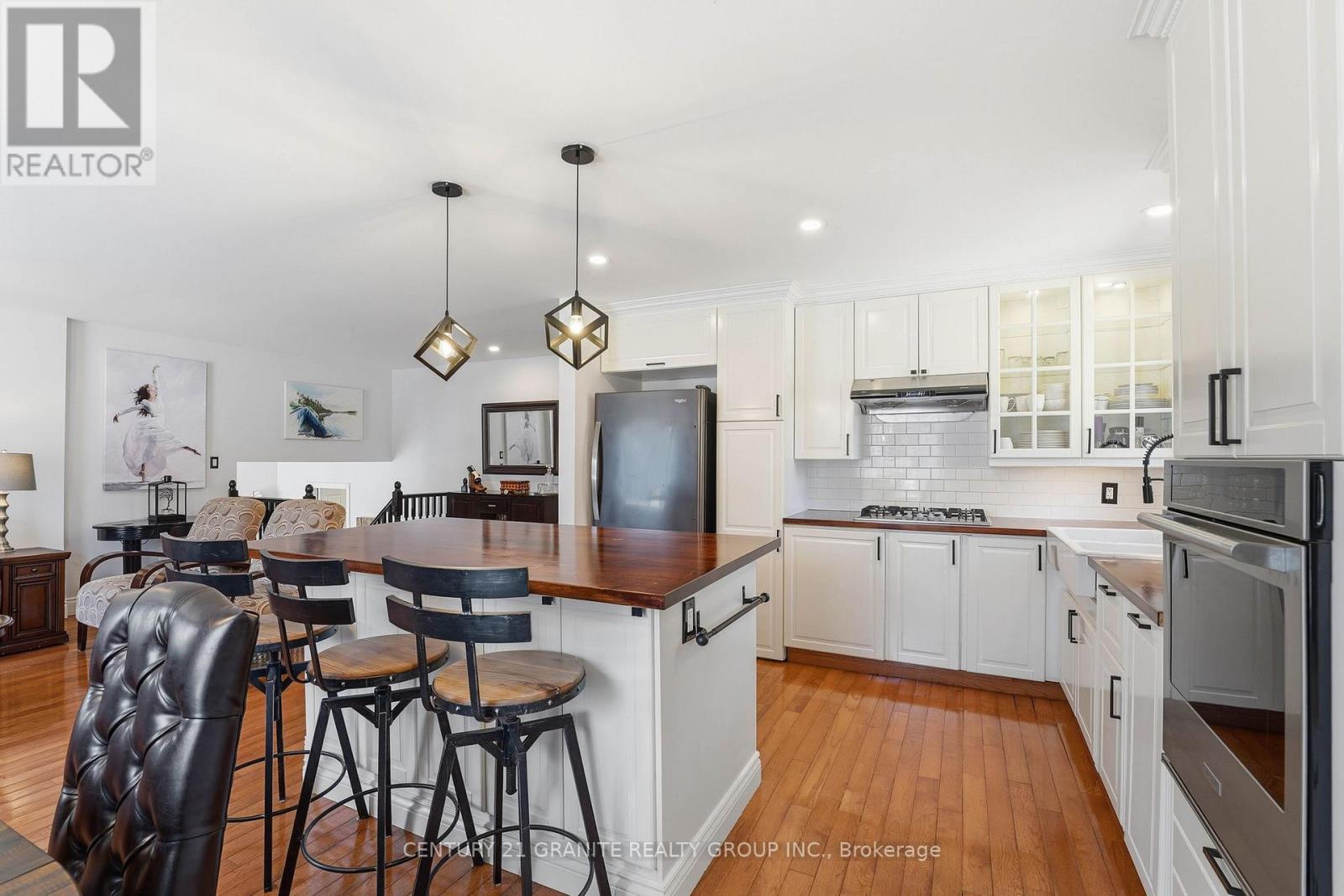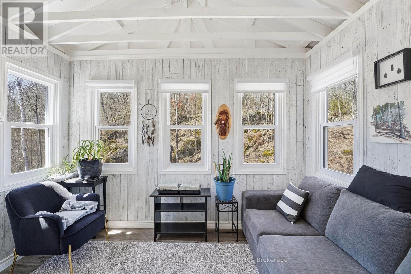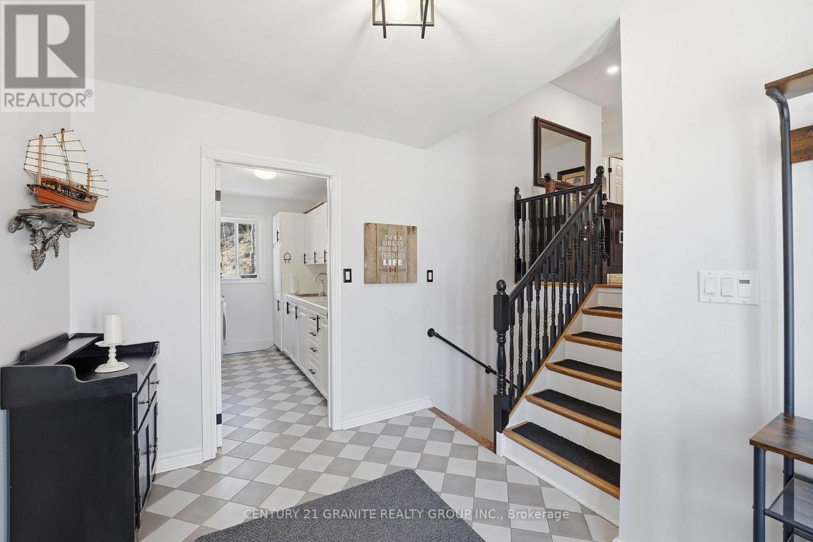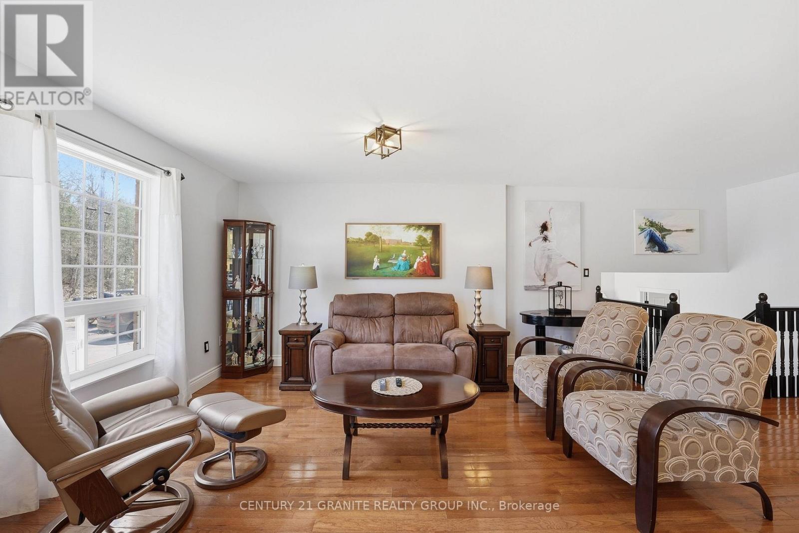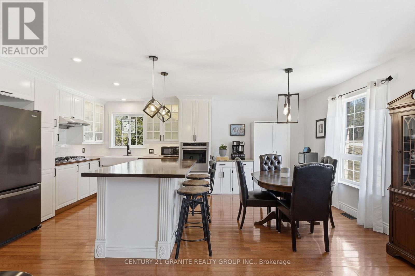 Positioned just minutes from Bancroft's amenities, this custom built brick side split offers a strategic combination of durability, efficiency, and turnkey living. Built in 2006 to R2000 efficiency standards, the home delivers low operating costs and long term performance. Offering over 2,000 sq. ft. of finished living space, this 4 bedroom, 3 bathroom home is designed with functionality in mind. The open concept living, dining, and kitchen area is bright and cohesive, featuring an updated kitchen with stainless steel appliances and strong flow for everyday living and entertaining. Main floor laundry adds practical convenience. The interior presents as exceptionally well maintained, supported by forced air propane heating and central air conditioning. The primary bedroom includes a private ensuite, while a standout feature is the beautiful sunroom off the rear bedroom, creating a quiet, light filled retreat. Extensive upgrades have been completed throughout, ensuring the property is truly move-in ready. Set on a municipally maintained road, the home offers excellent access, a poured concrete driveway, and an attached double car garage, reinforcing both curb appeal and functionality. Outdoors, the property delivers a highly private setting with a striking backdrop of hardwood trees, exposed granite outcropping and over 1,200 sq. ft. of terraced, cantilevered decking, designed for elevated outdoor living and seamless entertaining. Multiple sitting areas invite morning coffee, evening dining, and quiet reflection, all immersed in a natural, shielded landscape. A screened-in gazebo extends seasonal use in comfort, while the dog run, bunkie, and storage sheds add both flexibility and function to this thoughtfully curated outdoor environment. Located near the Hastings Heritage Trail, this property supports four-season recreation in a quiet country setting just steps from town. A well executed, energy efficient home offering space, privacy, and a true turnkey opportunity. (id:61423)