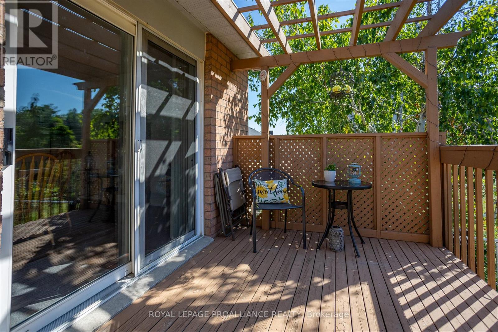 This fabulous location townhouse, backs onto a ravine/park/greenspace and no neighbors' behind. Lovely sought after north/west end area of Peterborough. This 2 bedroom home has attached garage and newly finished exterior front sitting area for morning coffee. Enter large open foyer, new flooring in both bedrooms, spacious Primary bedroom with walk-in closet and bright 2nd bedroom, both are next to the 4pc bath. Kitchen offers mega cabinets with many drawers and plenty of counter space, new microwave/exhaust fan and sink faucets. Large laundry closet off hallway for your main floor convenience. Amazing year round views from open concept living and dining area with patio doors to walk out to pergola, sit and enjoy the privacy on your rear deck. Basement has rough-in for 2nd bath and high ceilings to finish to your liking. All 5 appliances are included. (id:61423)
