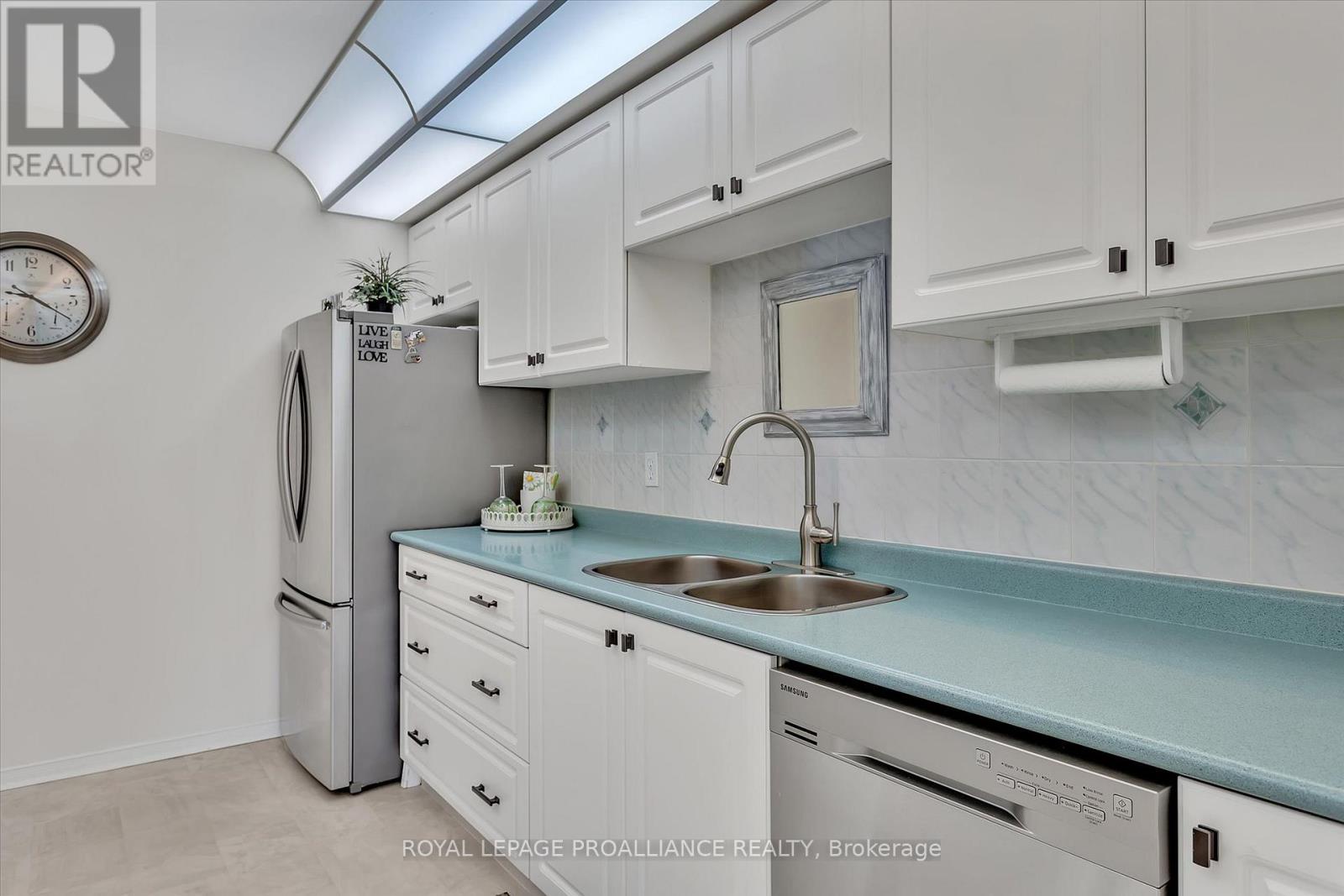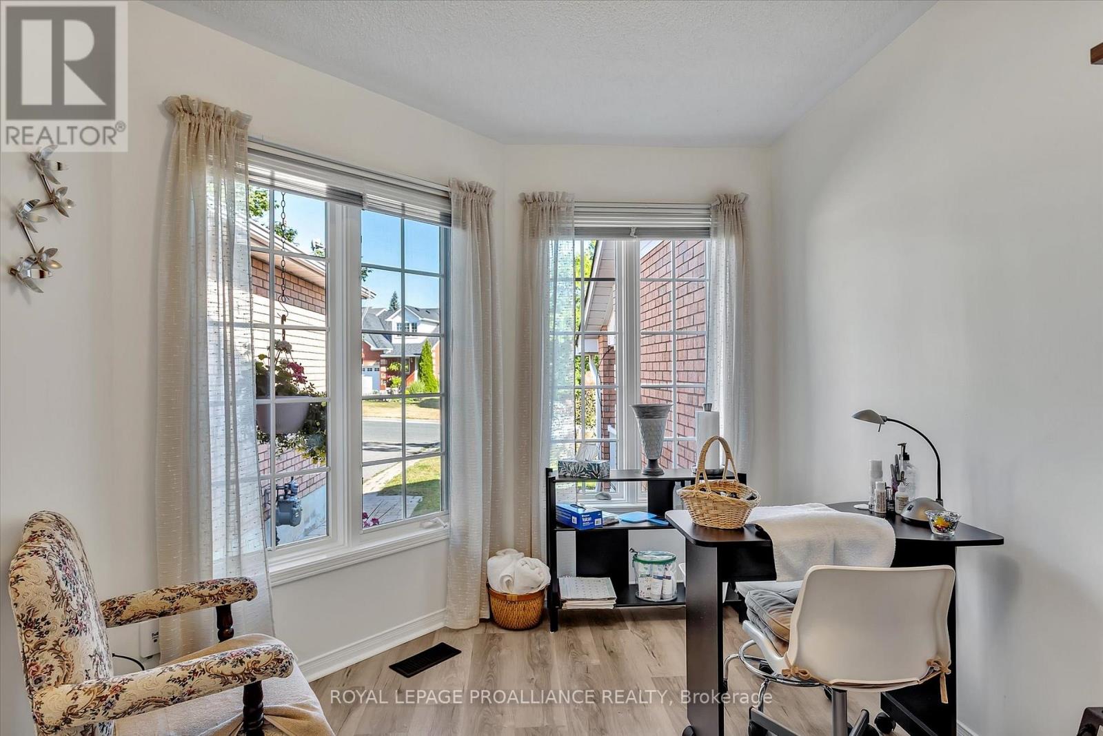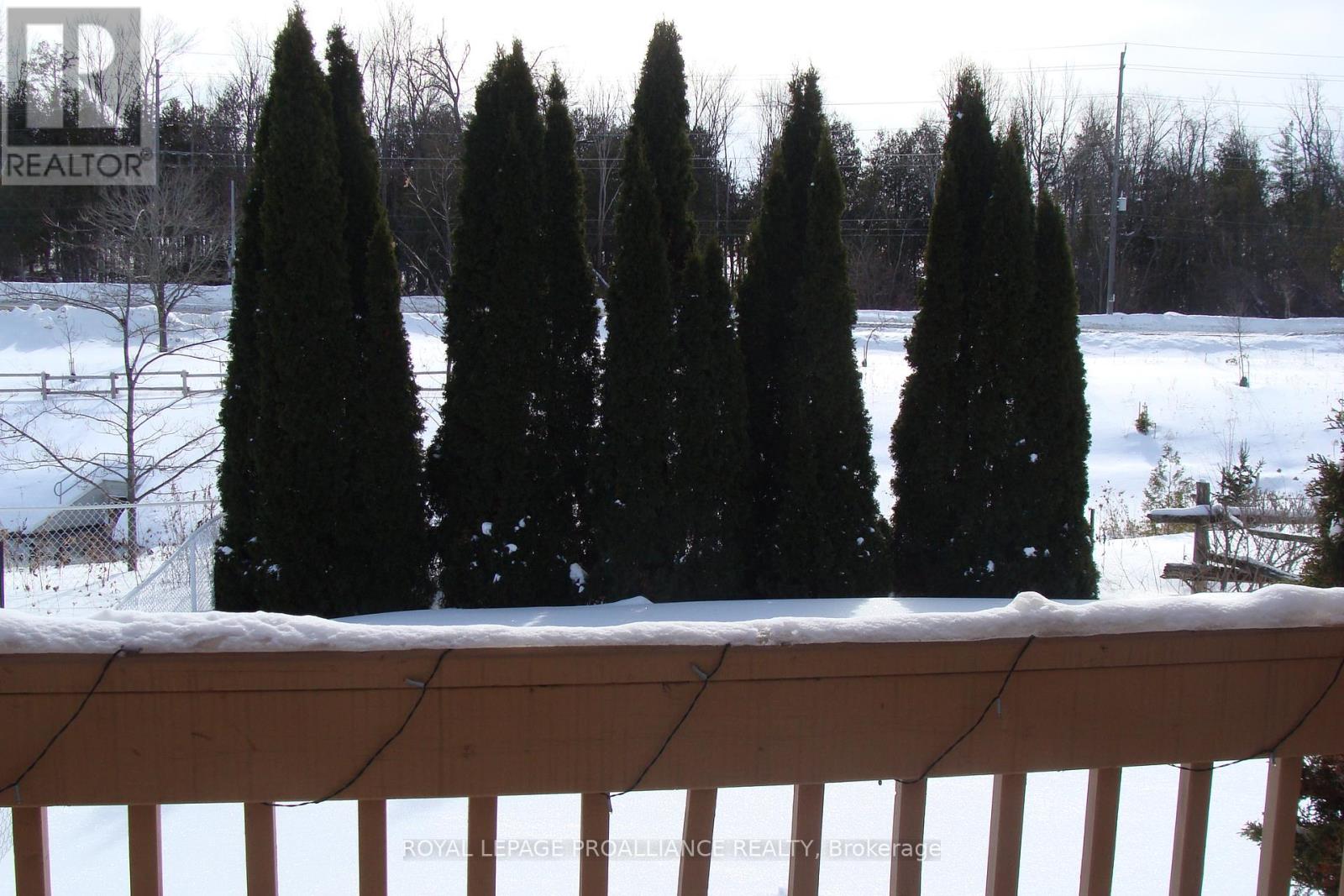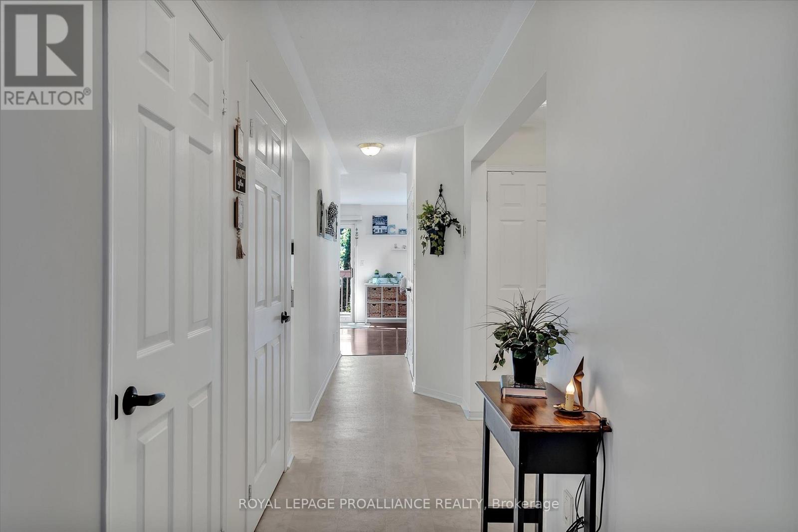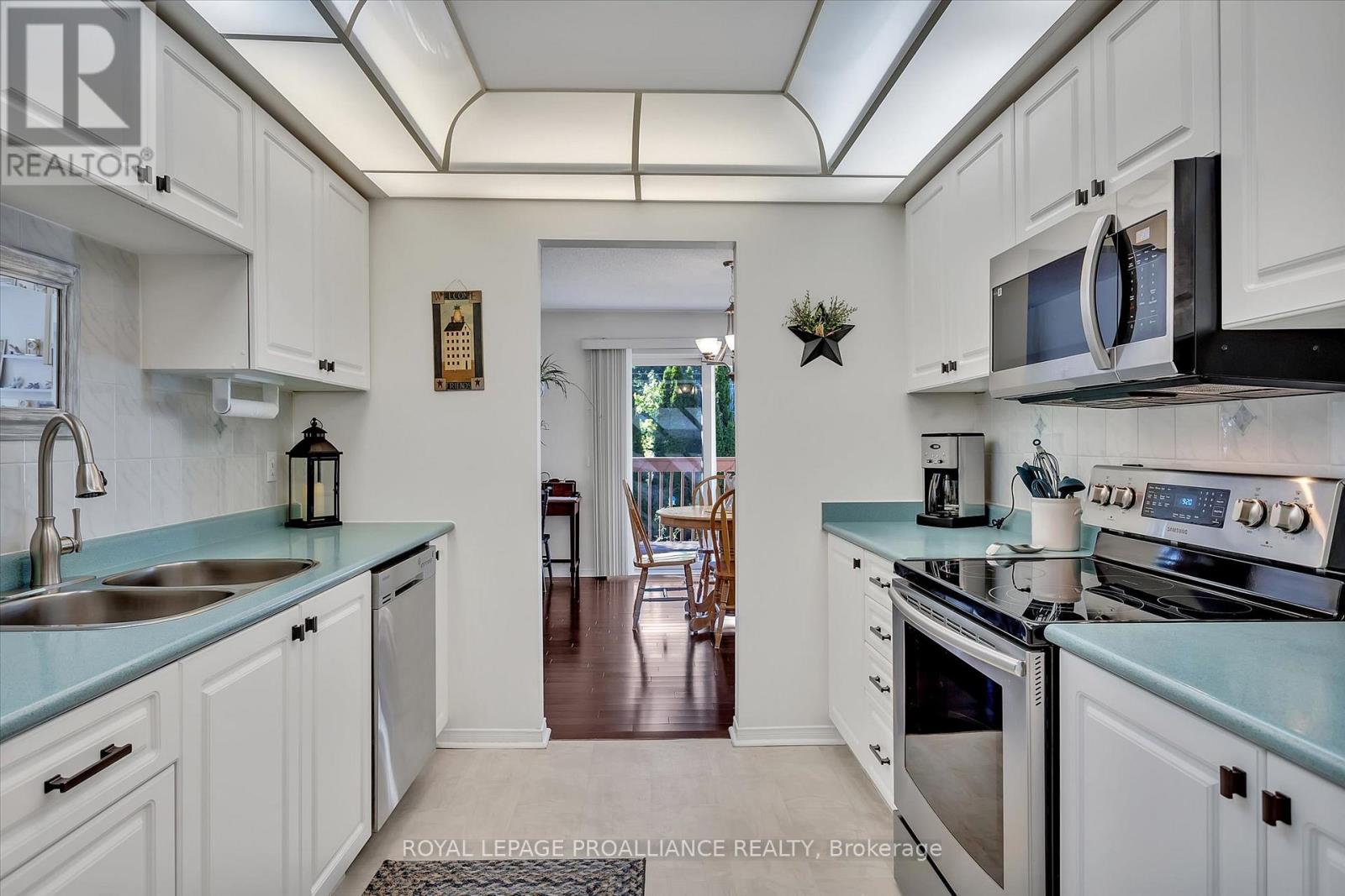 This fabulous location townhouse, backs onto a ravine/park/greenspace and no neighbors' behind. Lovely sought after north/west end area of Peterborough. This 2 bedroom home has attached garage and newly finished exterior front sitting area for morning coffee. Enter large open foyer, new flooring in both bedrooms, spacious Primary bedroom with walk-in closet and bright 2nd bedroom, both are next to the 4pc bath. Kitchen offers mega cabinets with many drawers and plenty of counter space, new microwave/exhaust fan and sink faucets. Large laundry closet off hallway for your main floor convenience. Amazing year round views from open concept living and dining area with patio doors to walk out to pergola, sit and enjoy the privacy on your rear deck. Basement has rough-in for 2nd bath and high ceilings to finish to your liking. All 5 appliances are included. (id:61423)