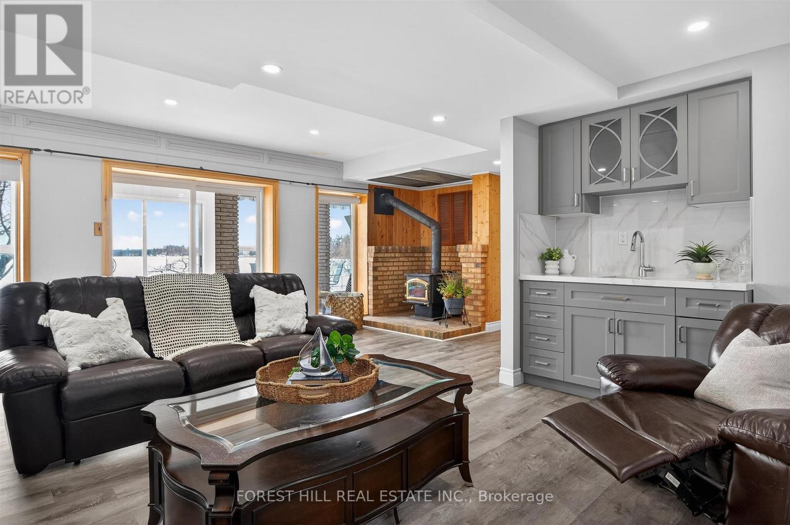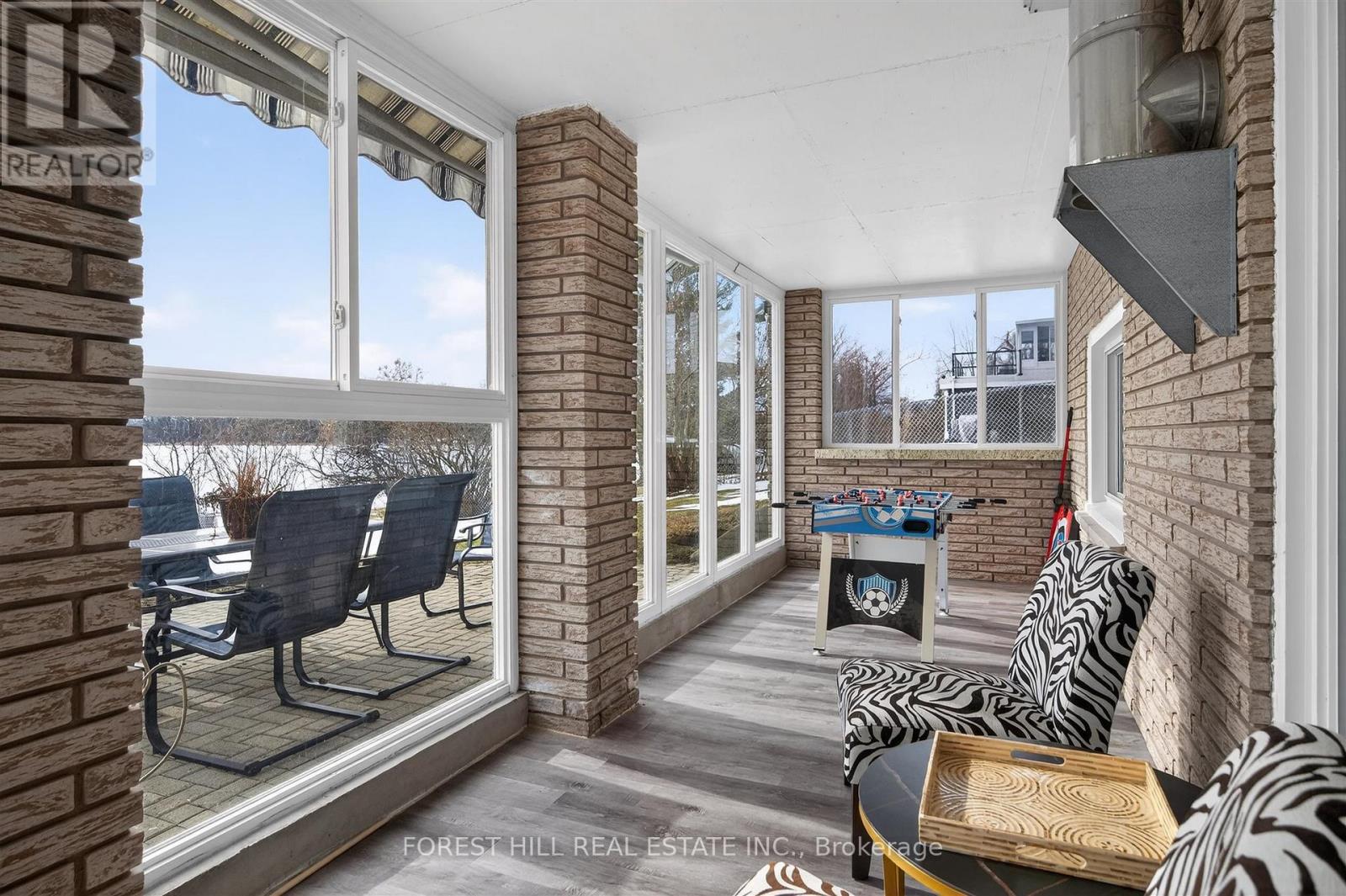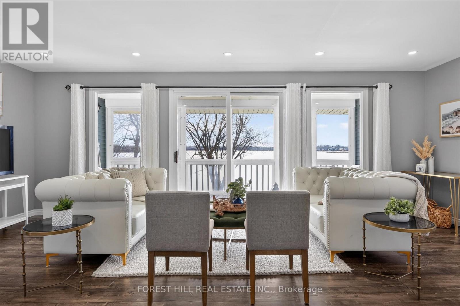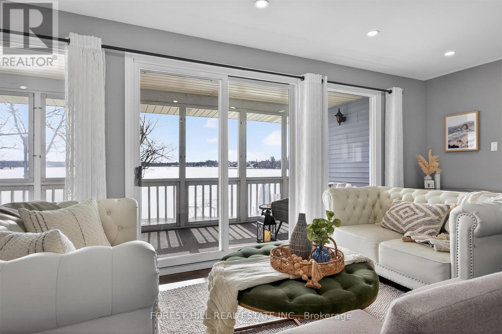 This Stunning 4 Season Lake house is light filled and located on Pristine Buckhorn Lake in the sweet spot where Chemong and Pigeon lake Channel Changes are close by. Walk into this tiled grand foyer and take notice of the Panoramic views featured throughout the Expansive Floor to Ceiling Windows from every room. The interior has many delightful designer finishes throughout incl. a stunning eat in kitchen with white Custom Cabinetry, expansive stone counters, stainless steel appliances and Engineered Hardwood that runs throughout the home. 3 Spacious Bedrooms adorn the main floor as well as a walk out to the Oversized sunroom where the windows can be removed or opened to allow gentle breezes from the lake. This Sunroom is built to Enjoy wildlife, sunsets and entertain while being sheltered. The Lower Level has a cozy Family Room with high ceilings, a Wet bar with sink, cupboards and wine fridge for entertaining and a wood burning fireplace. 2 additional bedrooms are downstairs, a Laundry Room and an additional bath with stand up shower. Walk out to your Back yard oasis with 104 feet of prime waterfront with cantilever Dock system. There is a fantastic Detached garage and a separate bunkie facing the water with 2 additional beds for summer company. Lots of great landscaping and outdoor places to enjoy the views. Beautiful mature trees with great boating or driving options to dine. Boat to Buckhorn for food, ice cream or to visit some of the shops or Bobcaygeon for some of the Kawartha's best shopping or boat docking. The options are limitless when you are on the Trent Severn Waterway. This is a must See. (id:61423)