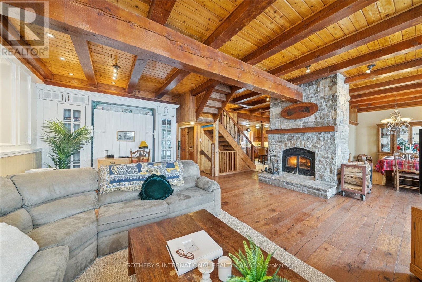 Welcome to the Edge: A Baronial Masterpiece on Little Kennisis Lake. This rare 3,700+ total square foot lake house marries rugged Canadian Shield granite with "Atmospheric Elegance." Perched dramatically with coveted North West sunset exposure, this 4-bed, 4-bath (plus Murphy bed) features soaring Cedar & Douglas Fir beams, rustic oak floors, and a magnificent floor-to-ceiling stone wood-burning fireplace.Designed for year-round entertaining, the walk-out lower level serves as a "fun & games" destination with a pool table, poker table, and hot tub. The pristine waterfront boasts deep, crystal-clear water, a 10x20 floating dock, and a large lakeside deck. A proven financial history, operating as a highly successful, licensed short-term rental with a stellar reputation and repeat clientele. This property is being sold FULLY TURN-KEY with all furnishings, decor and housewares included. Located on the prestigious Kennisis chain, minutes from a full-service marina and Haliburton Forest.The current owners enjoy the lake house for half of the year and rent it up to 180 days per year. Only 30 minutes to Sir Sam's Ski & Ride and to the Village of Haliburton for great shops, restaurants, services and Haliburton Hospital. The current owner has invested significantly in upgrades. Please refer to supporting documents for more information. Short term rental financials available upon request. (id:61423)