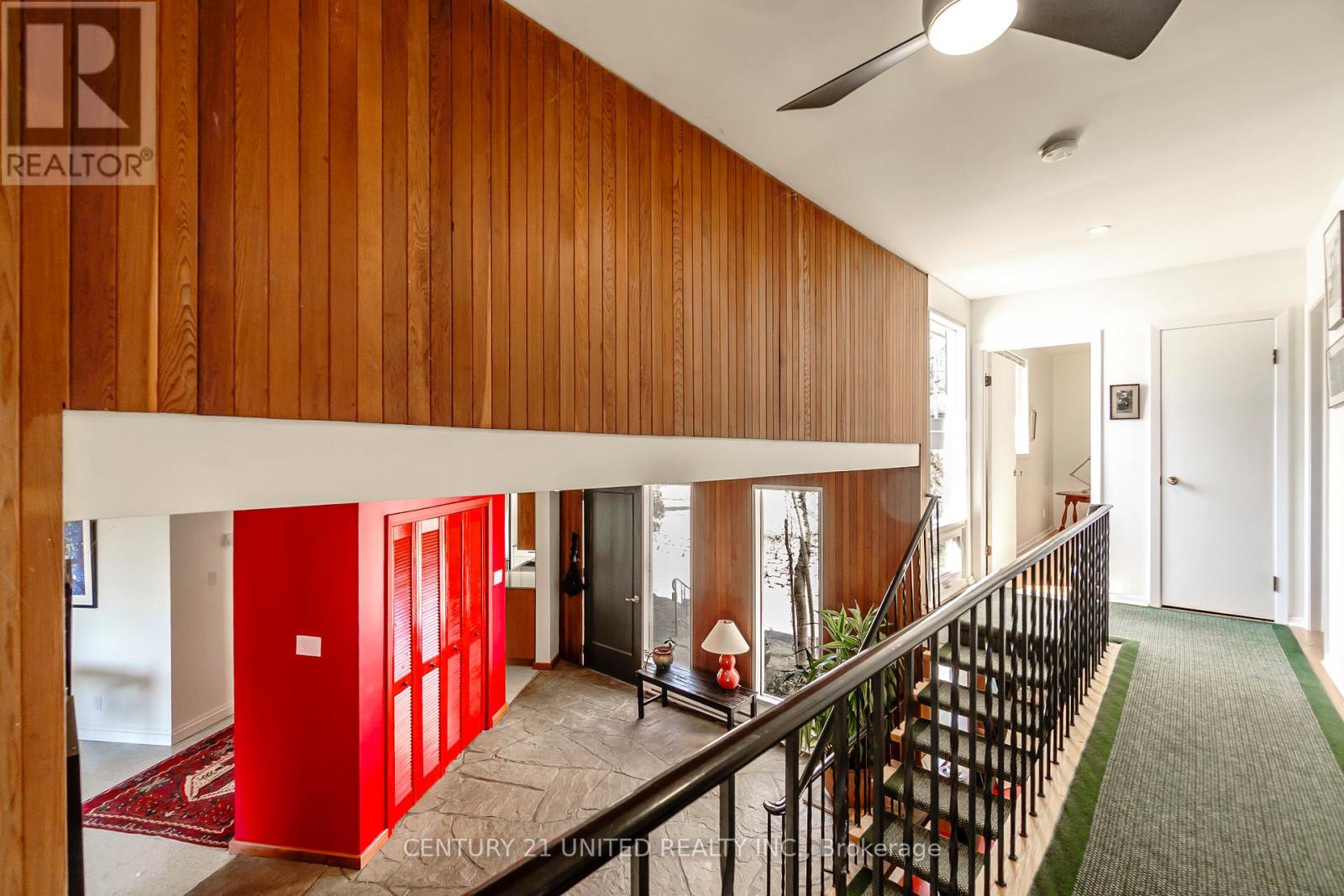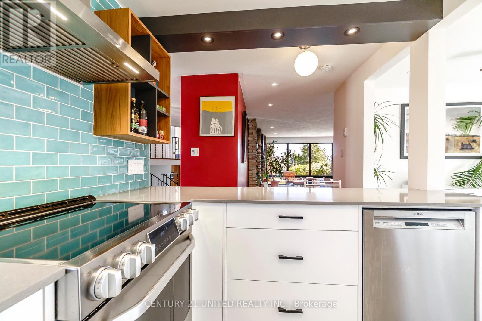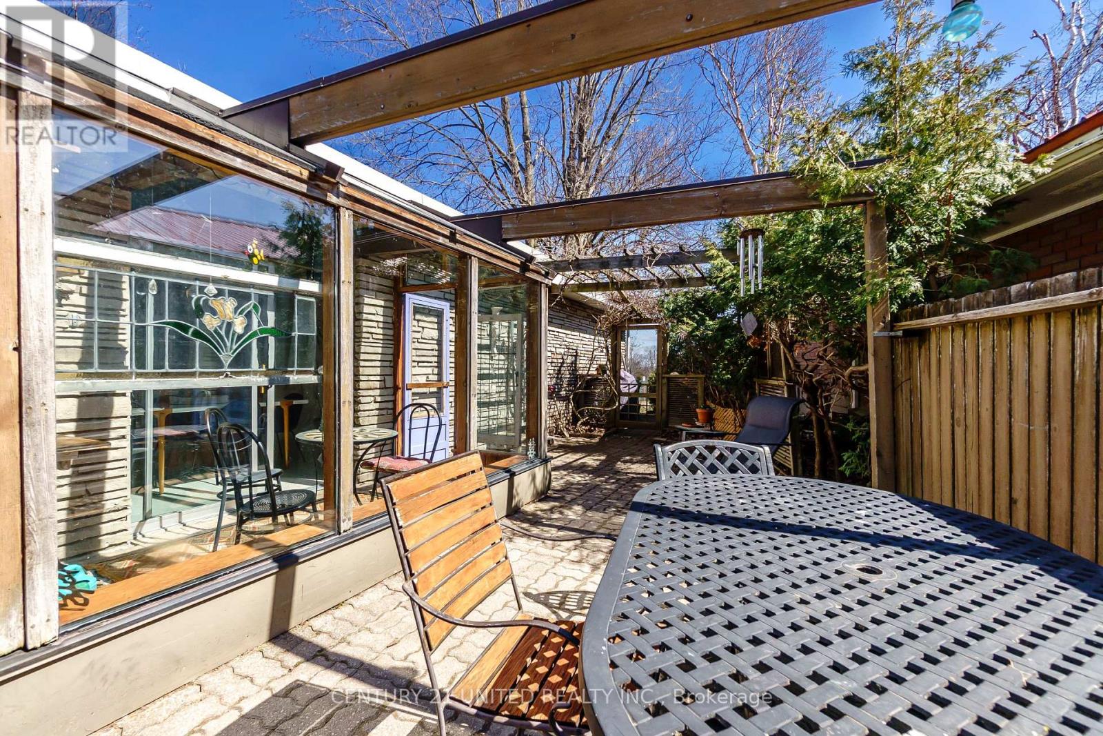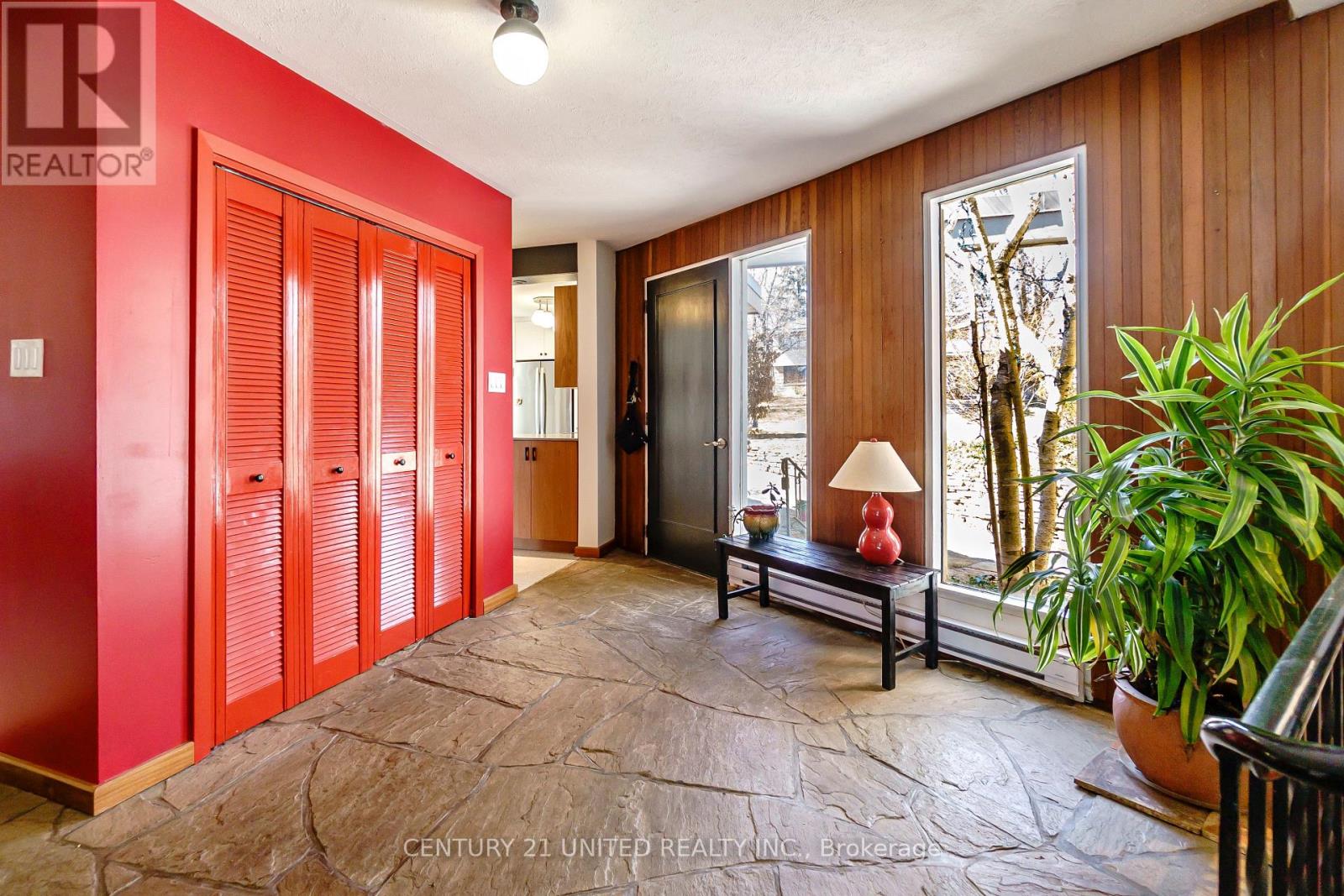 This custom-built mid-century modern masterpiece, completed in 1963, is a testament to the elegance of natural elements. The home features stone and cedar finishes, floor-to-ceiling windows that flood the interior with natural light, and an organic connection between indoor and outdoor spaces. Recognized for its design excellence, this home is a well-executed example of mid-century housing. The split-level construction creates an open concept while providing separate areas for privacy. The recessed entrance, floor-to-ceiling black-framed windows, polished concrete floors, modern and sympathetic kitchen renovation, renovated bath, ensuite bath, stone fireplace in the living room, and walk-out to a picturesque parkette add to the home's charm. Upgraded wiring, new pot lights, roof covering 2021, an attached garage with convenient access to the house, and a truly beautiful, warm, and inviting space make this home much larger than expected. The home boasts great curb appeal, a low profile that blends into the landscape, and an attractive circular driveway. A private sunny side patio just off the kitchen provides a convenient space for breakfast and lounging. Backed onto green space, this home is close to all amenities, schools, shopping, Trent University, trails, and Riverview Park and Zoo. Its quiet central location, friendly neighbourhood, green spaces for kids and dog walking, makes it an ideal choice. Heat and Hydro approx. $255.00 monthly average. This home will undoubtedly impress you. (id:61423)