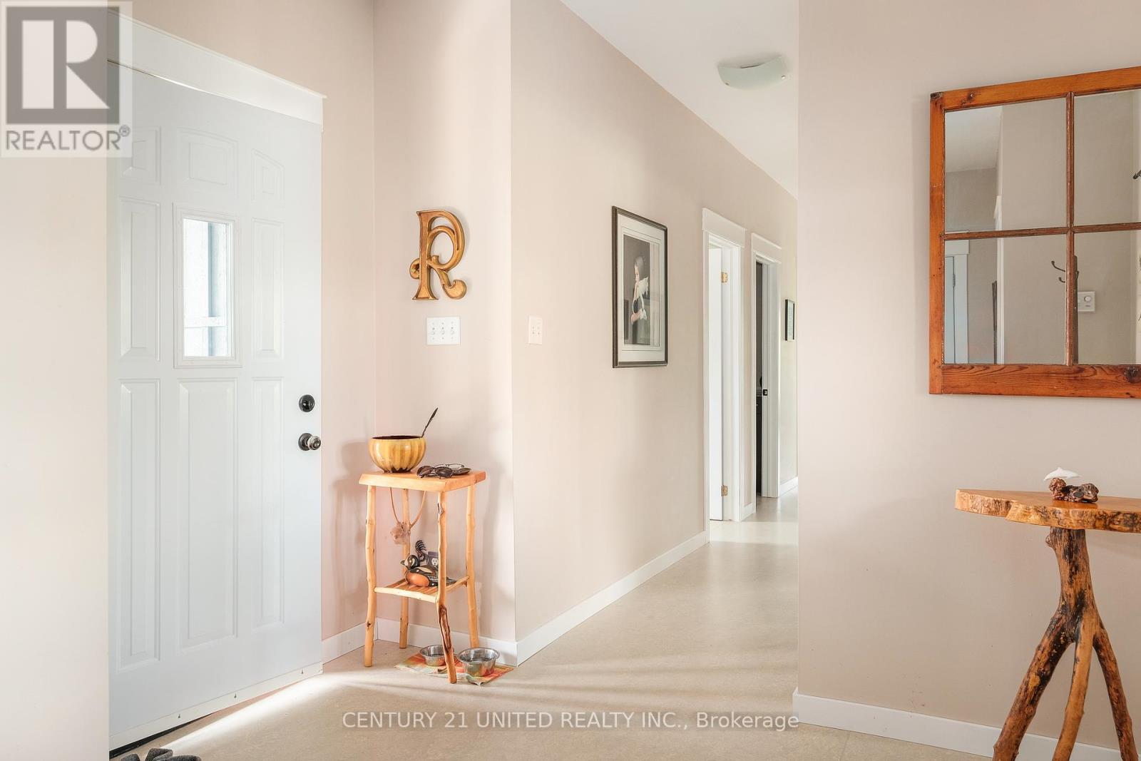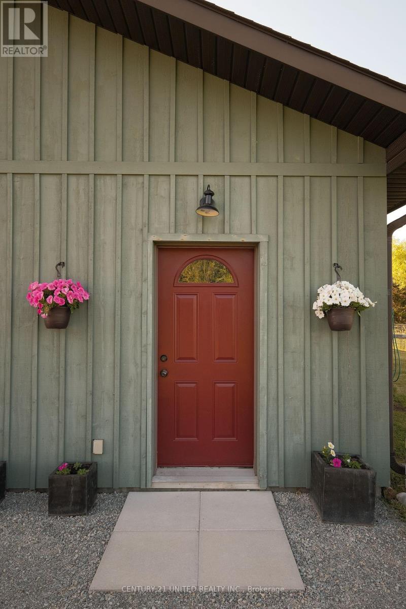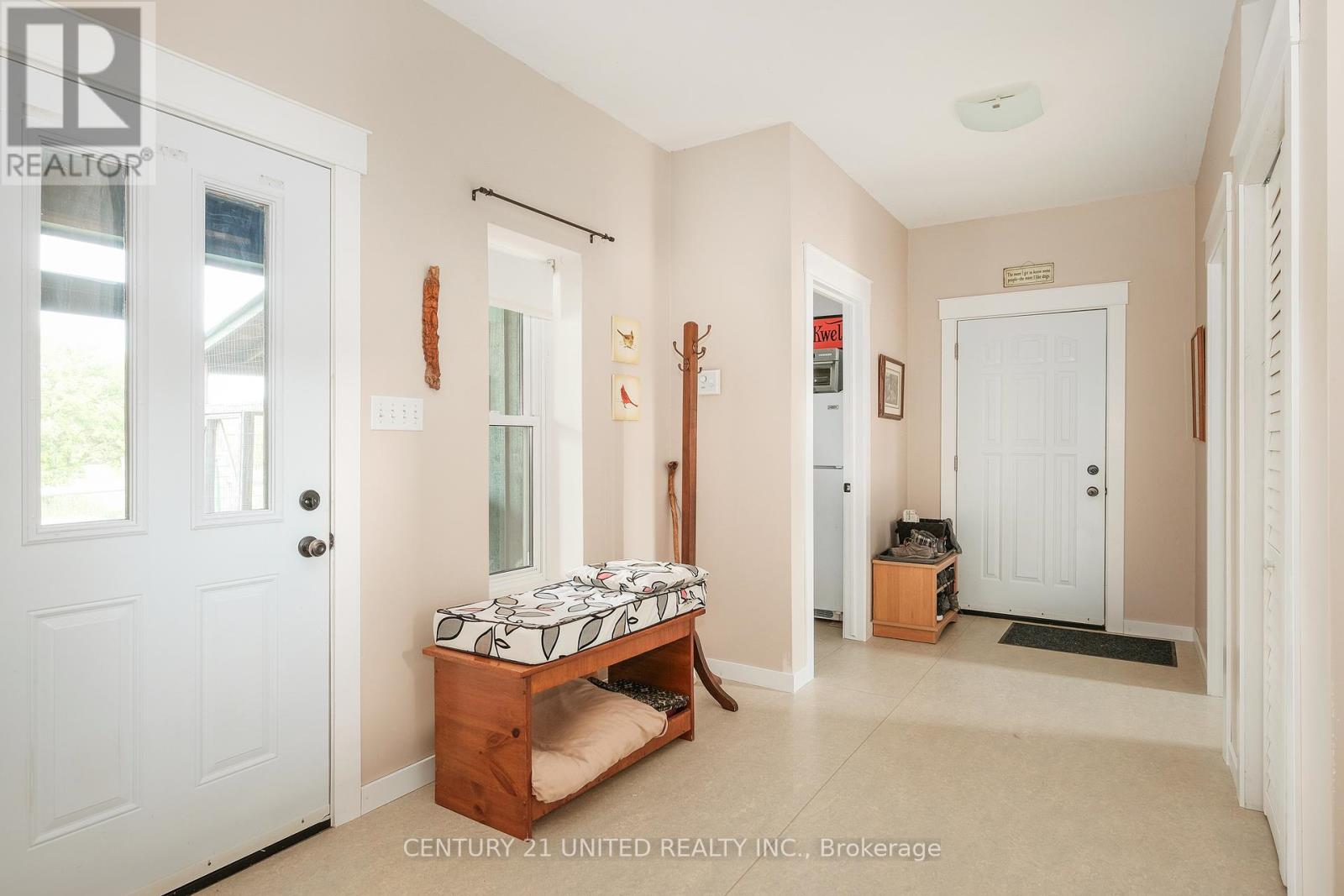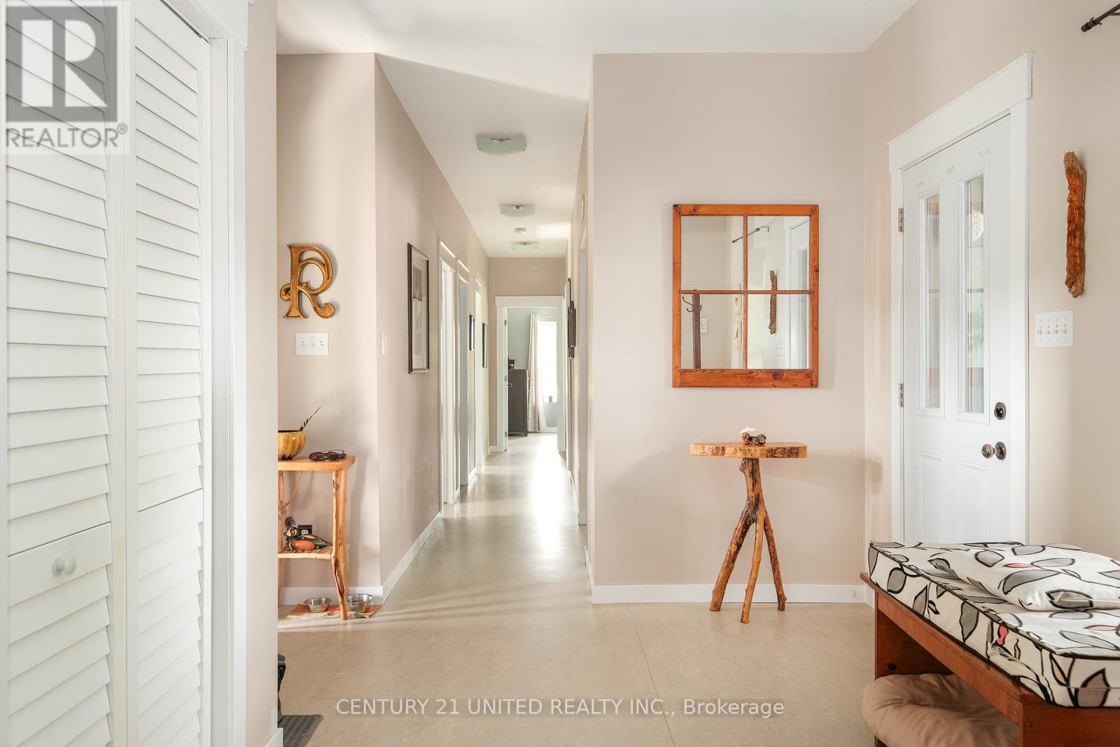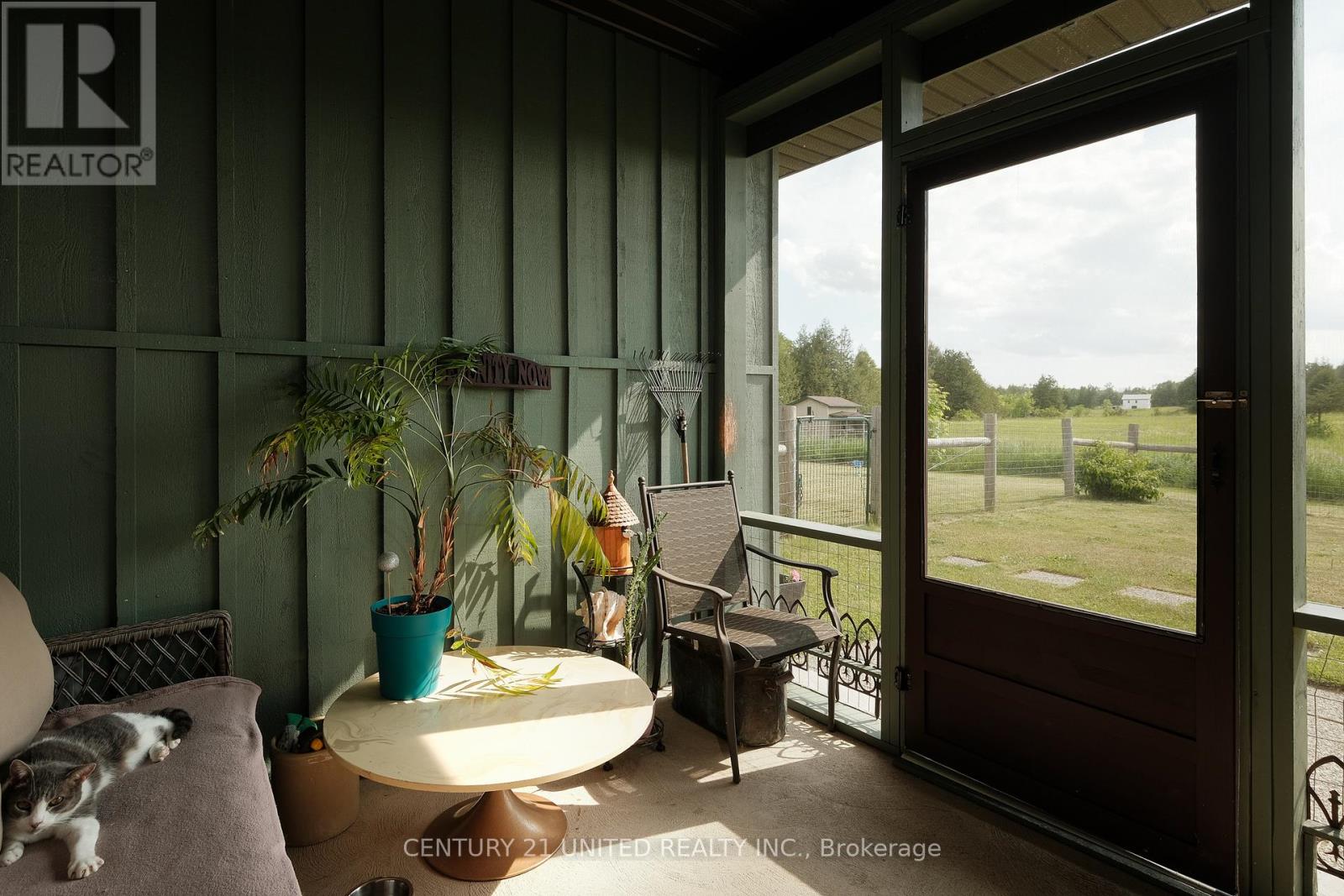 Charming custom-built bungalow nestled on a scenic 154 acre property with winding Ouse River access in prime location just minutes to Norwood and Hwy 7. Located on a quiet dead end road, this 2010 custom home features a spacious layout including an entry foyer, large kitchen, living dining room, sitting room/den/storage room, primary bedroom with 5-piece ensuite, second full bathroom, two additional bedrooms, laundry, and both eastern and western facing screened porches. The attached garage offers plenty of space for parking and additional storage. Slab on grade cement filled ICF construction featuring Legalett in floor heating system. The property offers a nice mixture of wooded and open acreage along with scenic river frontage. Rare opportunity to own in this ideal country location. (id:61423)
