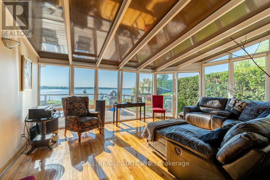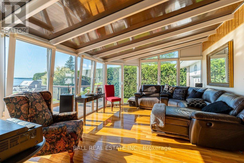 All brick bungalow on a stunning level, landscaped lot facing west for beautiful sunset views across Pigeon Lake! 122ft of armour stone shoreline with armour stone steps into the lake, lovely lakeside firepit and mature cedar privacy hedges. Level entry bungalow with paved drive and attached single garage. Offering 1891sqft of main floor living space with 3 bedrooms, 2 full bathrooms and sunroom with walkout to large lakefront deck. Finished basement offering rec room with wood-inset fireplace, full bathroom, sauna, laundry & storage. Enjoy level living from roadside to lakeside, soaking up sunset views year-round on the beautiful Trent Severn Waterway! (id:61423)
