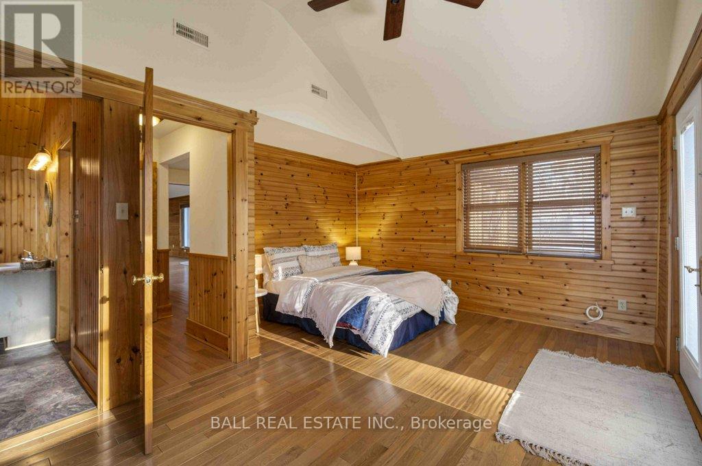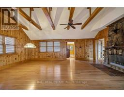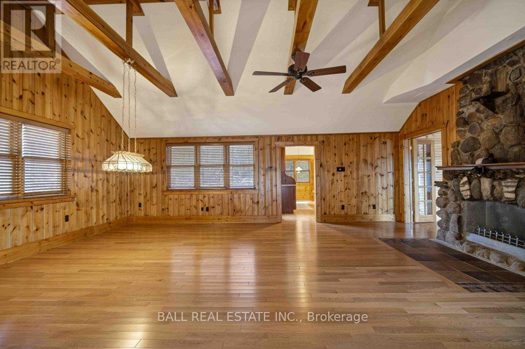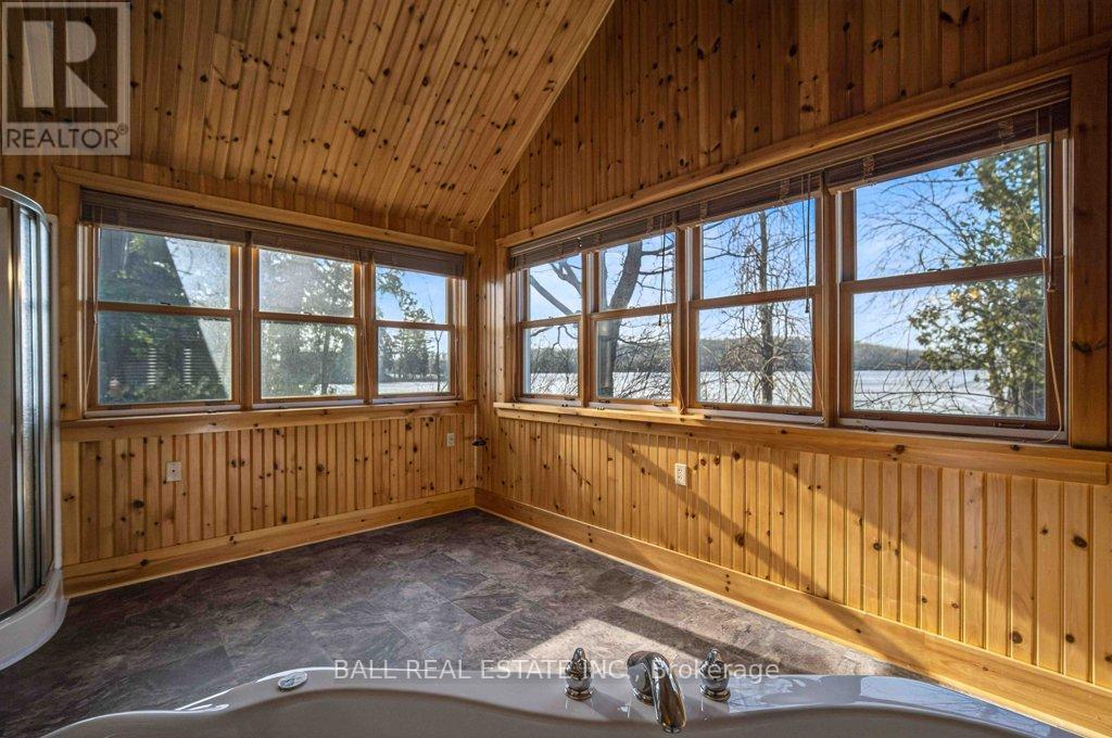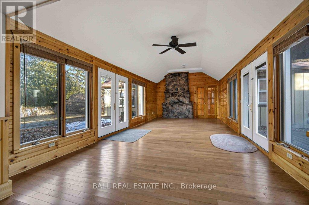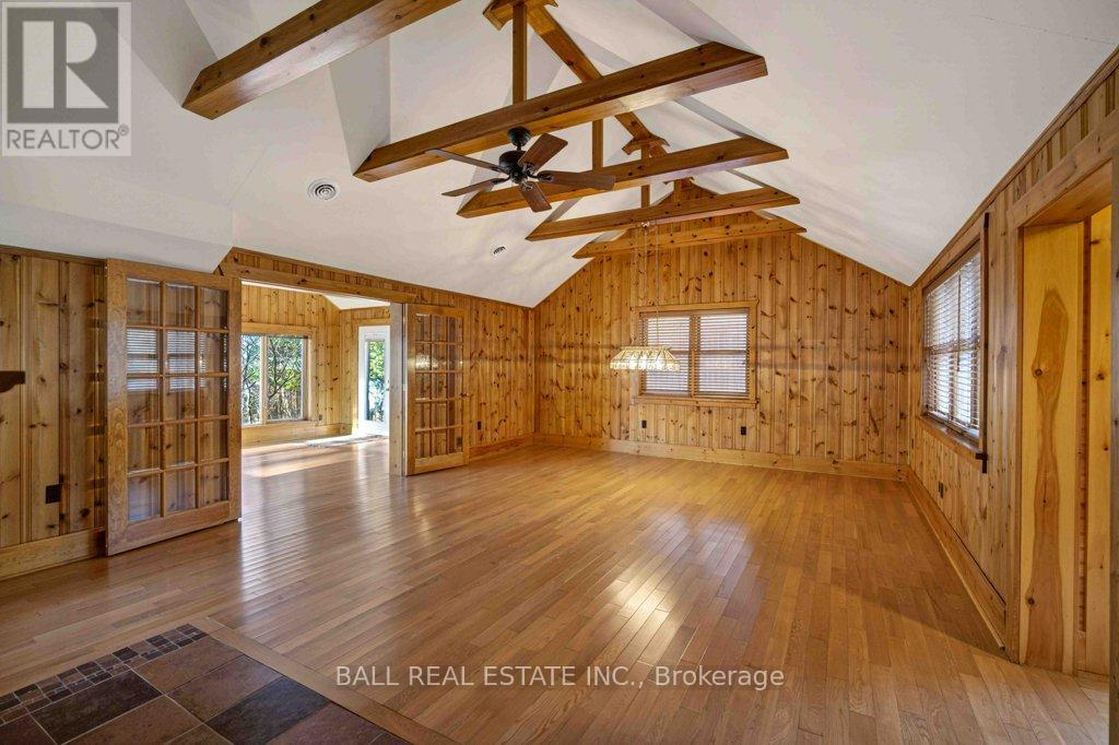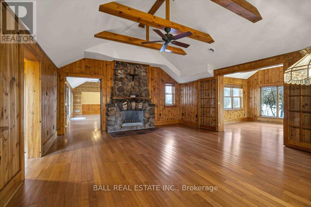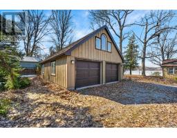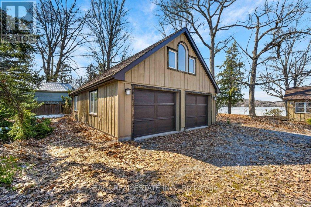 | The Ultimate Waterfront Retreat on Belmont Lake | Experience the rare harmony of luxury and lakefront living with this stunning Belmont Lake estate. Boasting a staggering 170+ feet of north-westerly frontage, this property offers front-row seats to the region's most breathtaking sunsets. Whether you're wading into the crystalline waters via custom stone stairs or cruising by boat to the local sandbar and the iconic Belmont Lake Brewery, the lifestyle here is unparalleled. Designed with meticulous craftsmanship, this 2,000+ sq. ft. bungalow features an expansive, all-one-level layout. The interior strikes a sophisticated balance between rustic charm and modern elegance, showcasing vaulted beamed ceilings, rich hardwood floors, and a grand stone fireplace that anchors the living space. The intelligent floor plan separates the primary living areas from a dedicated bedroom wing for ultimate privacy. Currently configured as a spacious two-bedroom, two-bathroom home, the flexible den offers an easy transition into a third bedroom if desired. Outside, the level lot leads to a detached double garage featuring a finished studio loft, perfect for a creative workspace or a guest bunkie. Located just 10 minutes from town amenities and 45 minutes from Peterborough, this home offers the peace of the cottage with the convenience of a primary residence. Complete with forced-air propane heat, central air, and a drilled well, this is quality you can feel in a setting you'll never want to leave. (id:61423)
