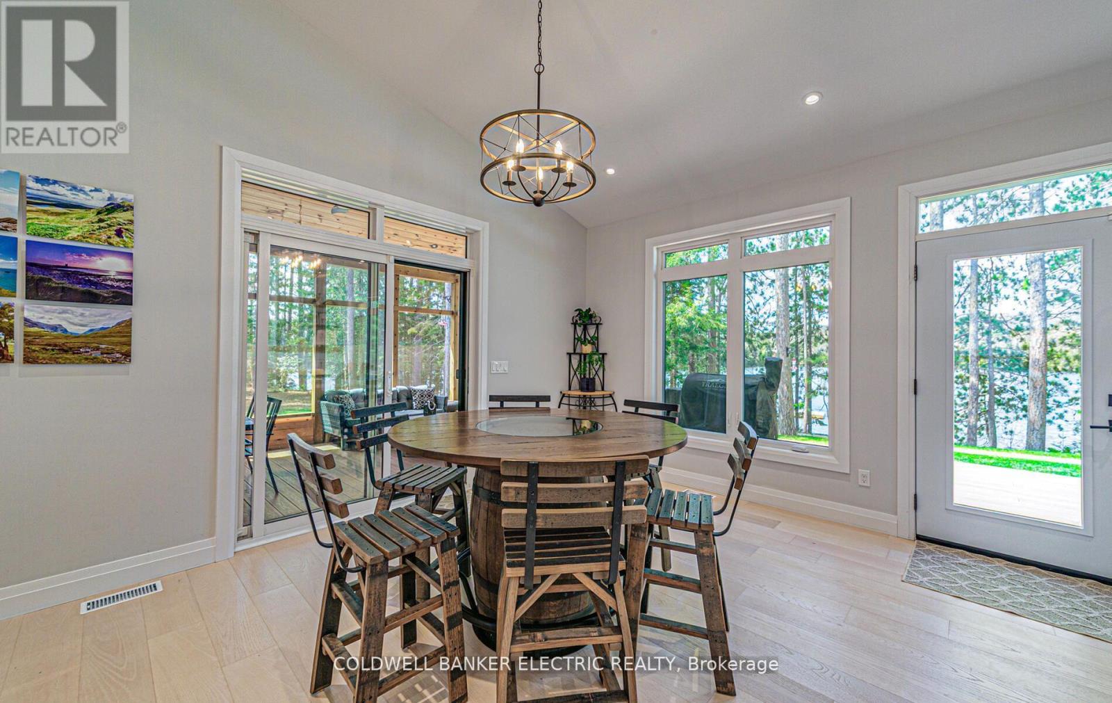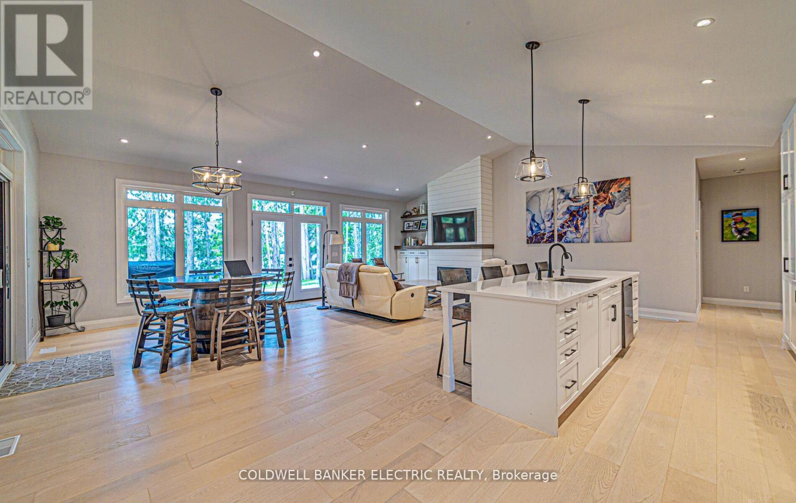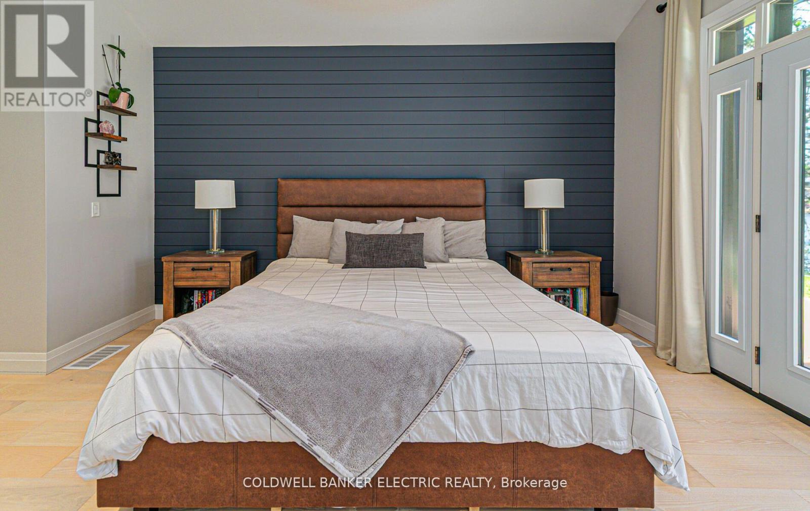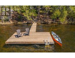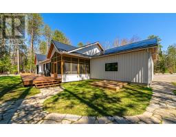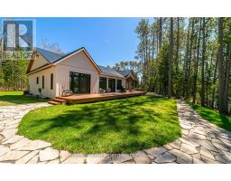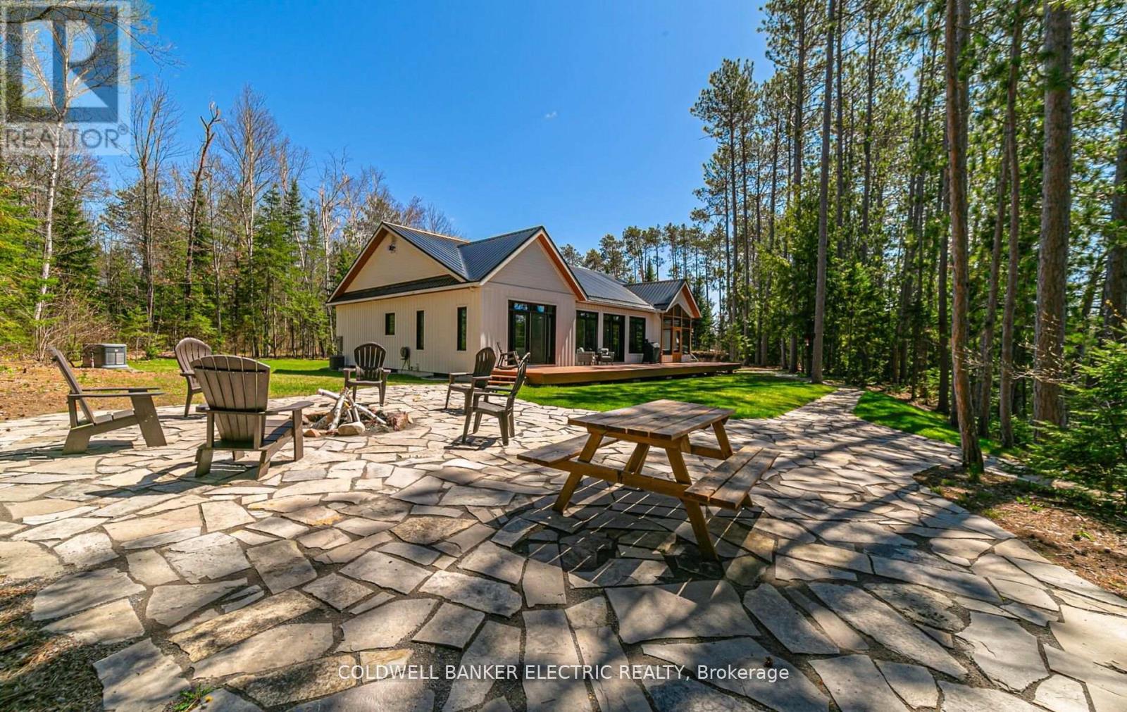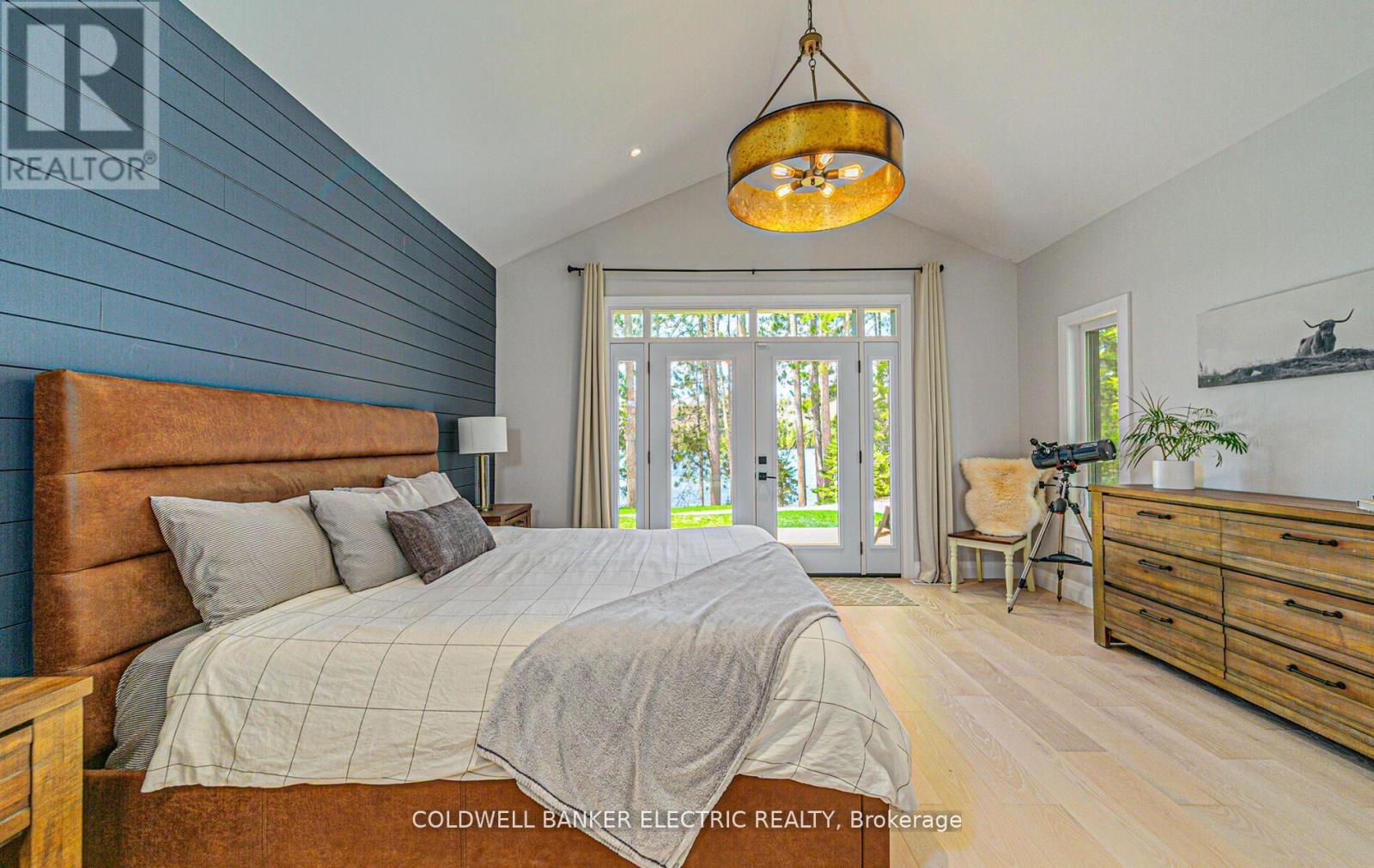 Envision 290 feet of Private, pristine WEST facing waterfront on Bow Lake, offering incredible deep clean swimming less than 60' from your dream home! 3800 finished sq ft of luxury tucked into a mature 1.5 acre pine grove. This modern, meticulously planned, 5 bed, 3 bath custom built home/cottage, features 3 main floor bedrooms and 2 main floor bathrooms. The Primary Suite has vaulted ceilings and walkout to the deck, 3-piece ensuite with double custom vanity, large rain shower and heated floor. Fully finished basement includes 2 additional bedrooms plus a 4-piece bath, large rec room, oversized laundry room and tons of storage space. Quartz countertops in kitchen and main floor baths, Ash engineered hardwood throughout the main floor and basement, tile in bathrooms, foyer/mudroom. Still looking for more space? Attached 2-car heated garage with direct entry to the foyer. Power outage? No problem, 11kW automatic generator wired into the home. Enjoy the sounds of nature from your screened-in porch, then venture outside onto your composite deck and bask in the late afternoon sun. Find your Zen at the end of the day as the Sun sends sparkles across the water for a priceless SUNSET! Why not dip your toes in Bow Lake from the edge of your dock while loons, ducks, otters and turtles swim by. Bow Lake has no public access point, meaning you share this beautiful water with only a handful of neighbours! Enjoy easy outdoor living with raised garden beds, mature asparagus patch, Kids' playground and sandbox. If you have more motorized toys than the garage can handle, move them out to the detached drive shed. Care to wet a line? Excellent bass, pike and perch fishing! Centrally located, 10 min north to the full service town of Bancroft, where you'll find shopping, restaurants, rec centre, parks, Schools, and a Hospital; travel south 25 min to the town of Apsley equipped with state of the art hockey arena, gym, and rec hall, putting convenient rural living at your fingertips. (id:61423)