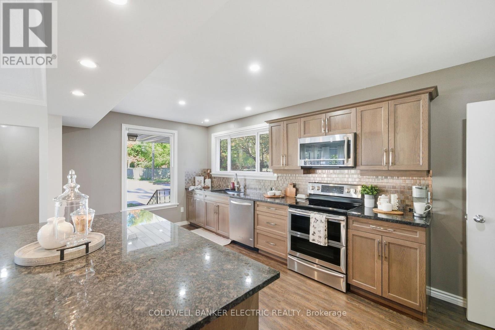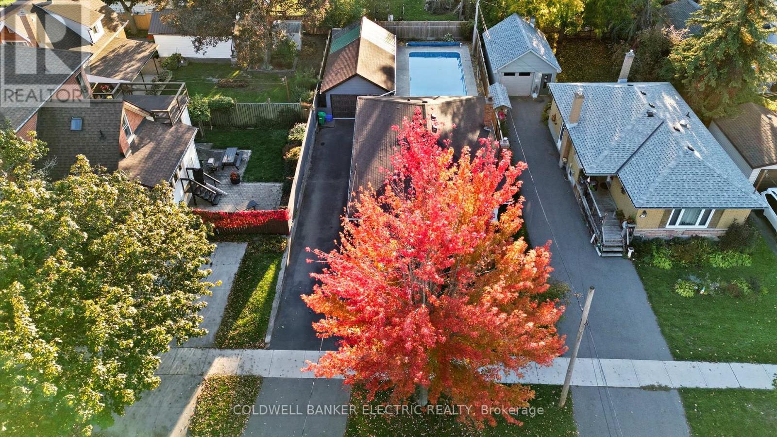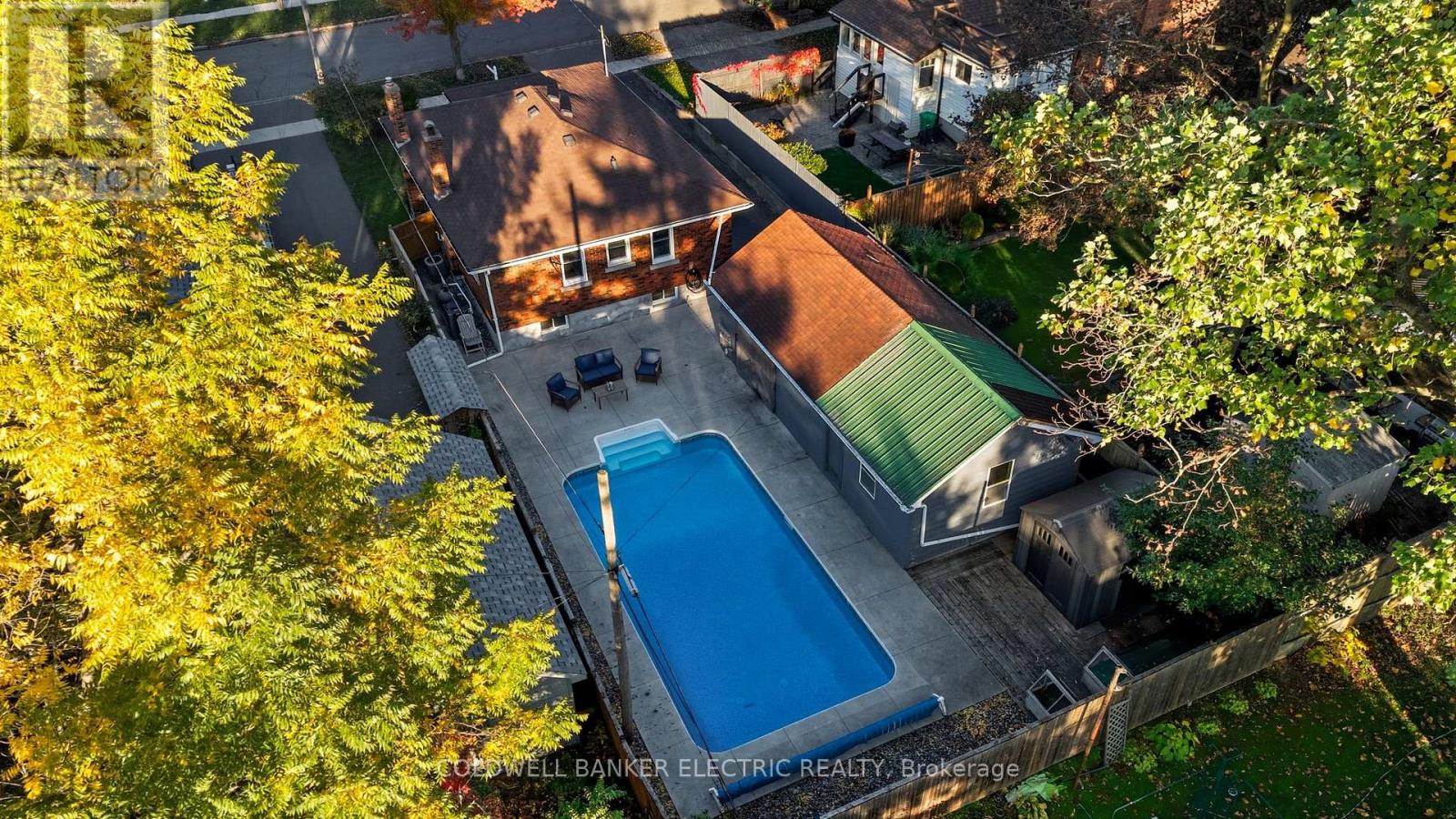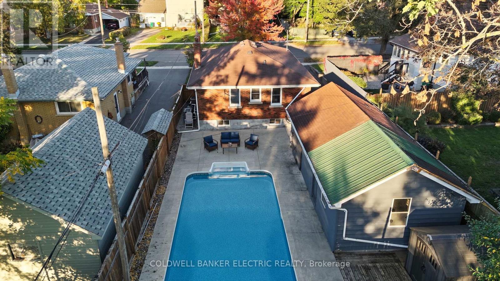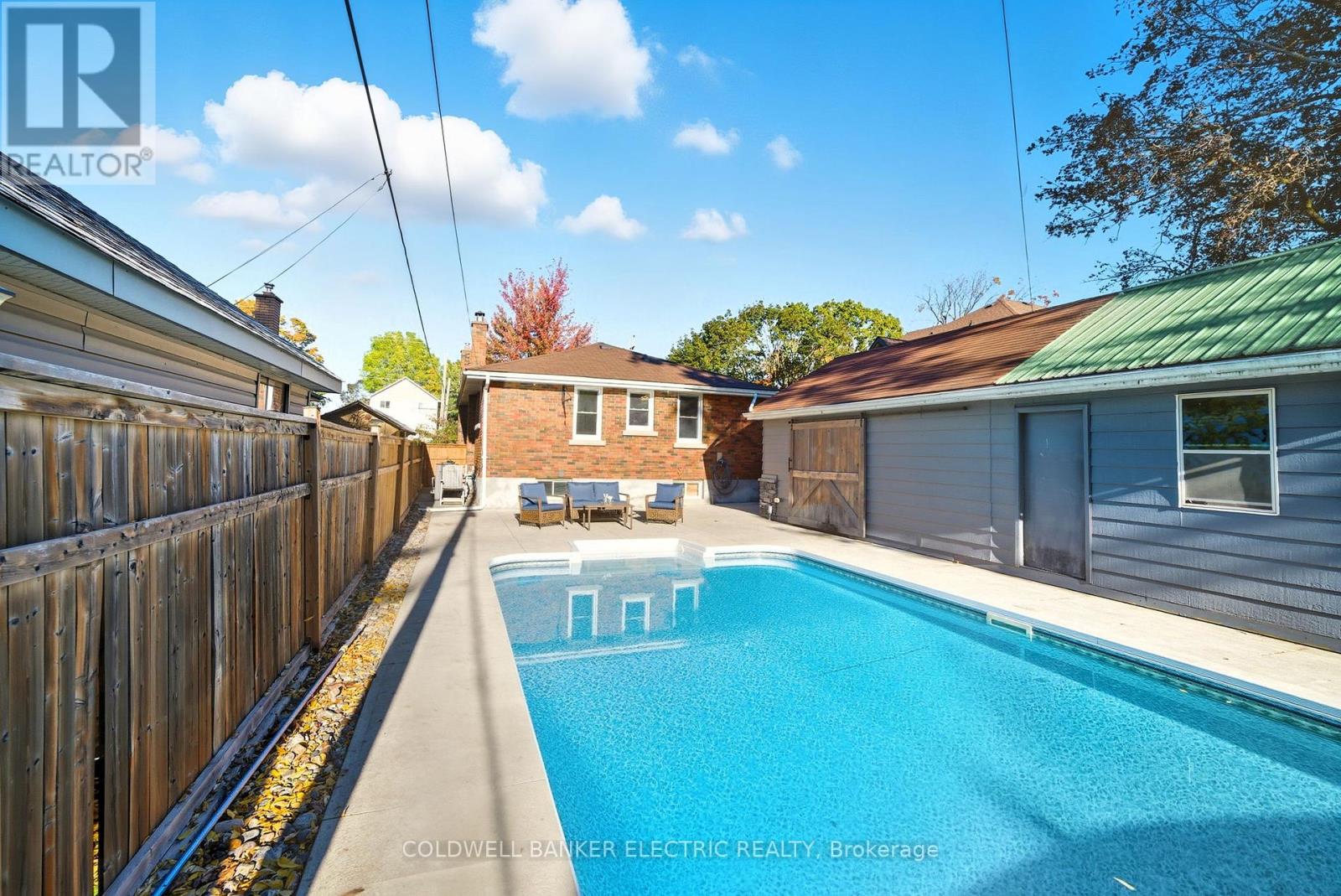 Step inside and be greeted by a stunning renovated kitchen featuring a massive island with breakfast bar, granite countertops, modern light fixtures, and an abundance of cabinetry-- good luck filling them all! The open-concept layout seamlessly connects the bright dining area and cozy living room, complete with custom-built bookshelves that add both charm and character.The main floor bathroom has been tastefully updated with a sleek modern vanity and fixtures. You'll love the updated flooring and beautiful neutral paint palette that carries throughout the main floor and into both bedrooms, creating a warm and cohesive flow.Downstairs, the finished lower level offers even more space featuring a generously sized additional bedroom, a 3-piece bathroom, a large rec room, laundry room, cold cellar, and plenty of storage. With its separate entrance, this level offers excellent in-law potential for the future.Step outside to your own backyard retreat a 33' x 15' detached garage with a large barn-style door opening to a covered porch area, perfect for a poolside bar or change room. Overlooking the 32' x 15' heated inground pool with stamped concrete surround, this backyard is designed for entertaining and relaxation. The back of the garage includes a workshop space that every hobbyist will appreciate.Situated on a quiet, tree-lined street within walking distance to schools, parks, and amenities, this home truly has it all. With its modern upgrades, functional layout, and inviting outdoor space, you can't help but want to call this your next home. EXTRAS: Inground Pool (2017) Pool Heater (2022) Central Air (2019) Furnace (2025) Hot Water Tank (2025) Custom Built-Ins (2024) (id:61423)