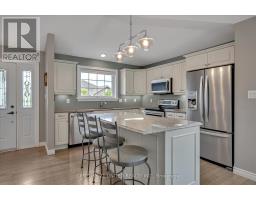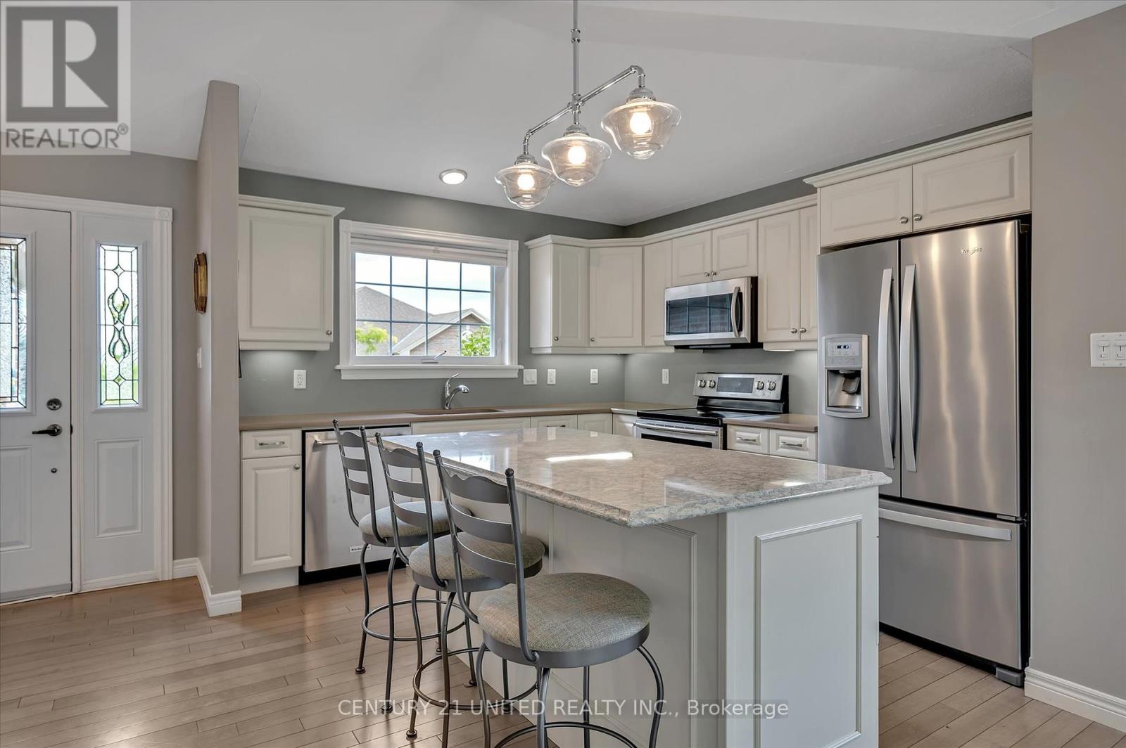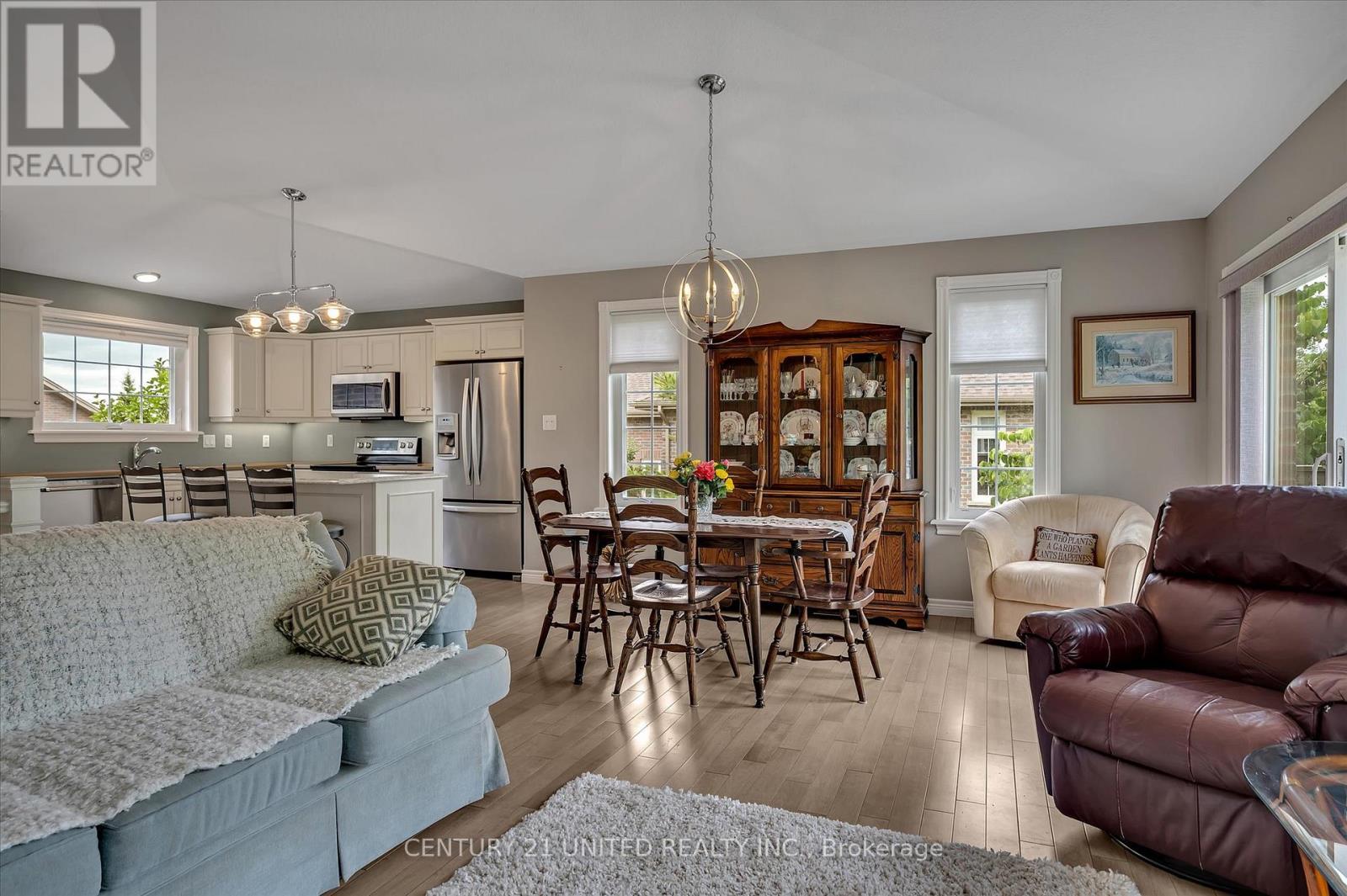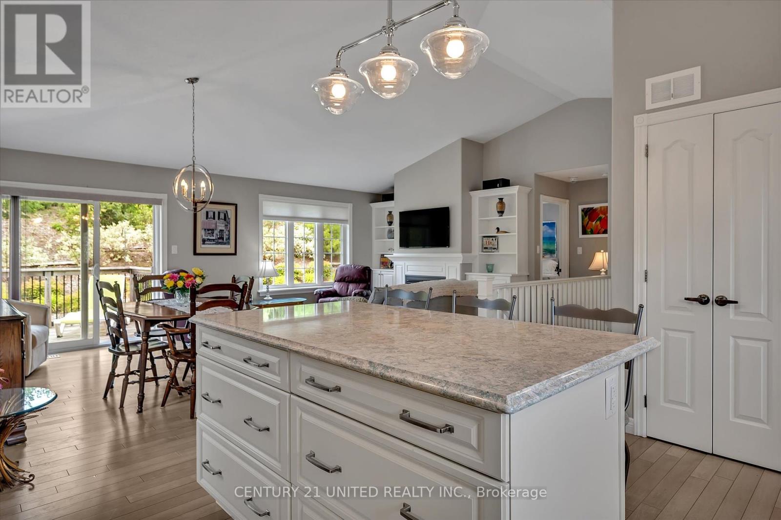 Beautiful and bright, this northwest-corner end-unit offers unmatched privacy, backing onto terraced gardens with no neighbours above in the sought after Ferghana community. This premium condo features soaring cathedral ceilings, a quartz island kitchen with stainless steel appliances, light hardwood floors, and a gas fireplace with custom built-ins perfect for cozy winter afternoons. Main-floor conveniences include laundry, a dining walkout to a private garden deck, and access to a double garage. The lower level adds a guest bedroom, full bath, spacious family room, and excellent storage. Pre-inspection is complete for peace of mind. Perfect for snowbirds, retirees, or empty nesters, this move in ready home sits in the newer, top-end section of the enclave. Ideally located minutes to parks, trails, the zoo, shopping, and just south of Trent University. Furnishings available at additional cost. (id:61423)