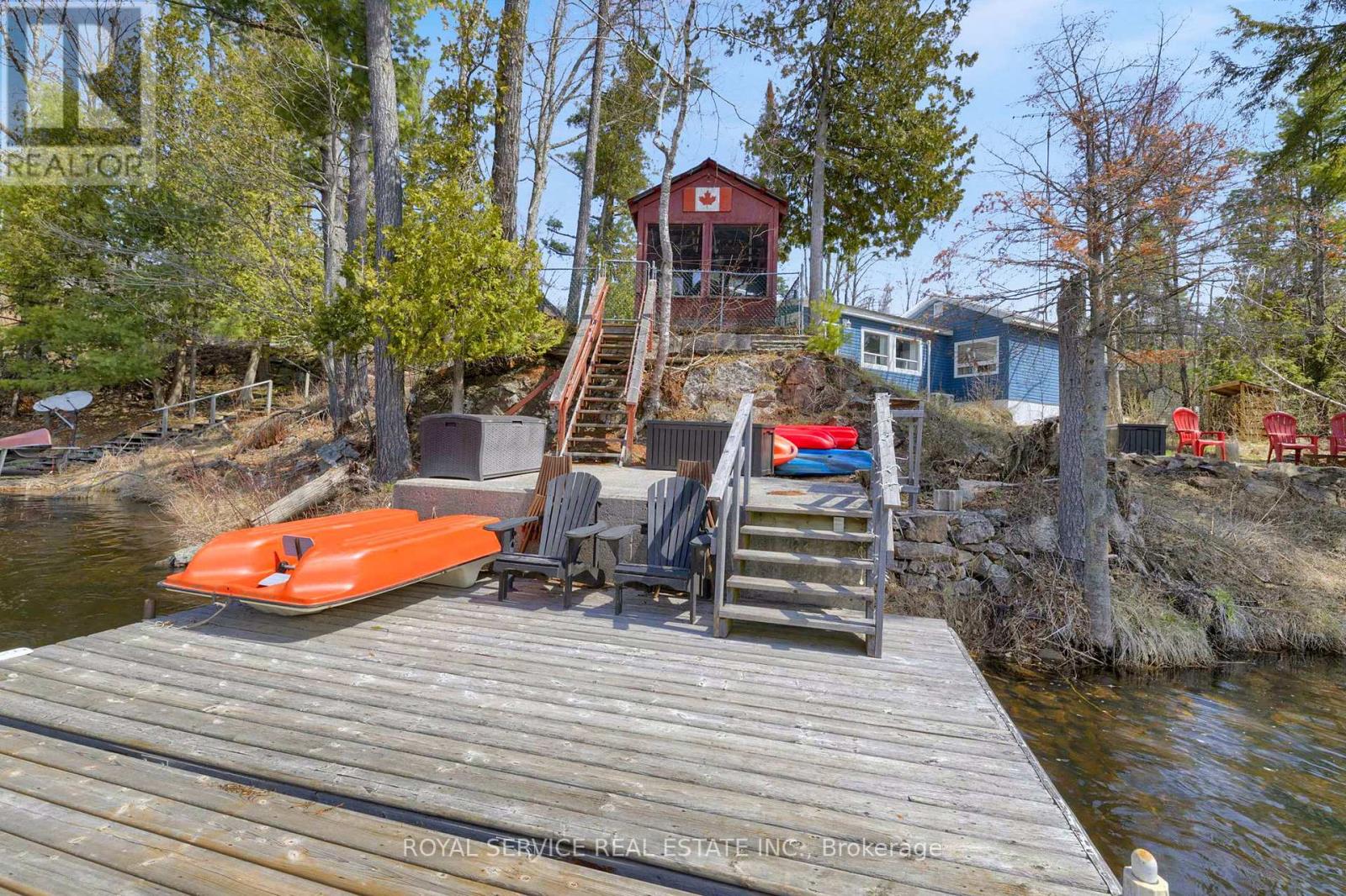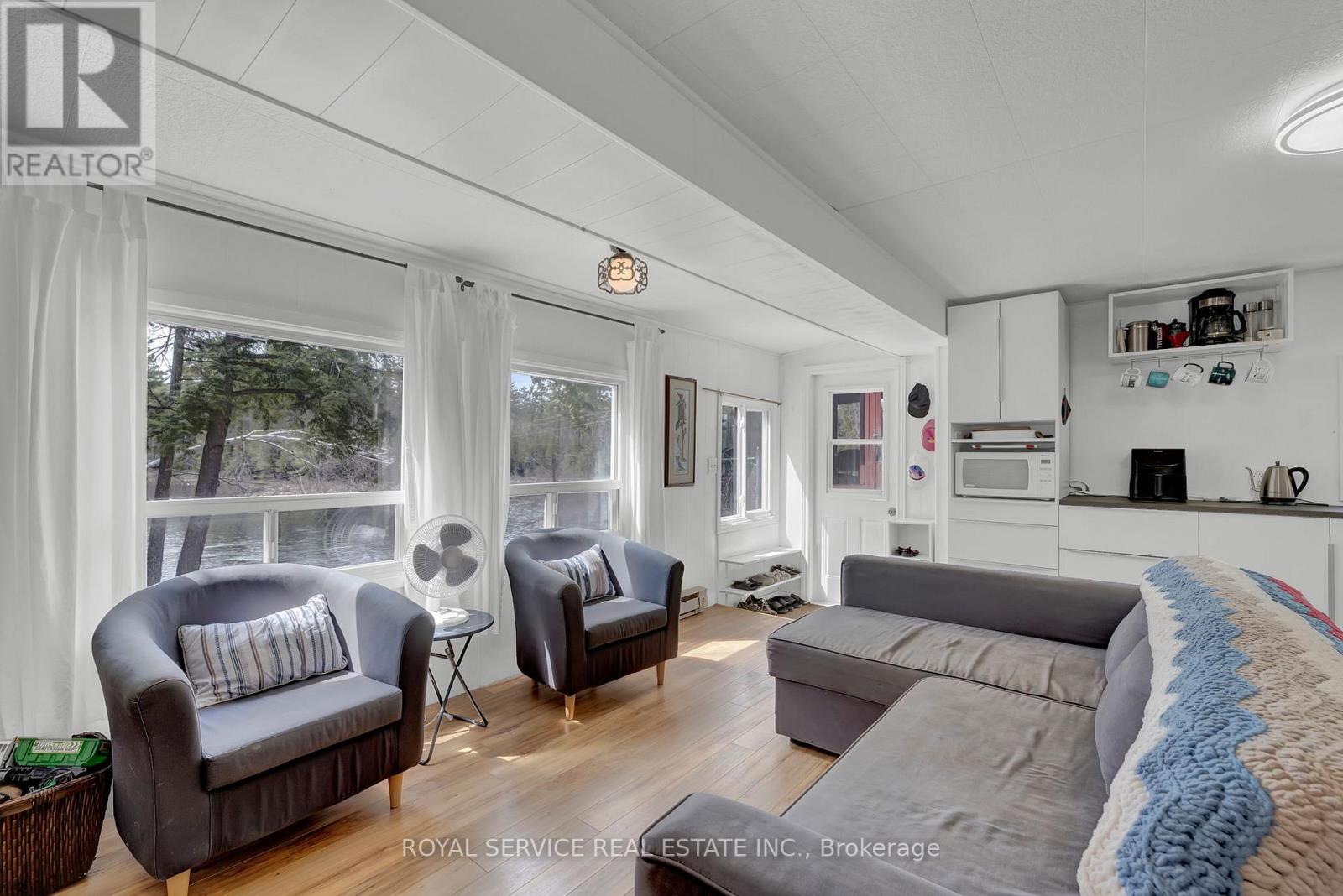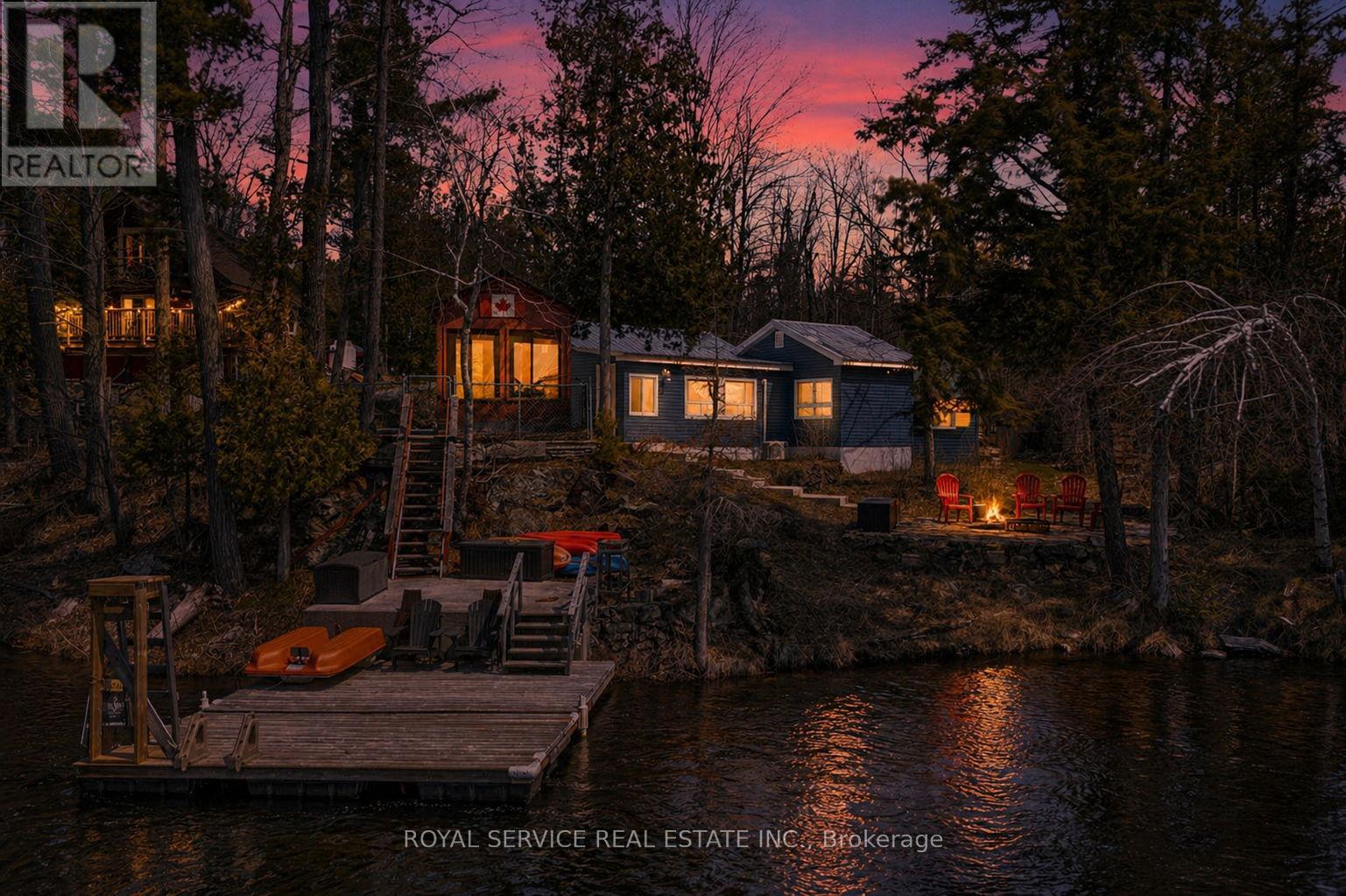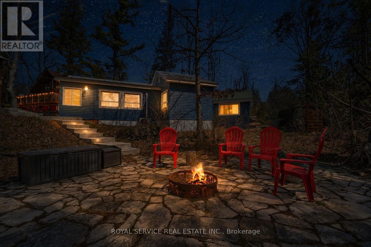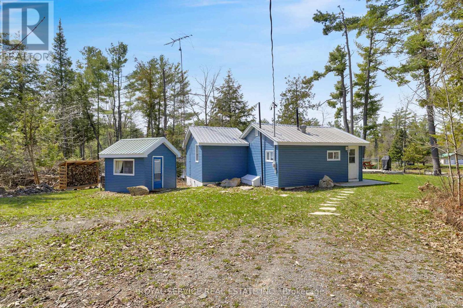 Looking for a place to create unforgettable memories? This charming two-bedroom, one-bath cottage on the North River offers clean, deep waterfront and a peaceful setting on a privately maintained, year-round road.Inside, you'll find an open-concept kitchen featuring a large ceramic sink, seamlessly flowing into the dining and living areas, all with a gently elevated view over the water-perfect for quiet morning coffees. The cottage includes two bedrooms, plus a recently added bunkie for extra sleeping space. Outdoors, enjoy a level backyard, a screened-in gazebo, and beautifully landscaped grounds. Concrete steps lead to a cozy fire pit area-ideal for evenings filled with campfires and conversation. Whether it's fishing, boating, or simply relaxing, this property offers countless ways to enjoy cottage life. Recent upgrades include new siding (2024), a bunkie addition, and extensive landscaping with poured concrete and fire pit steps (2024). Additional improvements feature a new heat pump (2024), water shed (2024), and water pump (2025). Approximately 5 minute boat ride to Round Lake. (id:61423)
