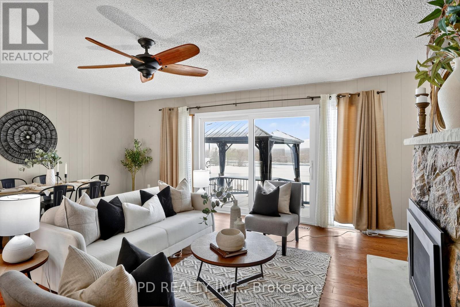 Easy, Convenient Waterfront Living! Well maintained level entry bungalow on a 0.8 acre lot with over 100 ft of Pigeon Lake frontage on the Trent-Severn Waterway. Enjoy peaceful lake living with direct waterfront access and only a short boat ride to the popular sand bar for great swimming. The main floor features 2 bedrooms, a large 4 piece washroom, an updated kitchen with built-in appliances, a spacious living room with hardwood floors, natural gas fireplace, and walkout to a lakeside deck overlooking the expansive level yard. The fully finished lower level is ideal for guests or extended family and includes a 2nd kitchen, 4 piece washroom, 2nd living room with gas fireplace, office, rec room, large laundry area, and plenty of storage. Additional highlights include the 2 car garage, metal roof, double wide paved driveway, and 2nd deck. Move in ready and perfectly combining tranquility, comfort, and convenience on beautiful Pigeon Lake. (id:61423)