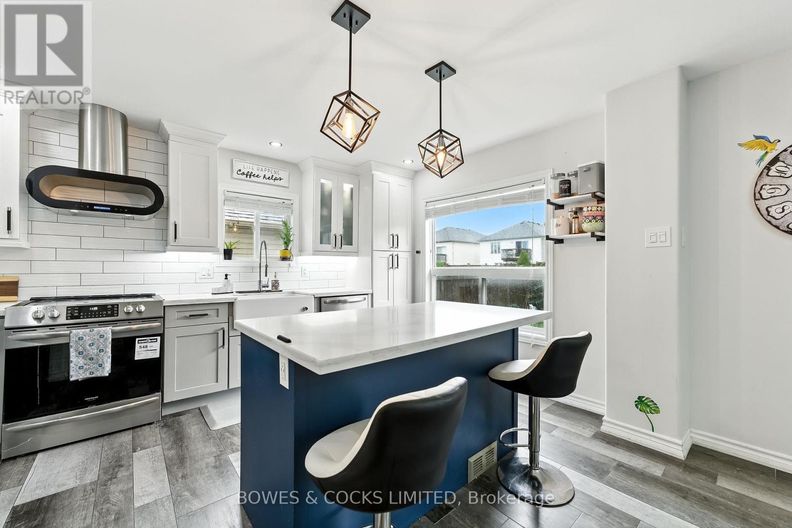 Charming 4 Bedroom Family Home in Sought After North End Neighbourhood. Welcome to Heritage Park! This beautifully updated home offers a practical layout and modern finishes, perfect for family living. The bright and airy kitchen boasts sleek quartz countertops, newer appliances, and a large island, ideal for meal prep or casual dining. Enjoy cozy evenings in the adjacent dining area featuring a gas fireplace. Step out from here to a private deck and a generously sized, fenced backyard, perfect for entertaining or relaxing. The newly remodeled powder room adds a touch of elegance, while the primary bedroom offers a walk-in closet for added convenience. Upstairs, you'll find three more bedrooms and a 4 piece bathroom. The mostly finished lower level provides extra living space, and there's a rough-in for an additional bath to suit your needs. Located just moments from Trent University and the Peterborough Zoo, this home appeals to families and investors alike. Additional updates include a new furnace installed in 2023 and gorgeous flower gardens that enhance the homes curb appeal. (id:61423)