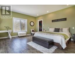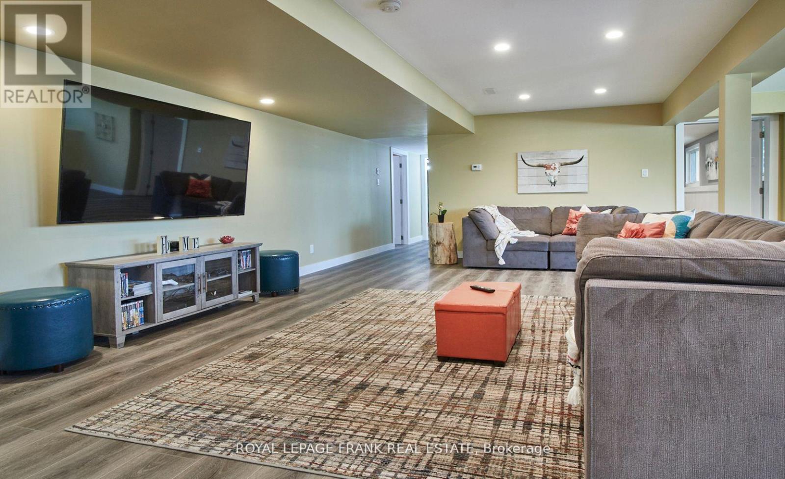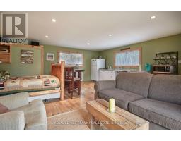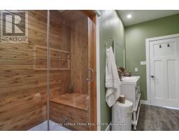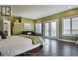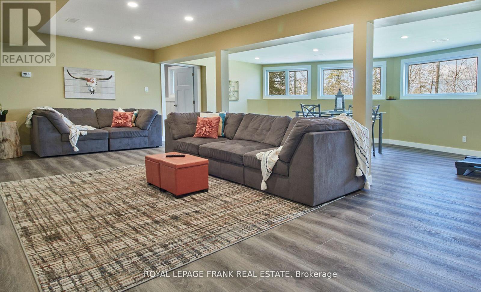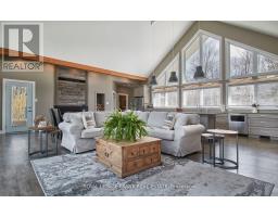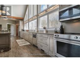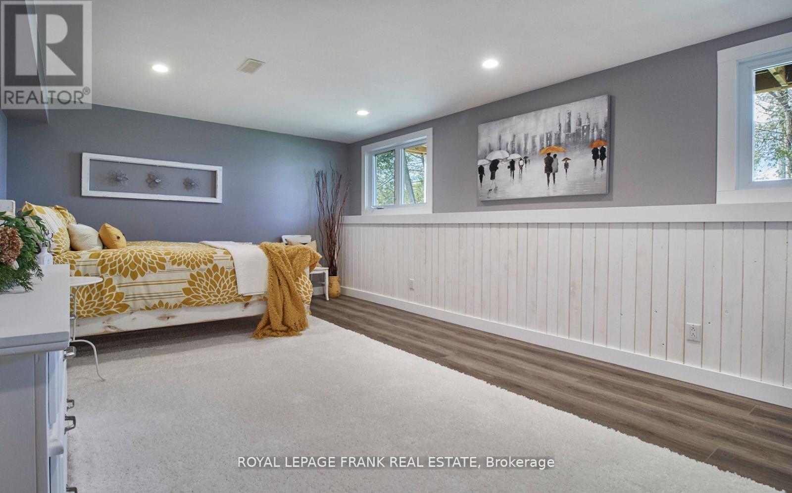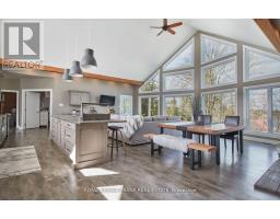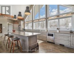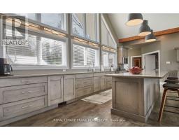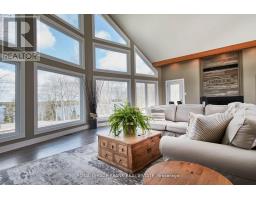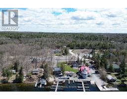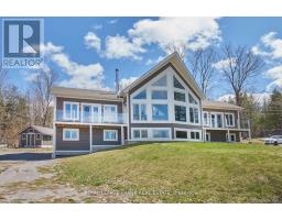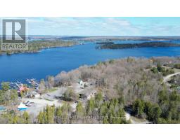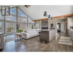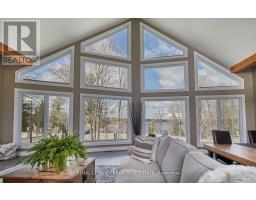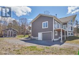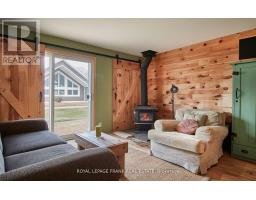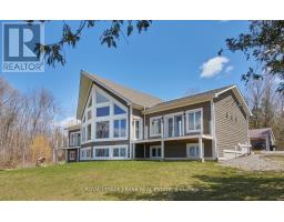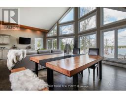 A spectacular 6 year old contemporary home with a WOW FACTOR! At every turn you can see the exquisite quality of construction and finishings in this 3200 sq.ft. beauty. Creative custom design/build with two separate oversized bedroom wings complete with ensuites (1with luxurious steam shower), bookending an amazing great room with 18 foot cathedral ceilings. This home has so many options for creative & versatile executive living. A wall of triple pane argon windows in the front overlooks prestigious Stoney Lake, facing west for breathtaking sunsets. Open concept kitchen/dining/living room with an immense 10 foot granite Island complete with seating and high end KitchenAid stainless appliances and beautiful cabinetry. State-of-the-art 5 foot wide wood burning fireplace. The rear wall of windows looks out to the rustic 3 acre wooded lot with a babbling stream running through it. Main floor laundry and convenient 4 piece bath that services the quaint guest sleeping cabin. The lower level offers huge windows with the same fantastic lake view, a large guest bedroom, expansive family room or gym, the fourth 4 piece bath, furnace room and walk out to attached garage. Forced air propane furnace with dual controls for up and down, quality wide plank Cape Cod Cedar siding. Steps to Harbour Town, Hobarts Restaurant, Marina, docking, public boat launch and General Store. (id:61423)