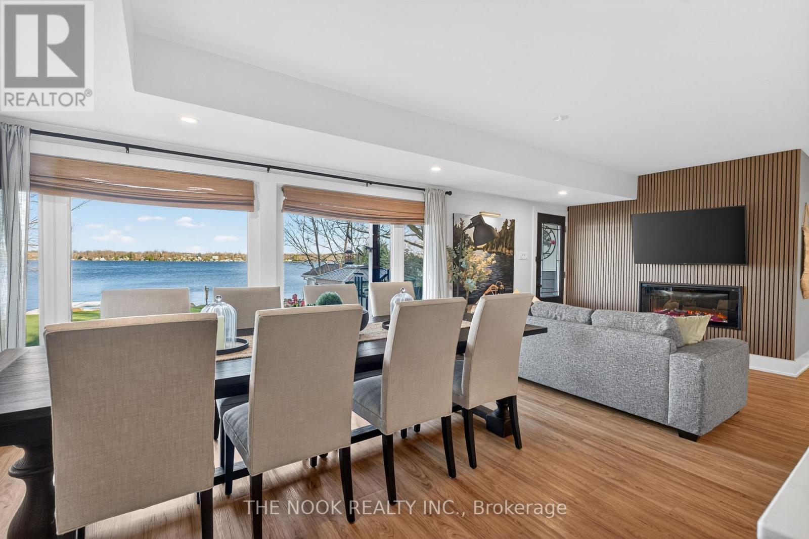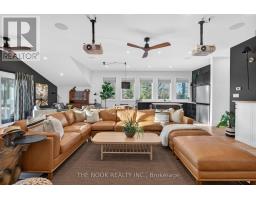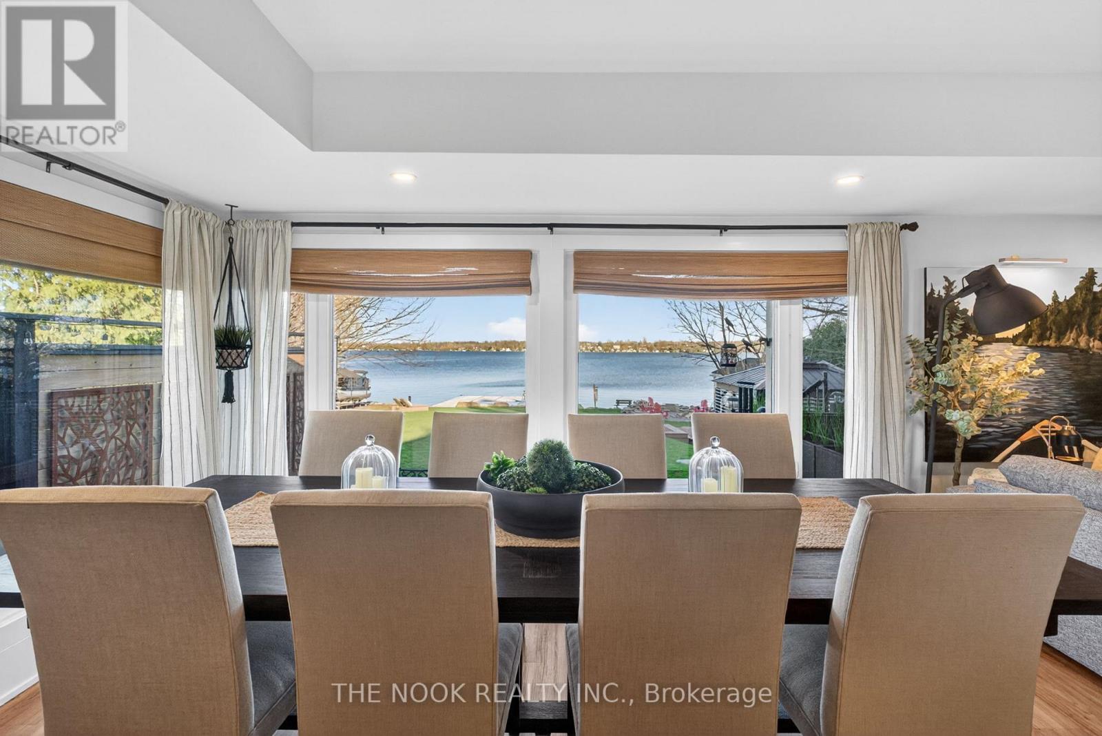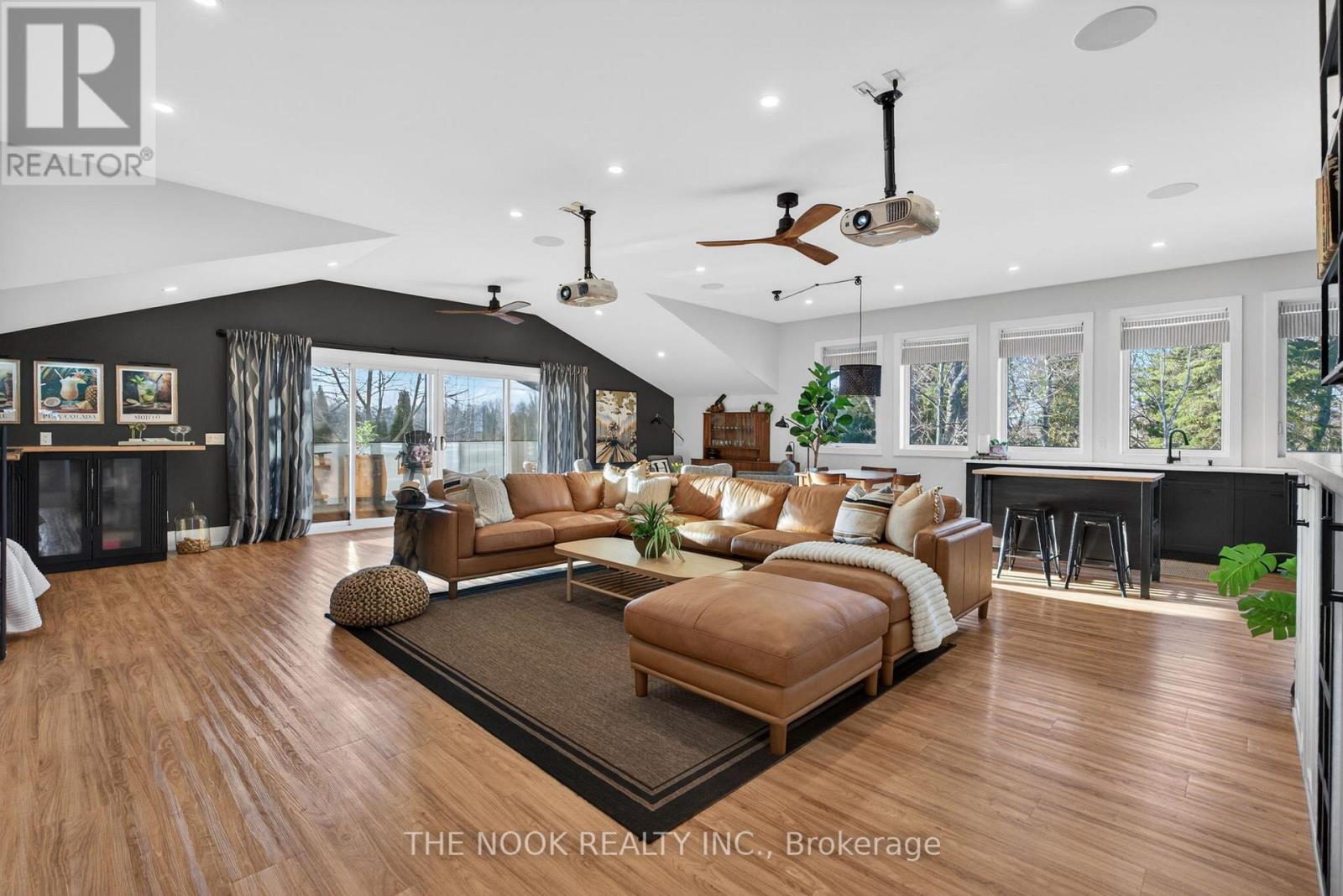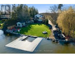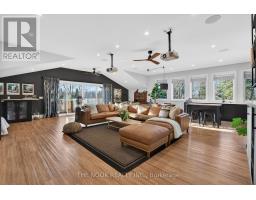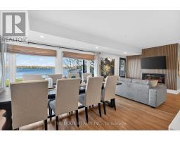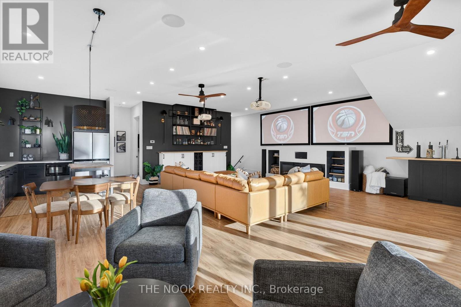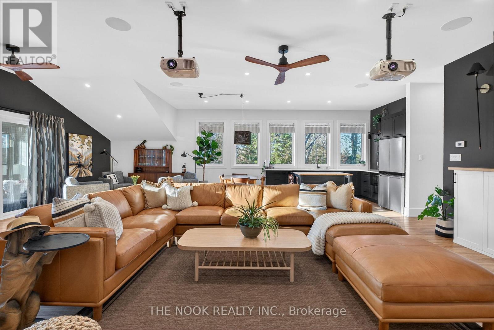 A rare waterfront estate offering uncompromising luxury, privacy, and multi-generational versatility, this fully reimagined residence presents a refined lakeside lifestyle defined by architectural clarity, elevated design, and exceptional south-facing views. Rebuilt in 2023 with over $1M in curated upgrades, the home blends modern sophistication with effortless livability, delivering comfort, scale, and understated elegance. Expansive principal living spaces are anchored by picturesque lake-facing windows that flood the interior with natural light and open to a composite terrace designed for quiet mornings, sunset entertaining, and year-round connection to the water. The kitchen is executed with precision and restraint, featuring quartz surfaces, an oversized island, premium appliances, and bespoke cabinetry integrated into the open-concept layout. Designed for privacy and flexibility, the residence includes a serene upper-level loft retreat with kitchenette, bar, and screened-in terrace, along with a fully finished walk-up lower level offering a second kitchen and generous living space, ideal for extended family or discreet guest accommodation. Outdoors, the property is composed as a private waterfront sanctuary with direct lake access, custom dock, expansive entertaining areas, fire feature, hot tub pavilion, and a newly constructed sauna. An unfinished bunkie with hydro offers future potential for guest accommodation, studio, or additional living space. Behind the aesthetics, the home is supported by dual HVAC systems, dual 200-amp service, new septic (2023), upgraded water filtration, spray foam insulation, and integrated security. The insulated three-car garage and workshop adds a WETT-certified fireplace, EV charging, and dedicated workspace with private bath-crafted for those seeking a true waterfront legacy estate. (id:61423)