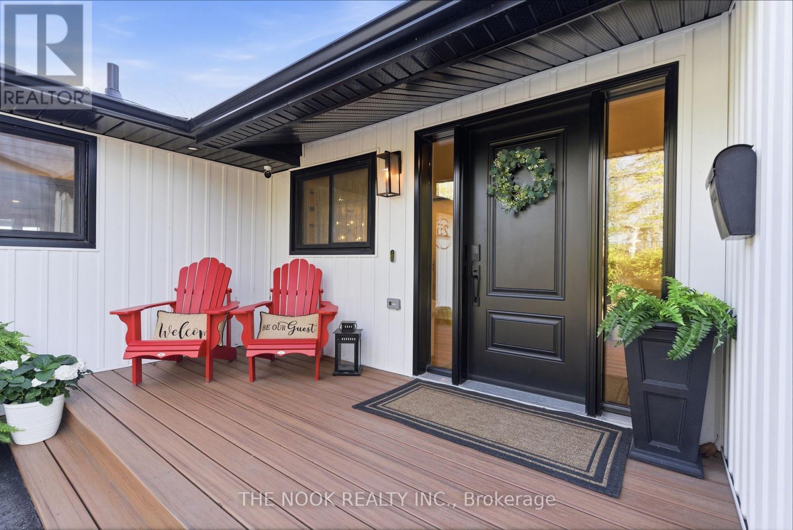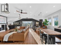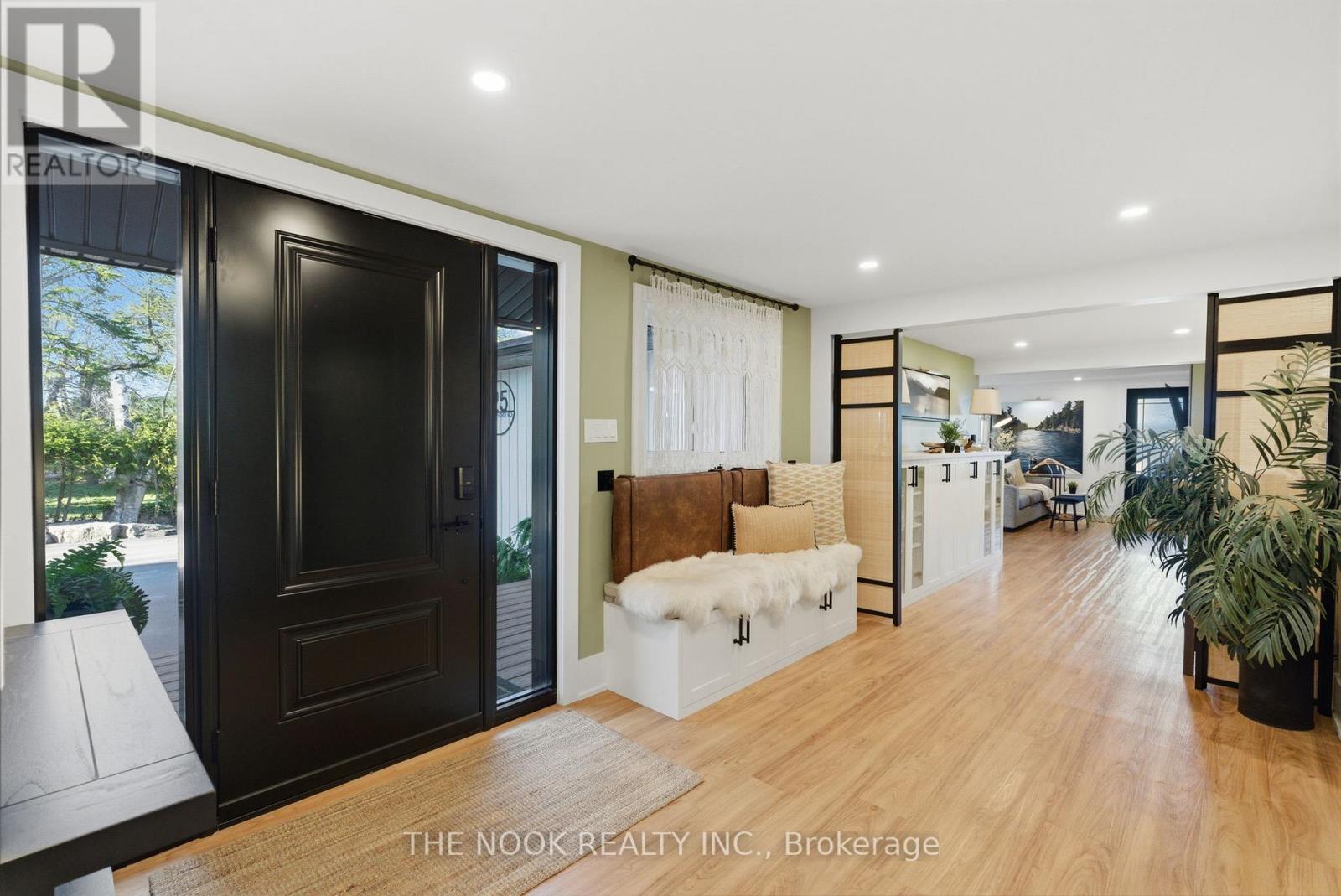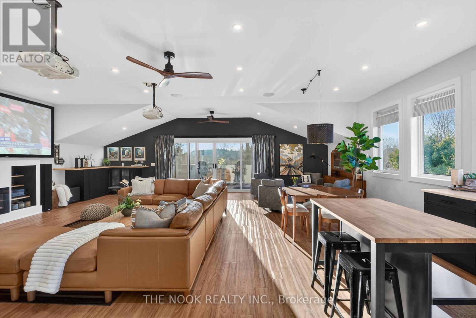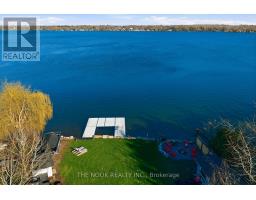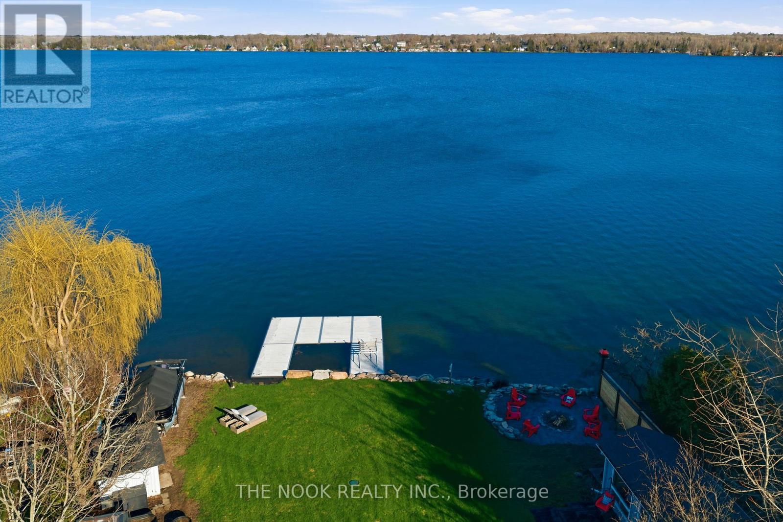 A rare waterfront estate offering uncompromising luxury, privacy, and multi-generational versatility, this fully reimagined residence presents a refined lakeside lifestyle defined by architectural clarity, elevated design, and exceptional south-facing views. Rebuilt in 2023 with over $1M in curated upgrades, the home blends modern sophistication with effortless livability, delivering comfort, scale, and understated elegance. Expansive principal living spaces are anchored by picturesque lake-facing windows that flood the interior with natural light and open to a composite terrace designed for quiet mornings, sunset entertaining, and year-round connection to the water. The kitchen is executed with precision and restraint, featuring quartz surfaces, an oversized island, premium appliances, and bespoke cabinetry integrated into the open-concept layout. Designed for privacy and flexibility, the residence includes a serene upper-level loft retreat with kitchenette, bar, and screened-in terrace, along with a fully finished walk-up lower level offering a second kitchen and generous living space, ideal for extended family or discreet guest accommodation. Outdoors, the property is composed as a private waterfront sanctuary with direct lake access, custom dock, expansive entertaining areas, fire feature, hot tub pavilion, and a newly constructed sauna. An unfinished bunkie with hydro offers future potential for guest accommodation, studio, or additional living space. Behind the aesthetics, the home is supported by dual HVAC systems, dual 200-amp service, new septic (2023), upgraded water filtration, spray foam insulation, and integrated security. The insulated three-car garage and workshop adds a WETT-certified fireplace, EV charging, and dedicated workspace with private bath-crafted for those seeking a true waterfront legacy estate. (id:61423)