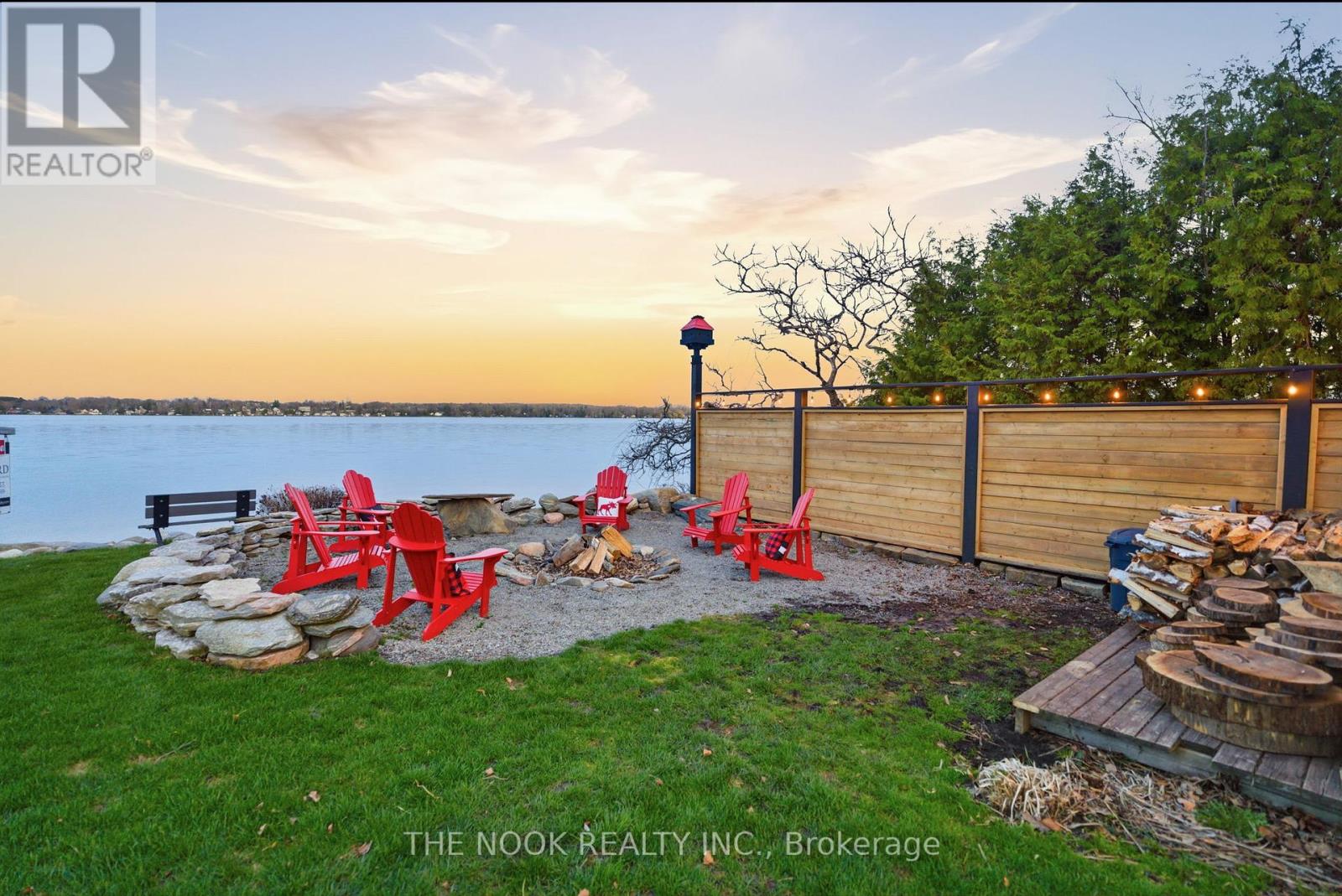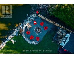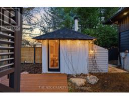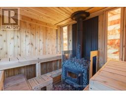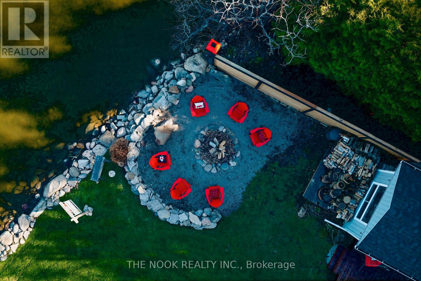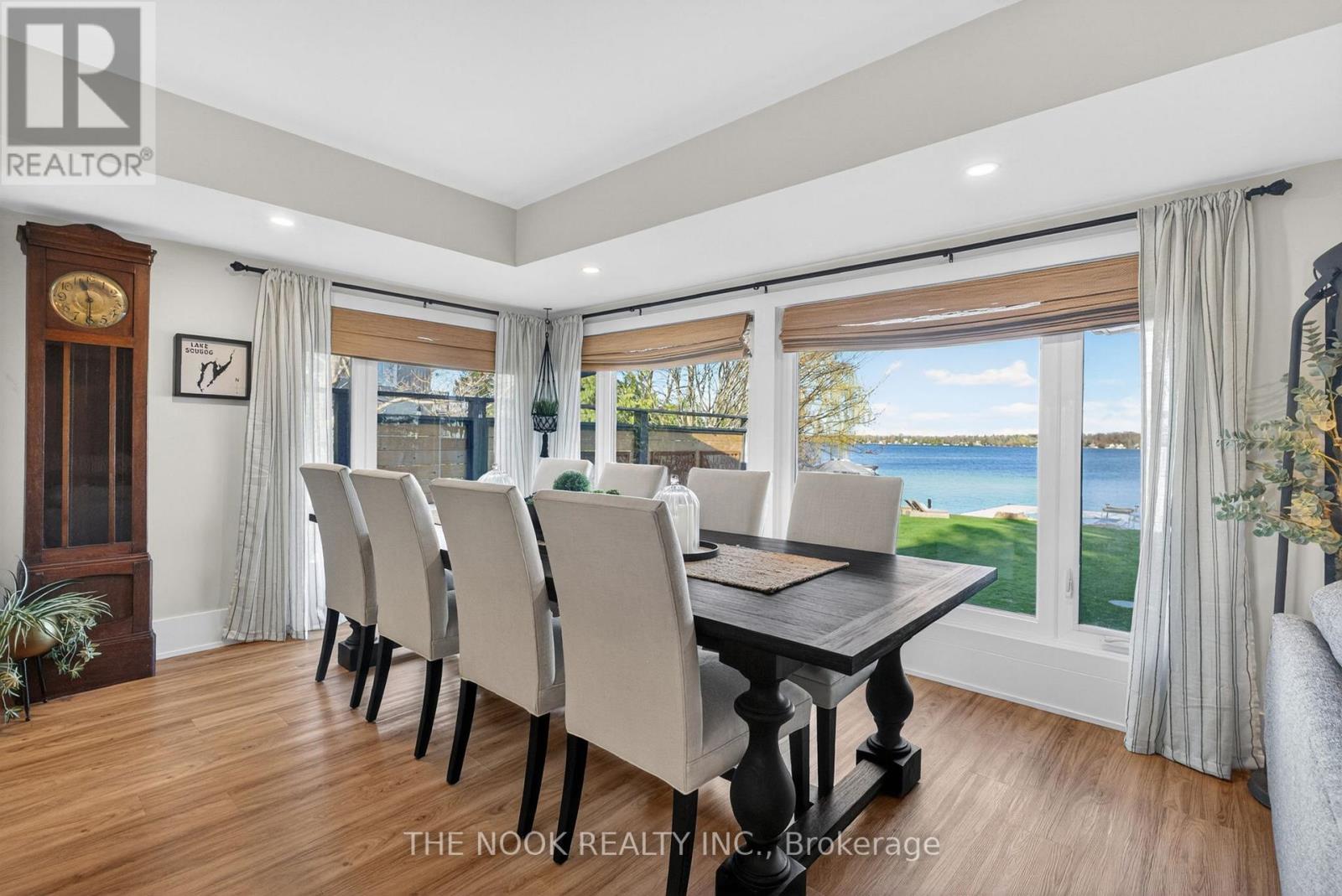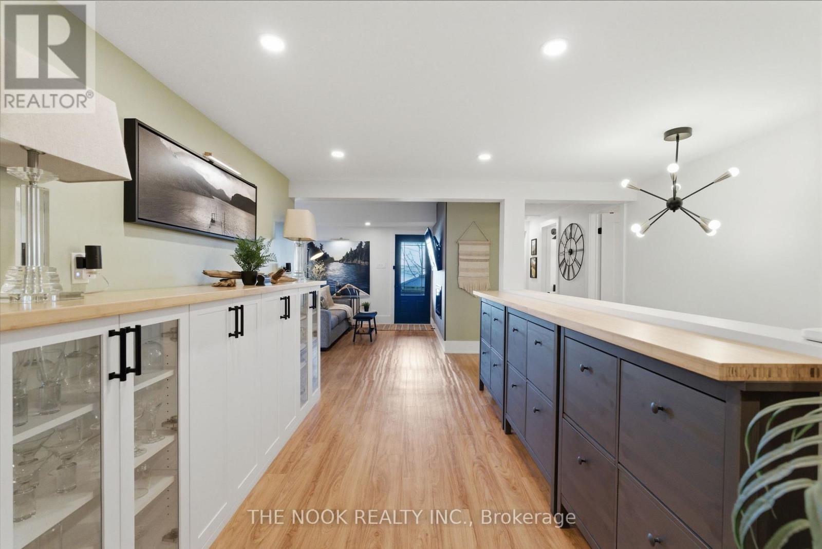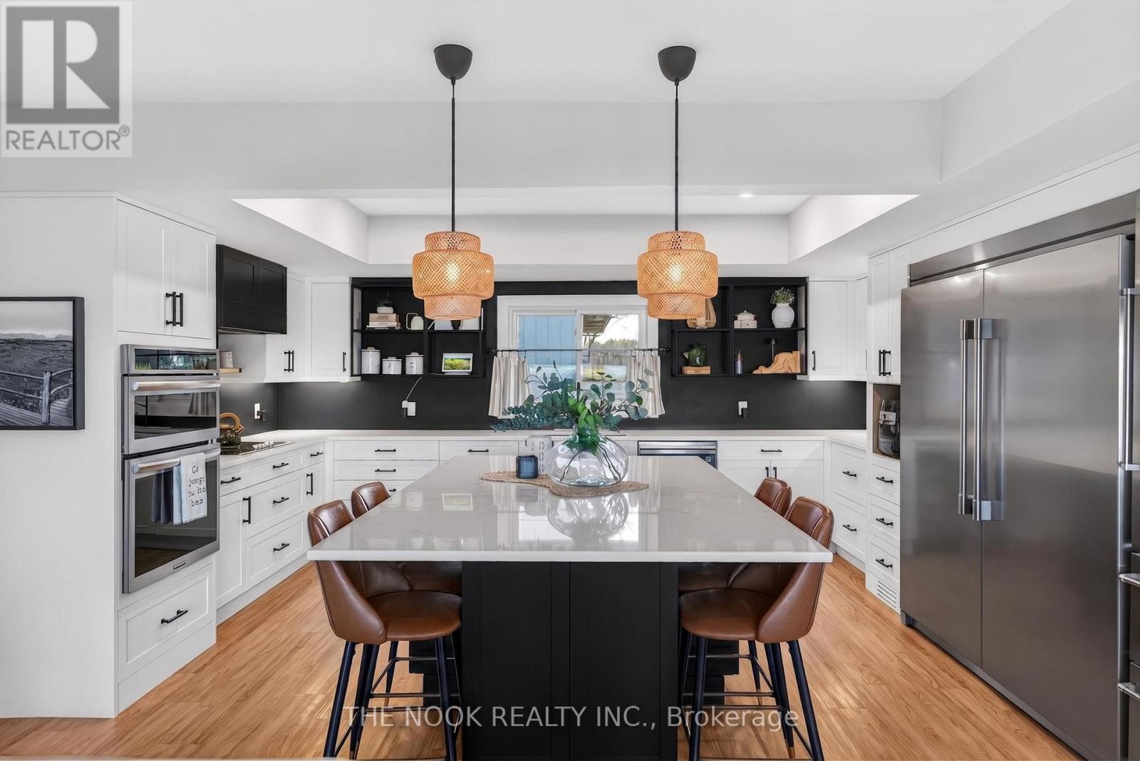A rare waterfront estate offering uncompromising luxury, privacy, and multi-generational versatility, this fully reimagined residence presents a refined lakeside lifestyle defined by architectural clarity, elevated design, and exceptional south-facing views. Rebuilt in 2023 with over $1M in curated upgrades, the home blends modern sophistication with effortless livability, delivering comfort, scale, and understated elegance. Expansive principal living spaces are anchored by picturesque lake-facing windows that flood the interior with natural light and open to a composite terrace designed for quiet mornings, sunset entertaining, and year-round connection to the water. The kitchen is executed with precision and restraint, featuring quartz surfaces, an oversized island, premium appliances, and bespoke cabinetry integrated into the open-concept layout. Designed for privacy and flexibility, the residence includes a serene upper-level loft retreat with kitchenette, bar, and screened-in terrace, along with a fully finished walk-up lower level offering a second kitchen and generous living space, ideal for extended family or discreet guest accommodation. Outdoors, the property is composed as a private waterfront sanctuary with direct lake access, custom dock, expansive entertaining areas, fire feature, hot tub pavilion, and a newly constructed sauna. An unfinished bunkie with hydro offers future potential for guest accommodation, studio, or additional living space. Behind the aesthetics, the home is supported by dual HVAC systems, dual 200-amp service, new septic (2023), upgraded water filtration, spray foam insulation, and integrated security. The insulated three-car garage and workshop adds a WETT-certified fireplace, EV charging, and dedicated workspace with private bath-crafted for those seeking a true waterfront legacy estate. (id:61423)