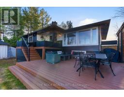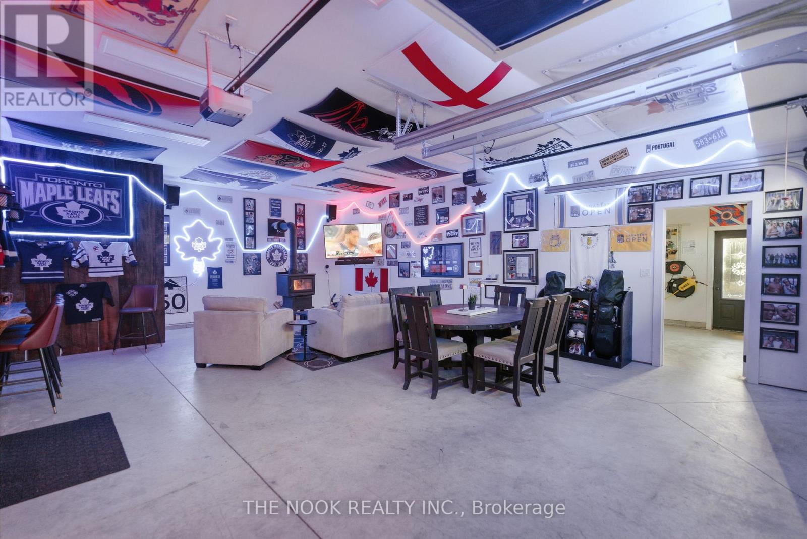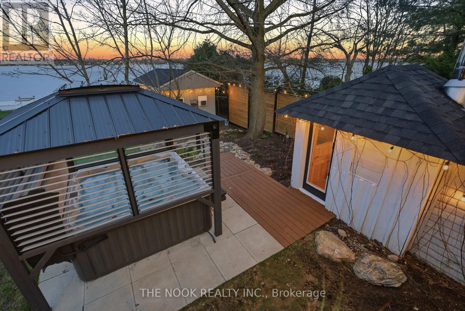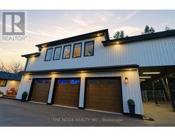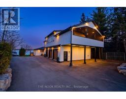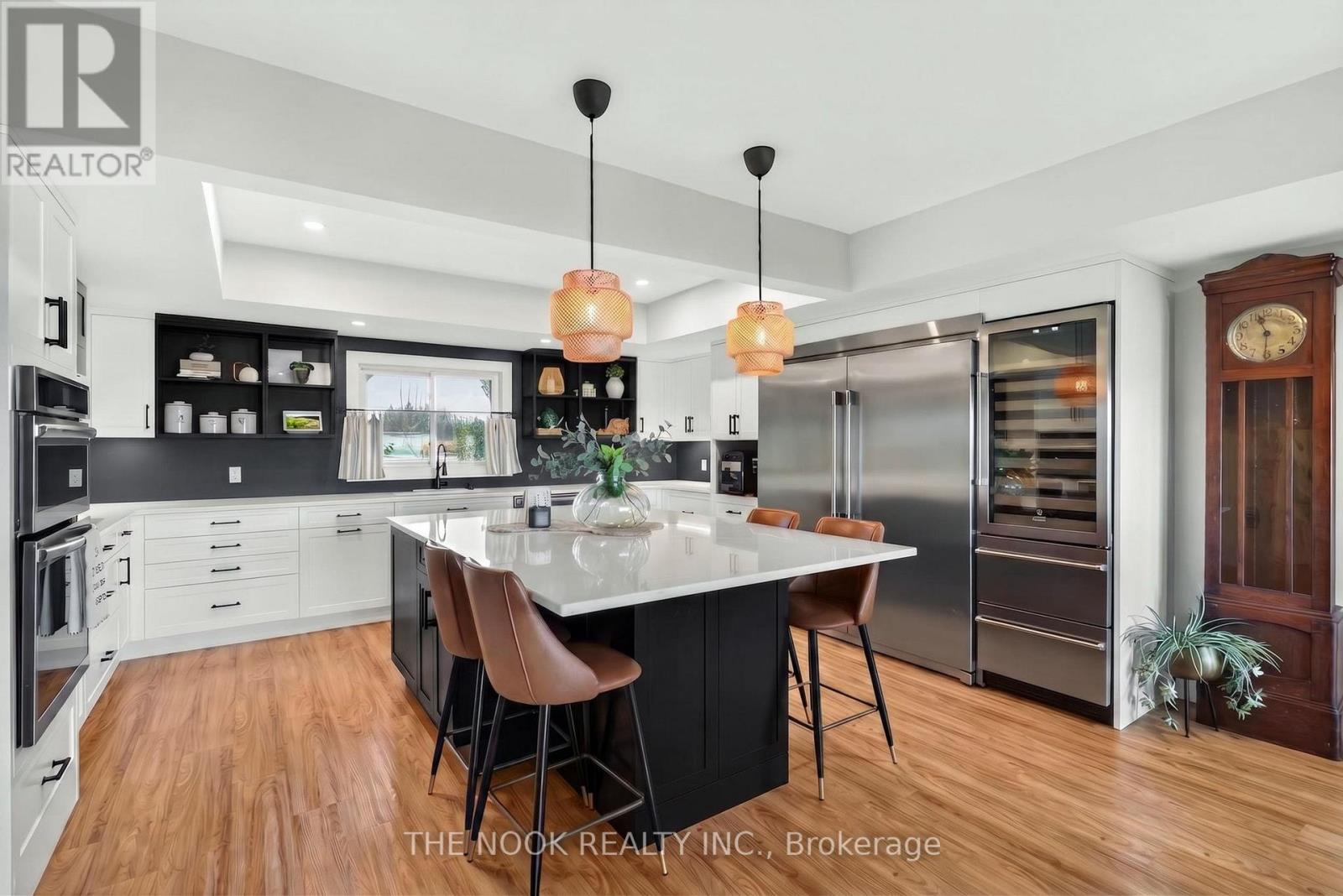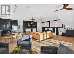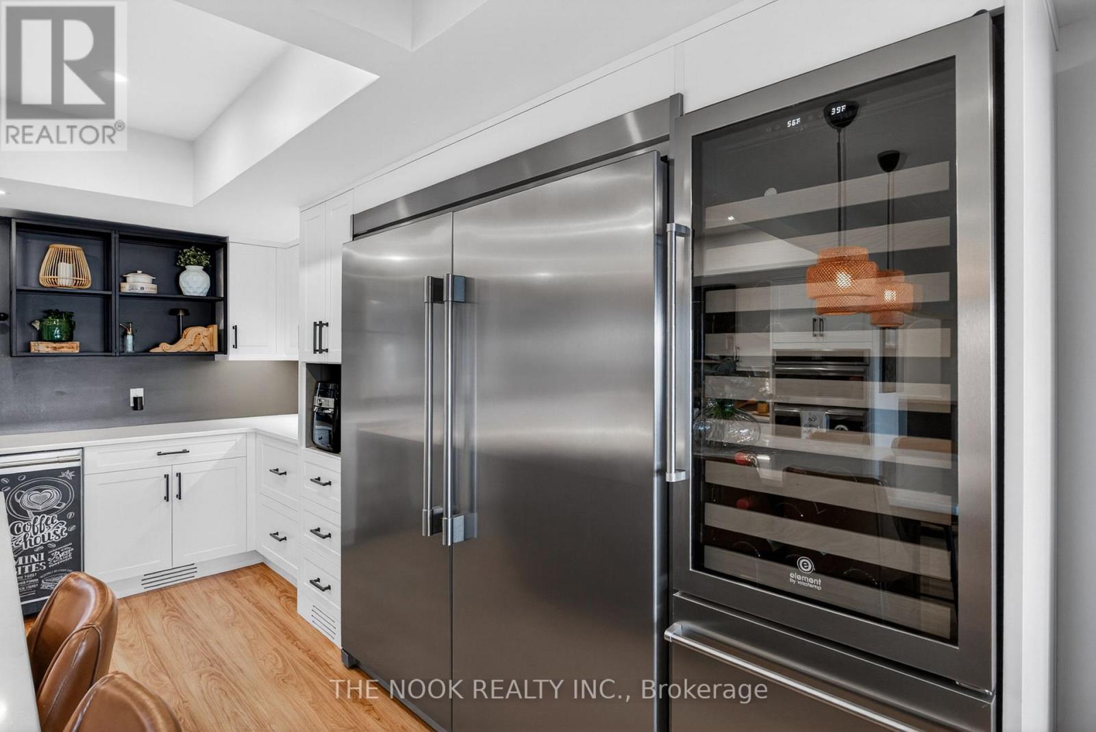 A rare waterfront estate offering uncompromising luxury, privacy, and multi-generational versatility, this fully reimagined residence presents a refined lakeside lifestyle defined by architectural clarity, elevated design, and exceptional south-facing views. Rebuilt in 2023 with over $1M in curated upgrades, the home blends modern sophistication with effortless livability, delivering comfort, scale, and understated elegance. Expansive principal living spaces are anchored by picturesque lake-facing windows that flood the interior with natural light and open to a composite terrace designed for quiet mornings, sunset entertaining, and year-round connection to the water. The kitchen is executed with precision and restraint, featuring quartz surfaces, an oversized island, premium appliances, and bespoke cabinetry integrated into the open-concept layout. Designed for privacy and flexibility, the residence includes a serene upper-level loft retreat with kitchenette, bar, and screened-in terrace, along with a fully finished walk-up lower level offering a second kitchen and generous living space, ideal for extended family or discreet guest accommodation. Outdoors, the property is composed as a private waterfront sanctuary with direct lake access, custom dock, expansive entertaining areas, fire feature, hot tub pavilion, and a newly constructed sauna. An unfinished bunkie with hydro offers future potential for guest accommodation, studio, or additional living space. Behind the aesthetics, the home is supported by dual HVAC systems, dual 200-amp service, new septic (2023), upgraded water filtration, spray foam insulation, and integrated security. The insulated three-car garage and workshop adds a WETT-certified fireplace, EV charging, and dedicated workspace with private bath-crafted for those seeking a true waterfront legacy estate. (id:61423)