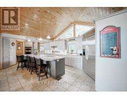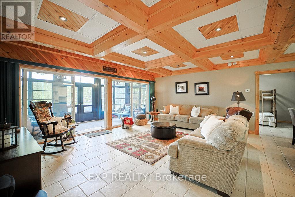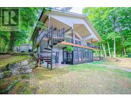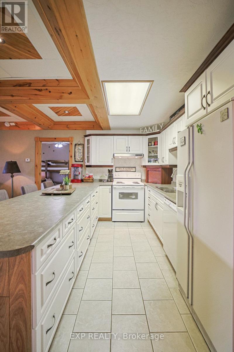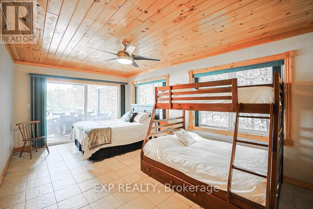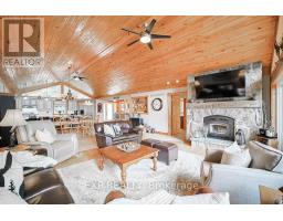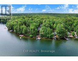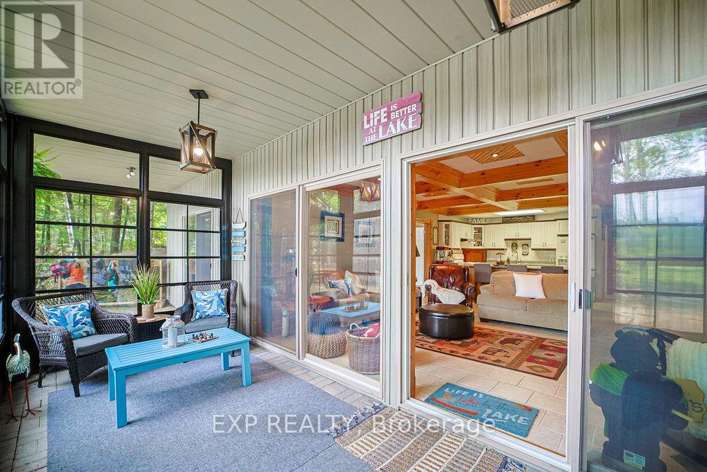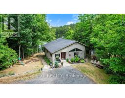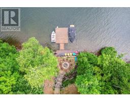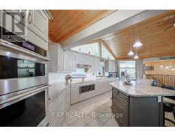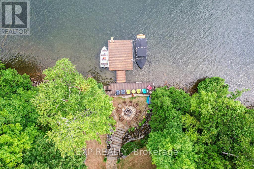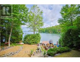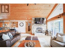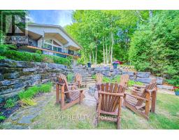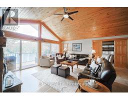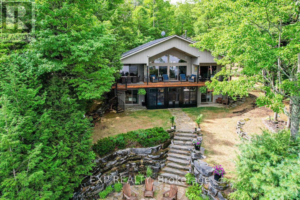 Chandos Lake, Custom-built, open-concept cottage features cathedral ceilings, a handcrafted stone fireplace, radiant floor heating on both levels, and a chef's kitchen with granite countertops and built-in appliances. Multiple walkouts lead to expansive decks and patios overlooking the lake, a sandy walk-in shoreline with deep swimming, dock lift system, and a beautiful stone fire pit area right by the water. This home provides a perfect balance of nature with contemporary living. Offering over 3,000 sq. ft. of finished living space, the cottage features four large, inviting bedrooms and three well-equipped bathrooms including a 4-piece ensuite, easily accommodating family and guests. The beautifully finished basement is complete with a private office and full kitchen with island. Rec Room walks out to a fully screened room and grants easy access to the expansive property and the lakefront. Garage 25'x40'x18' Steel Construction, Insulted with water & septic hook up. Chandos Lake is a deep clean lake with great fishing and boating opportunities and is conveniently connected to ATV and Snowmobile trails for year round enjoyment. This property is the perfect setting for creating lasting family memories, whether you're playing in or on the water, fishing off the dock, or simply relaxing in the comfort of your well-appointed cottage. (id:61423)