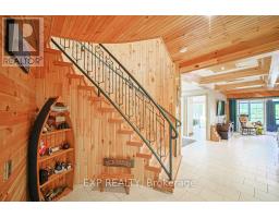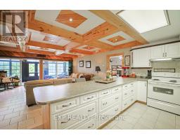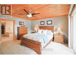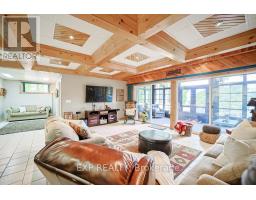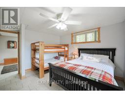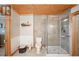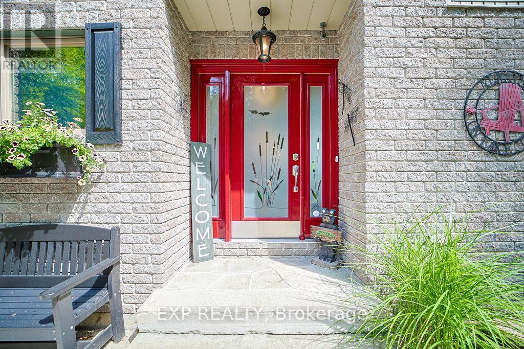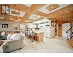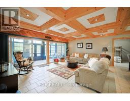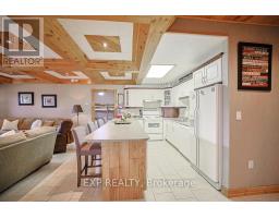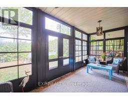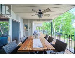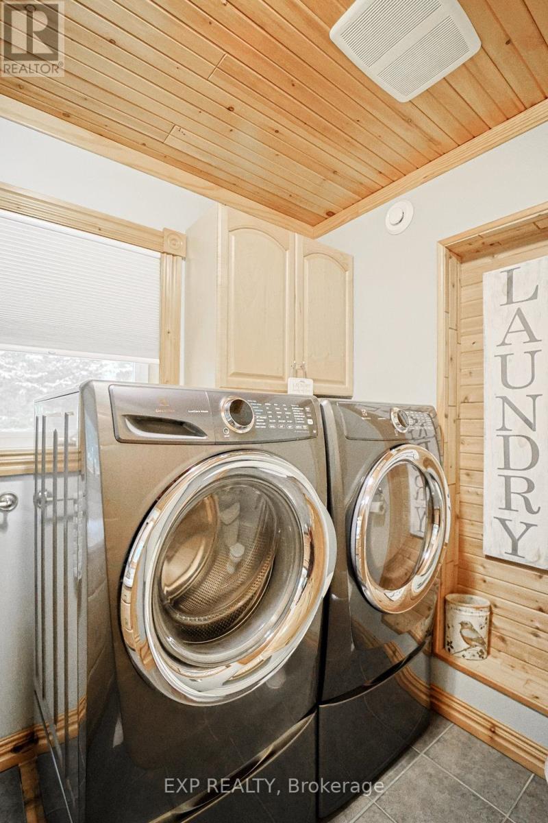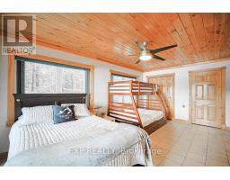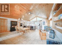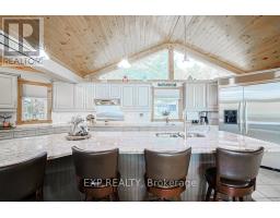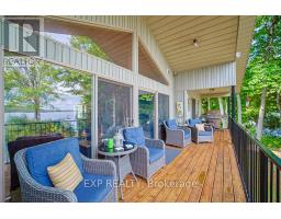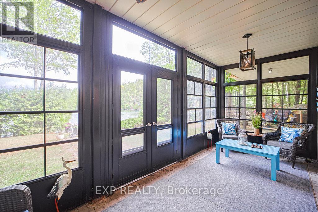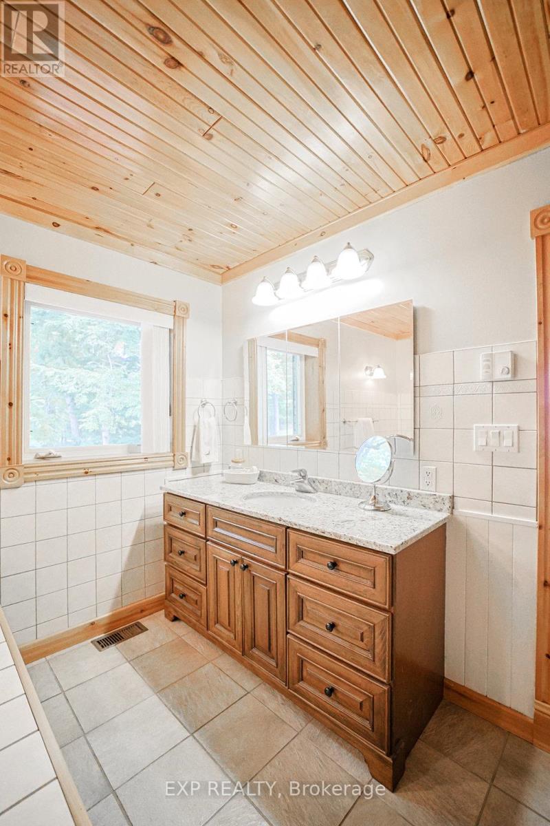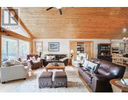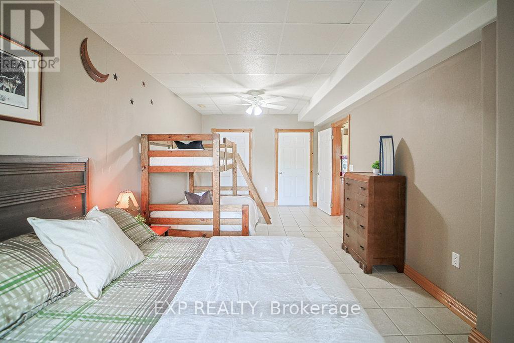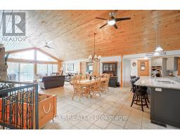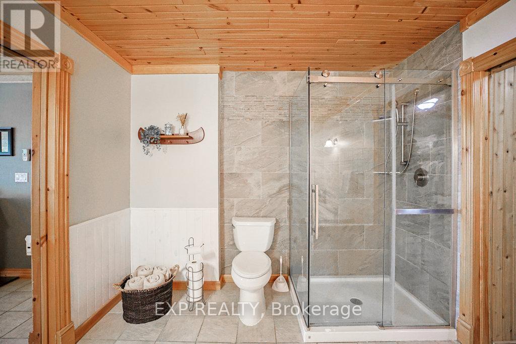Chandos Lake, Custom-built, open-concept cottage features cathedral ceilings, a handcrafted stone fireplace, radiant floor heating on both levels, and a chef's kitchen with granite countertops and built-in appliances. Multiple walkouts lead to expansive decks and patios overlooking the lake, a sandy walk-in shoreline with deep swimming, dock lift system, and a beautiful stone fire pit area right by the water. This home provides a perfect balance of nature with contemporary living. Offering over 3,000 sq. ft. of finished living space, the cottage features four large, inviting bedrooms and three well-equipped bathrooms including a 4-piece ensuite, easily accommodating family and guests. The beautifully finished basement is complete with a private office and full kitchen with island. Rec Room walks out to a fully screened room and grants easy access to the expansive property and the lakefront. Garage 25'x40'x18' Steel Construction, Insulted with water & septic hook up. Chandos Lake is a deep clean lake with great fishing and boating opportunities and is conveniently connected to ATV and Snowmobile trails for year round enjoyment. This property is the perfect setting for creating lasting family memories, whether you're playing in or on the water, fishing off the dock, or simply relaxing in the comfort of your well-appointed cottage. (id:61423)