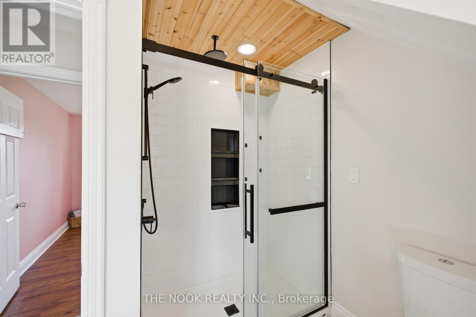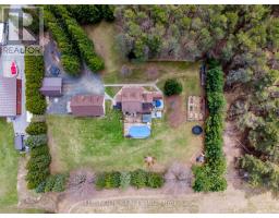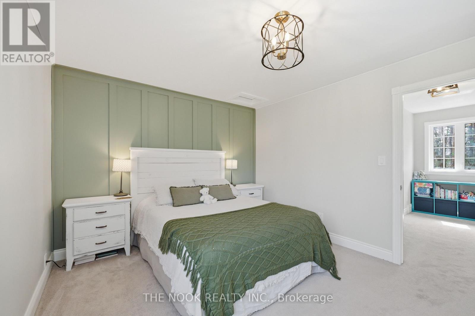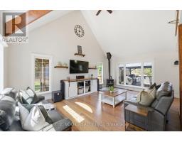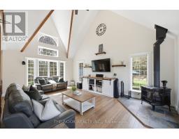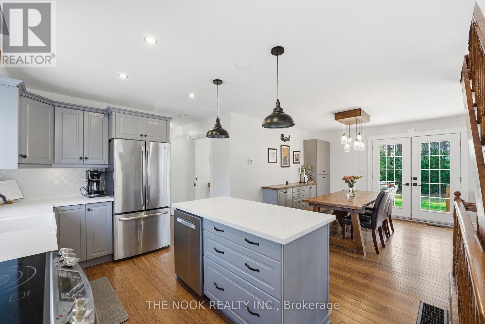 Welcome to this exceptional 1.53 acre property, beautifully introduced by a picturesque tree-lined driveway. Thoughtfully designed and impeccably maintained, this property offers a rare blend of elevated living, versatility, and serene outdoor lifestyle. Inside, the home showcases bamboo flooring throughout the principal living areas, anchored by a fully updated kitchen featuring quartz countertops and stainless steel appliances. The living room is defined by soaring 18-ft ceilings and a cozy wood-burning fireplace, creating an elegant yet inviting space to gather. The main level offers a spacious primary suite, full 4 piece bath, and convenient main level laundry, while the upper level provides two additional bedrooms, a gorgeous 3-piece bath with cedar and glass details, and a versatile flex space suitable for a convenient home office. A fully self-contained lower-level suite offers exceptional flexibility for multi-generational living or income potential, complete with a private entrance, dedicated laundry, heated bathroom floors, soundproofed ceiling, and separate heating system. Outdoors, the property truly shines as a private retreat. Enjoy a beautifully curated setting with mature trees, a large entertaining deck, hot tub, and above-ground pool. Thoughtful additions such as raised garden beds and an inviting firepit area create spaces to relax, gather, and enjoy the natural surroundings. The detached heated garage with workshop and finished upper-level loft space adds further lifestyle and future potential, complemented by additional outbuildings for storage and hobby use. A rare offering that seamlessly combines privacy, function, and refined country living-ideal for those seeking space, flexibility, and convenient access to HWY115 and 407. (id:61423)