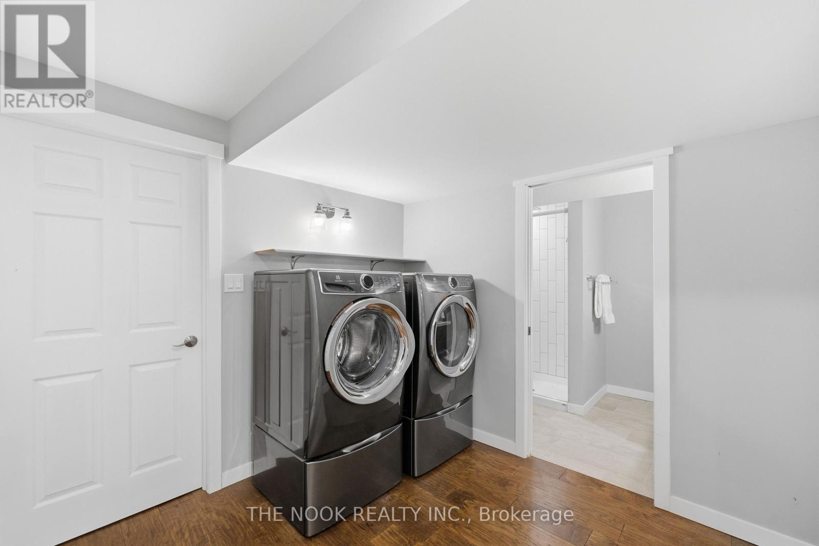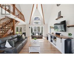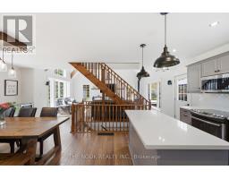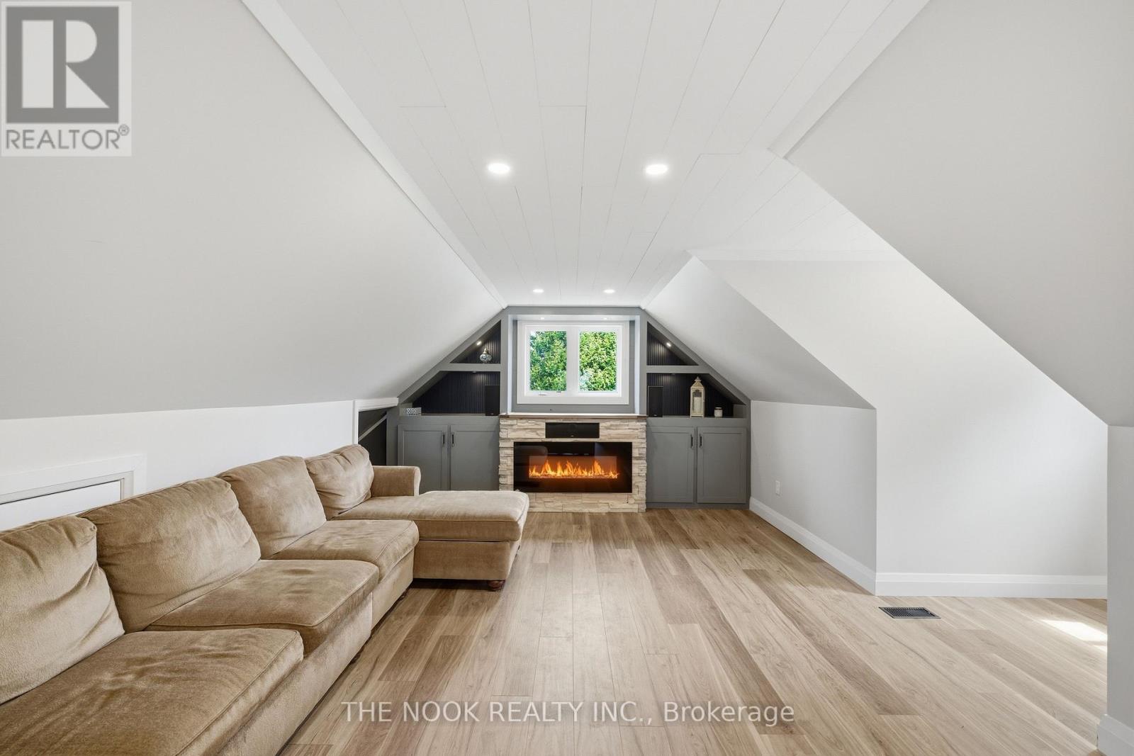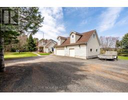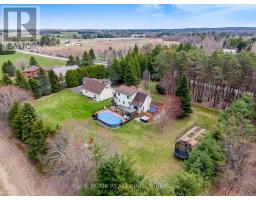 Welcome to this exceptional 1.53 acre property, beautifully introduced by a picturesque tree-lined driveway. Thoughtfully designed and impeccably maintained, this property offers a rare blend of elevated living, versatility, and serene outdoor lifestyle. Inside, the home showcases bamboo flooring throughout the principal living areas, anchored by a fully updated kitchen featuring quartz countertops and stainless steel appliances. The living room is defined by soaring 18-ft ceilings and a cozy wood-burning fireplace, creating an elegant yet inviting space to gather. The main level offers a spacious primary suite, full 4 piece bath, and convenient main level laundry, while the upper level provides two additional bedrooms, a gorgeous 3-piece bath with cedar and glass details, and a versatile flex space suitable for a convenient home office. A fully self-contained lower-level suite offers exceptional flexibility for multi-generational living or income potential, complete with a private entrance, dedicated laundry, heated bathroom floors, soundproofed ceiling, and separate heating system. Outdoors, the property truly shines as a private retreat. Enjoy a beautifully curated setting with mature trees, a large entertaining deck, hot tub, and above-ground pool. Thoughtful additions such as raised garden beds and an inviting firepit area create spaces to relax, gather, and enjoy the natural surroundings. The detached heated garage with workshop and finished upper-level loft space adds further lifestyle and future potential, complemented by additional outbuildings for storage and hobby use. A rare offering that seamlessly combines privacy, function, and refined country living-ideal for those seeking space, flexibility, and convenient access to HWY115 and 407. (id:61423)