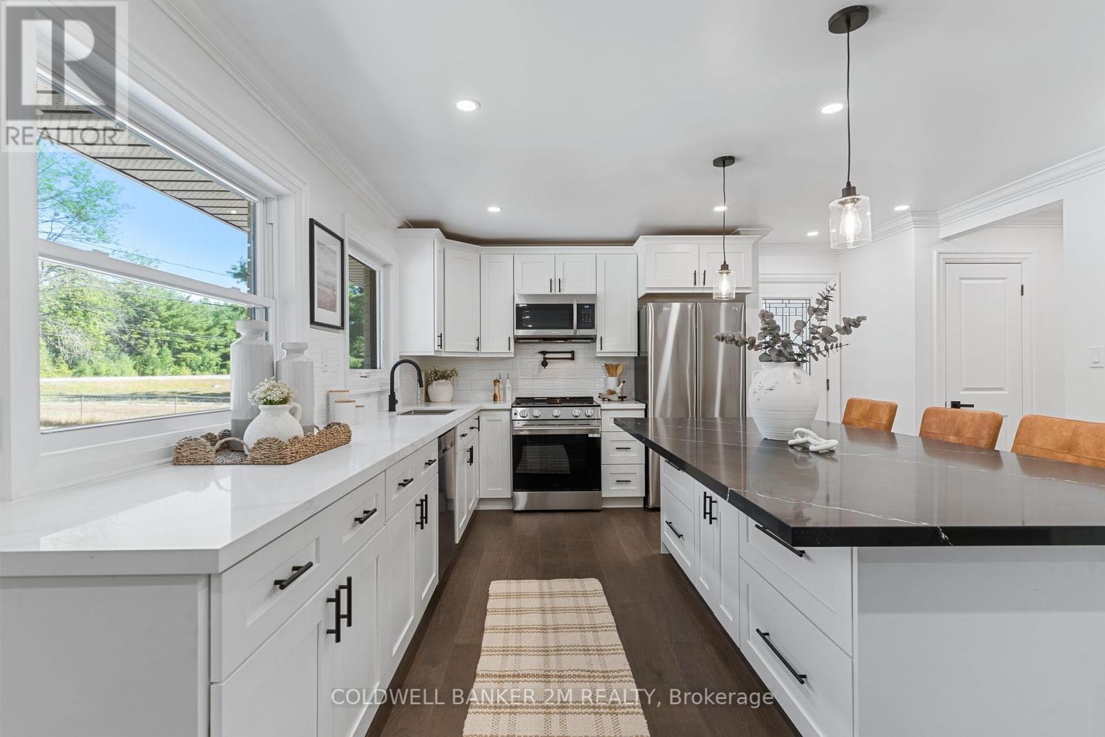 Open House This Friday, October 10th from 5pm to 8pm & Monday, October 13th from 2-4pm. See You There! Country Living Meets Modern Comfort in Coboconk! Welcome to this stunning 3-bedroom bungalow, perfectly nestled on a large, fully fenced lot in the peaceful town of Coboconk. With easy access to Lindsay, Orillia, Minden, and Haliburton, this beautiful home offers the ideal blend of tranquil country living and all the modern conveniences your family needs. Step inside through the charming wood-frame front entrance and greeted by a bright, open-concept layout thats perfect for everyday living and entertaining. The kitchen is truly a dream featuring gleaming quartz countertops, stainless steel appliances, a stylish tiled backsplash, and an abundance of cupboard and counter space for all your culinary needs. The cozy living and dining area includes a fireplace and a large window that fills the space with natural light. Walk out from the spacious primary bedroom, which features double closets, to your private deck, an ideal spot to enjoy your morning coffee surrounded by trees and nature. Two additional bedrooms offer large windows and ample closet space, while the main bathroom is finished with double sinks and modern fixtures. A conveniently located laundry area adds to the homes functionality. The attached single-car garage includes an insulated door and direct access to both the house and the backyard. For extra storage or hobbies, theres a large shed on a poured concrete pad complete with covered overhangs on each side. This home features an updated hydro panel, generator hook-up capability right at the meter, and a brand new, energy-efficient heat pump system for year-round comfort. Located just minutes to town amenities including schools, gas station, shopping and Highway 35. This move-in-ready gem is the perfect place to call home! (id:61423)