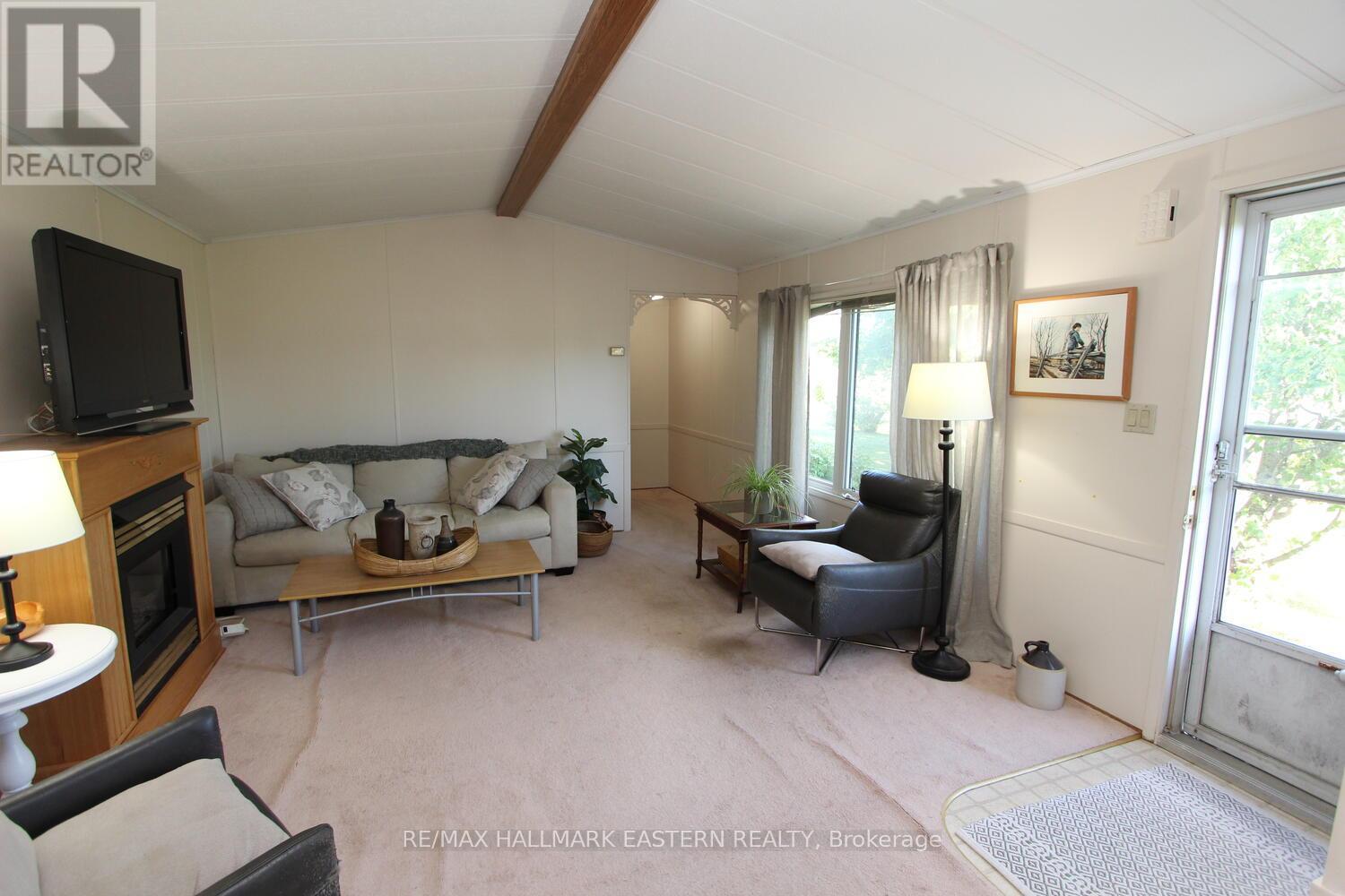 Welcome to peaceful, low-maintenance living in the popular community of Sama Park, which is perfect for downsizing or retirement! This 2-bedroom, 2-bathroom home is located just minutes from Crowe Lake, Belmont Lake, Round Lake, and Trent River boat launches, which is ideal for boating and fishing. Designed with comfort and convenience in mind, the layout offers privacy with a bedroom and full 4-piece bath at each end of the home. The large, bright living room has a cozy propane fireplace and walkout to the yard, while the eat-in kitchen provides ample cupboards and drawer space for easy everyday living.There's also a welcoming foyer with in-unit laundry and access to a sunroom/mudroom, plus a huge covered porch - perfect for enjoying warm summer days in the shade. A detached, garage (approx. 20x16) offers great storage or workshop potential. Immediate closing available. New Fees 717.17/month (includes land lease, taxes, water). (id:61423)