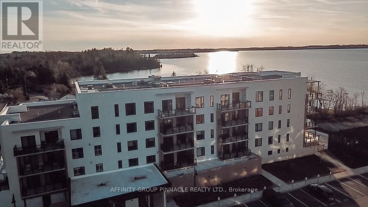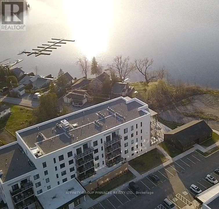 Welcome to sought-after Fenelon Falls and the exclusive waterfront community of Fenelon Falls Club. Situated in Balsam House, this immaculate third-floor corner suite overlooks the sparkling shores of Cameron Lake. Designed with intention, this residence features exceptional upgrades and elevated finishes throughout. Built in 2023, this bright and airy 2 bedroom, 2 bath residence offers open-concept living, two walk-outs to your private balcony, and breathtaking sunset views that make every evening feel like a getaway. The thoughtfully designed interior showcases a stunning kitchen with island, elegant finishes, recessed lighting, and a cozy fireplace that anchors the living space. The serene primary suite offers its own walk-out access - the perfect place to begin and end your day with peaceful lake views. Enjoy true maintenance free lake life - no snow shoveling, no landscaping, no grass cutting- just lock and leave convenience and more time to enjoy what matters. Residents benefit from premium amenities including indoor parking and locker, clubhouse, fitness centre, outdoor pool, tennis and pickleball courts, bike storage, dog wash station, guest parking and more. Steps to the historic Trent Severn Waterway, Lock 34 and the charming downtown shops, dining, golf and trails of Fenelon Falls - all just 90 minutes to the GTA. Refined, Relaxed waterfront living at its finest. (id:61423)