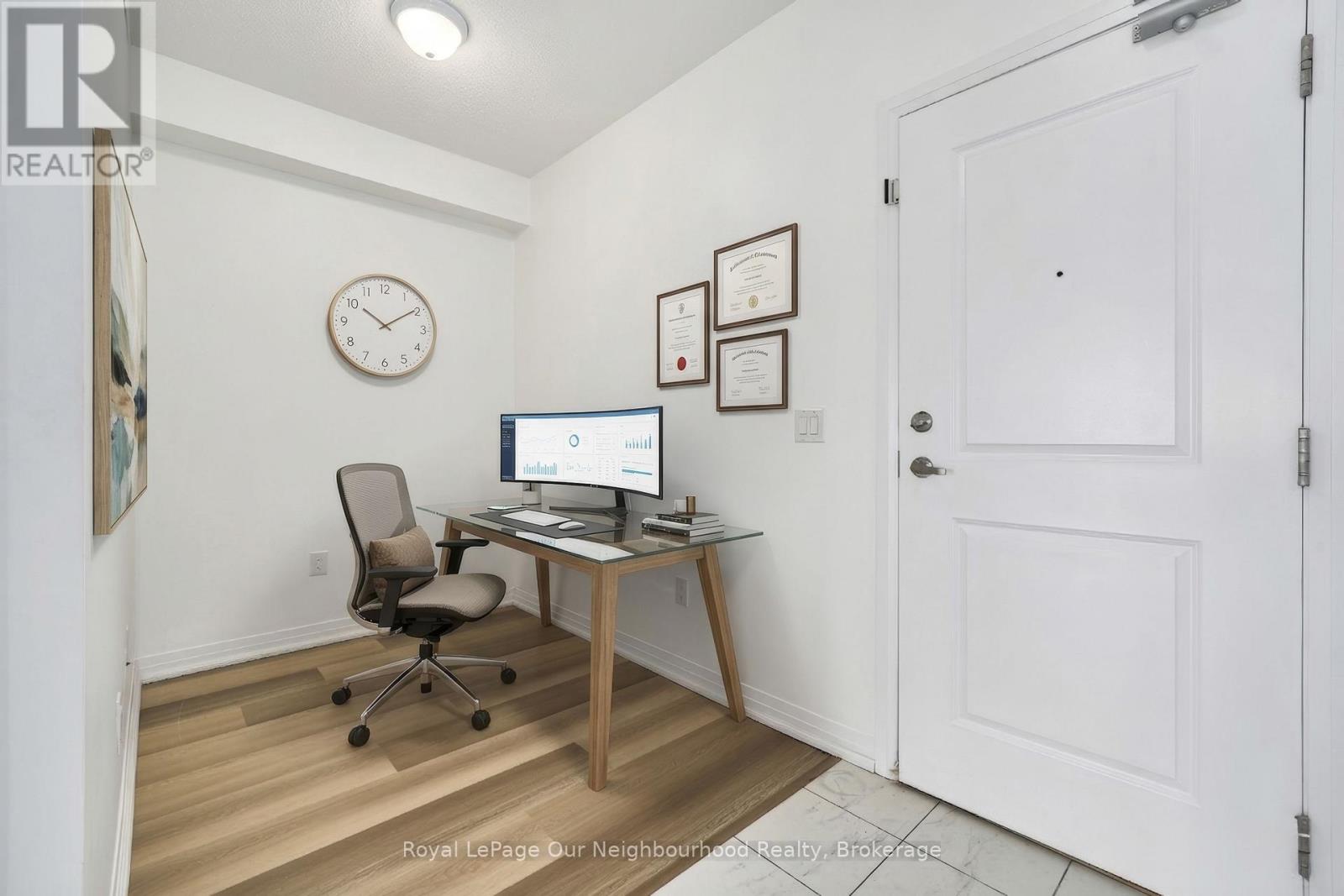 Wake up to breathtaking water views in this beautifully designed condo in the Port of Newcastle. This Cape Cod-inspired one-bedroom plus den unit offers a refined waterfront lifestyle with a modern and open-concept living space. The interior features 9-foot ceilings, wide-plank laminate flooring, and a modern chef's kitchen equipped with granite countertops, stainless steel appliances, and an expansive breakfast bar. The primary bedroom offers a peaceful retreat with generous closet space and a private ensuite bathroom. The versatile den provides the ideal space for a home office, guest area, or creative studio. With two full bathrooms, convenience and privacy are never compromised. Step out onto your private balcony and enjoy morning coffee or evening sunsets overlooking the water - your own personal escape right at home. Located in a desirable community close to amenities, transit, and waterfront trails, this condo is perfect for professionals, couples or empty nesters looking to enjoy turnkey condo life. Residents enjoy exclusive access to the Admirals Walk Clubhouse, which boasts a fitness centre, indoor pool, and theatre room, all situated just steps from the natural shoreline and scenic walking trails. Easy access from Highway 401 and 407. Come see this stunning unit today! (id:61423)