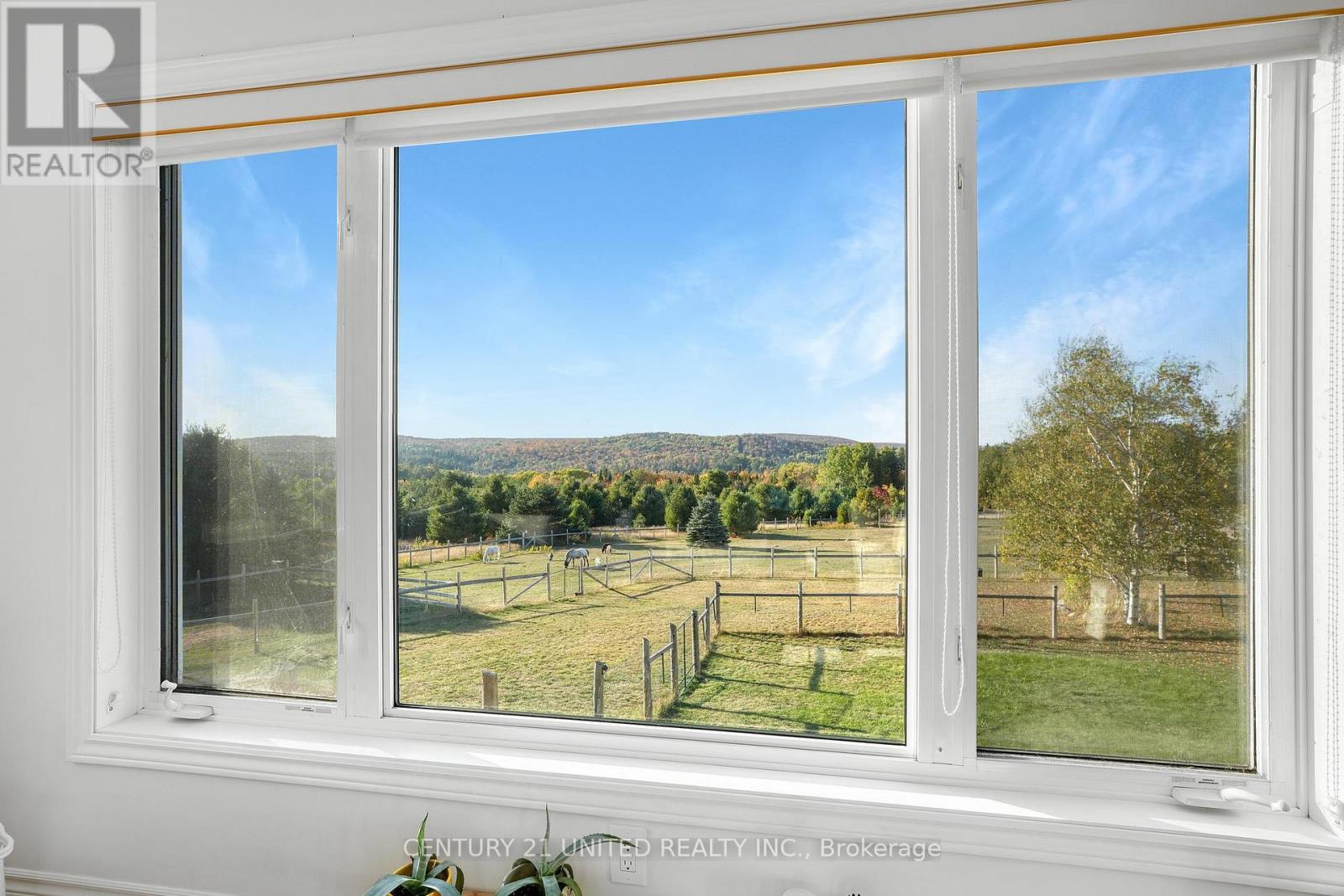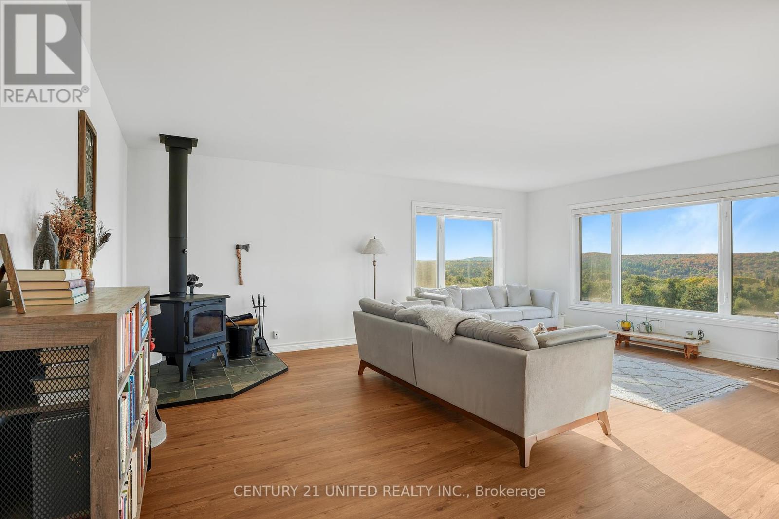 Recently renovated from top to bottom, this lovingly cared for home is expertly located on a beautifully appointed 15 acre lot. One of the most sought after locations in the region with unmatched commanding, panoramic views right from your screened in porch. Offering 4 bedrooms and 3 bathrooms, a tastefully updated kitchen complete with new appliances, a spacious, cozy living room over looking the grounds and capturing the ever changing dynamic views and a comfortable lower level with walk-out and plenty of storage. Outside the three stall run in shed is versatile with three 10x10 stalls, hydro and water year round. One of the stalls is insulated and separated from the other two. This can easily be retrofitted if desired. The 1 acre paddock is well set up for horses with a ring and separate pasture area. The walking trails on the property allow you to appreciate the diverse terrain. The large vegetable garden, with young fruit trees, is fenced in and draws water from the well or from the rain water storage container beside the garage. Some of the recent renovations include, but are not limited to, Starlink (2023), quartz countertops, sinks, faucets, and a carbon filtered drinking water line in the kitchen (2023), a WETT certified wood stove and chimney (2023), a 16'x6' outdoor firewood shed (2023), and metal roofing on the garage and the house (2023/2024). The recently severed 10 acre lot adjacent to this property is also listed and available to make this a true family retreat. (id:61423)