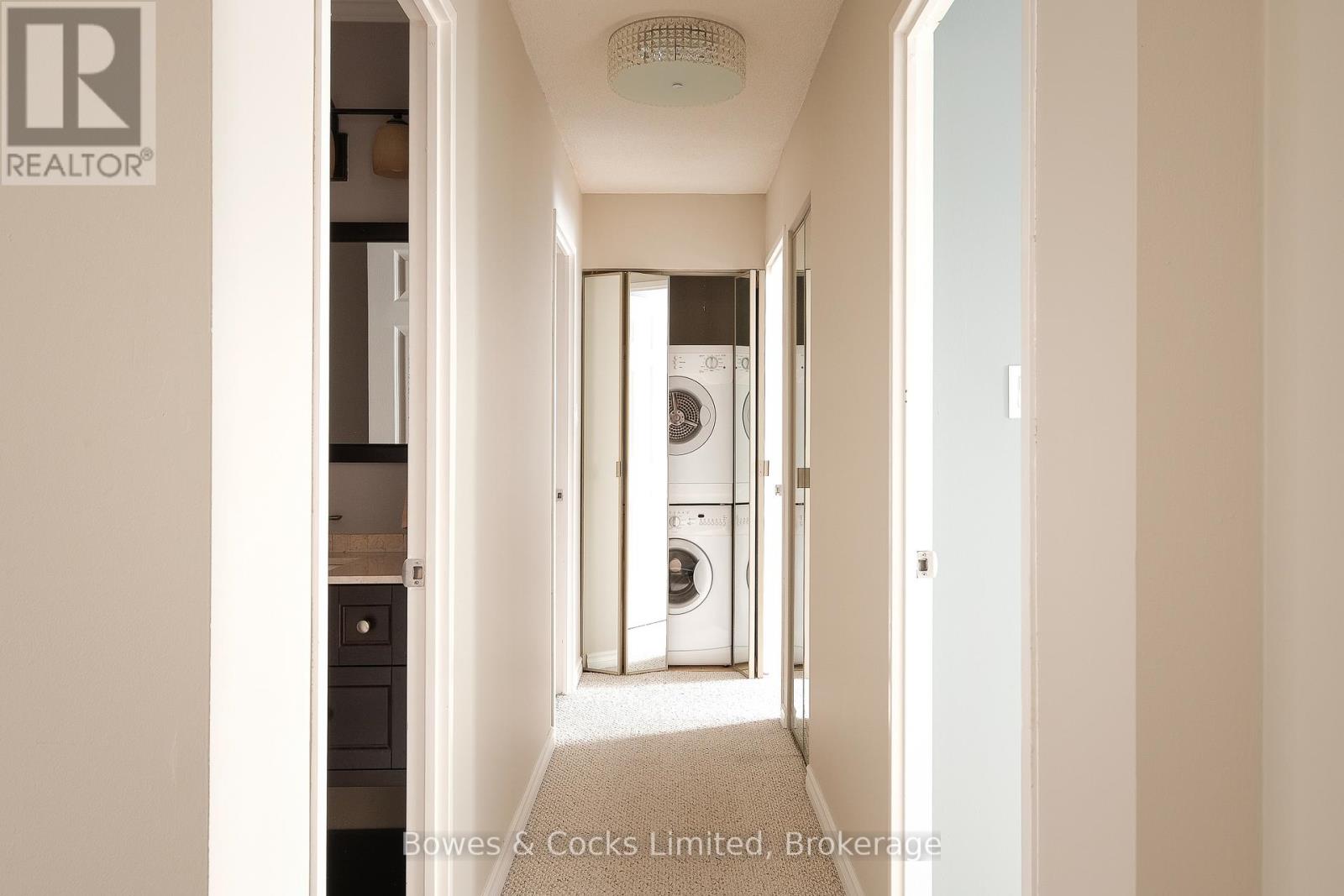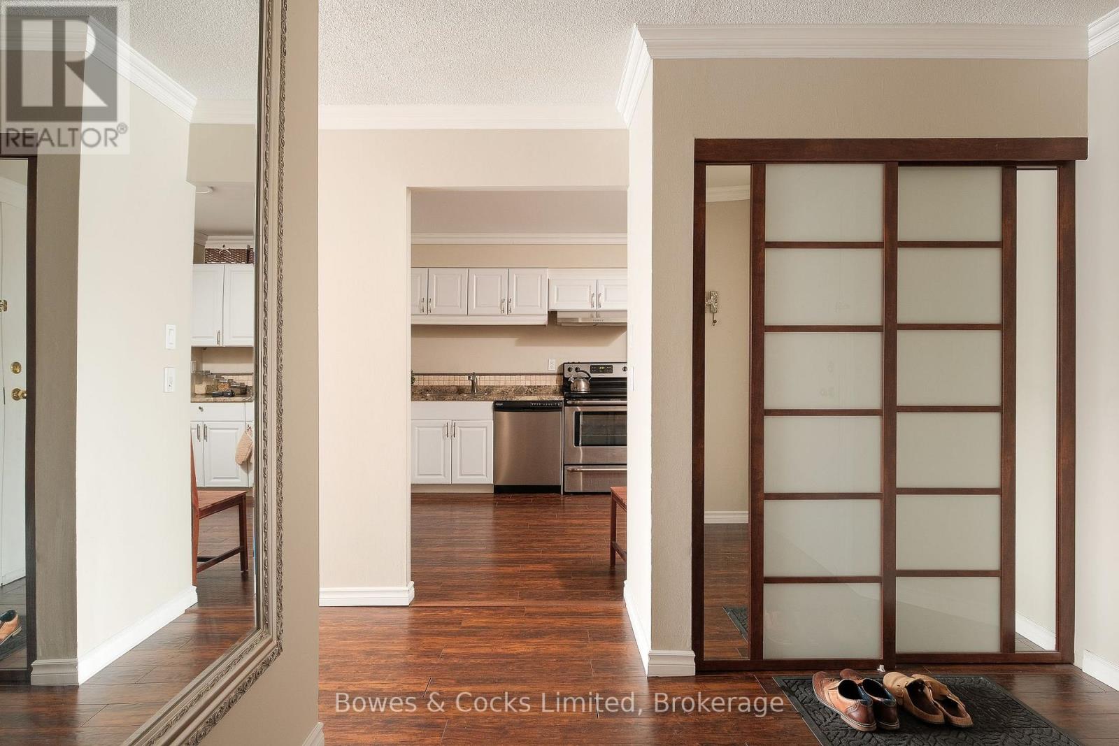 Turnkey, carefree living in style awaits in this beautifully updated 2-bedroom, 2-bathroom condo, ideally located in Peterborough's north end community. Perfect for downsizers or anyone seeking low-maintenance living without compromise, this home is truly move-in ready and in tip-top condition. The bright, west-facing living and dining area is open and inviting, featuring newer flooring, fresh neutral paint, updated lighting, and two large patio doors offering great natural light. The kitchen showcases classic white cabinetry, which is open and functional. Both bathrooms have been tastefully updated with quality finishes. The generous primary bedroom includes a large walk-in closet and convenient semi-ensuite access. Additional highlights include in-suite laundry, a separate storage unit, heated underground parking, and a secure entry system. Residents enjoy excellent shared amenities such as an exercise area, library, common lounge/meeting room, visitor parking, and beautifully landscaped grounds. Ideally situated close to shopping, Riverview Park, public transit, and directly across from the Otonabee River, this is a truly lovely place to call home-offering comfort, convenience, and a carefree lifestyle in one of Peterborough's most desirable condominium communities. (id:61423)