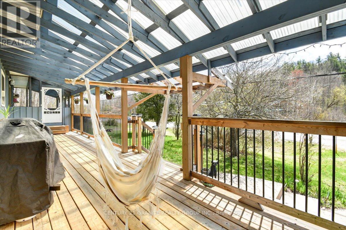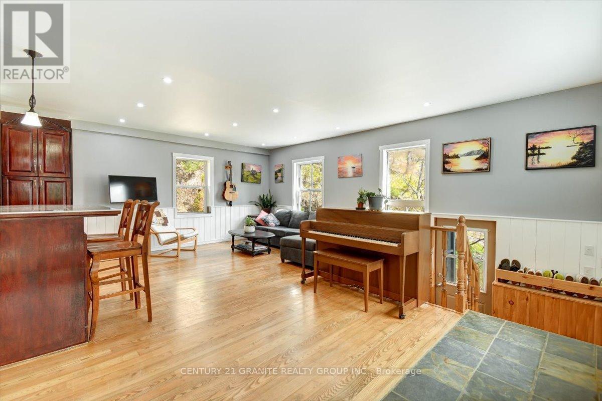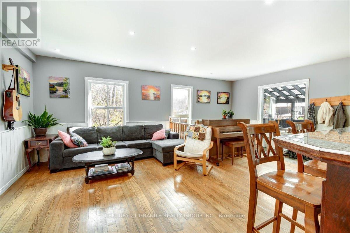 Welcome to 31105 Highway 28 East, a strategically positioned country property offering space, functionality, and strong lifestyle value just minutes from the Town of Bancroft. Set on over half an acre, this location delivers the privacy of rural living with immediate access to amenities. With over 1,700 square feet of bright main floor living, the home is designed for both comfort and efficiency. The open concept kitchen, dining, and living area creates a seamless flow, ideal for everyday living and entertaining. Three well-proportioned bedrooms provide flexibility for families, while the 4-piece bath features a jet tub and separate shower. A sun-filled den with wood stove offers a warm, inviting retreat, complemented by a dedicated office space suited for remote work. Main floor laundry adds convenience, and the large screened-in porch extends usable living space across the seasons. The fully finished lower level expands the footprint with a spacious recreation room featuring a second wood stove, ideal for gatherings or quiet evenings. An additional bedroom provides guest or family flexibility, while a cold room, storage areas, and utility space support organized, practical living. Outdoors, the property is equally functional. A detached workshop, storage building, and shed provide ample space for tools, equipment, and recreational gear, making it well suited for hobbyists and those seeking utility from their land. Well-rounded and value-driven, this property offers a practical opportunity to secure space, flexibility, and lifestyle in the Bancroft market. (id:61423)