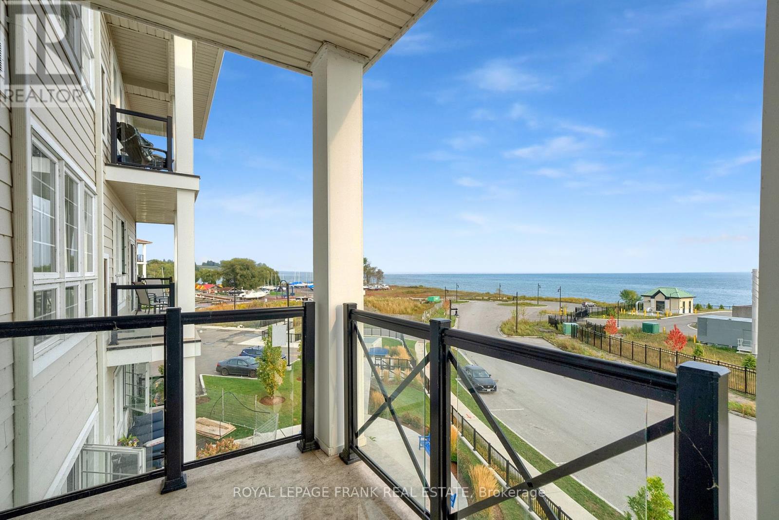 Available Immediately! Experience lakeside living at its finest in this upgraded south facing condo overlooking beautiful Lake Ontario. Enjoy breathtaking views right from your windows and from your large private non shared balcony, perfect for relaxing outdoors. This thoughtfully upgraded unit features a modern kitchen with quartz countertops, upgraded cabinetry, a convenient breakfast bar, and stainless steel appliances including a fridge, stove, dishwasher, and an over the range microwave with built in exhaust. The open concept living and dining area is bright and inviting with beautiful color selections throughout. The spacious bedroom offers comfort and style, while the bathroom has been upgraded to a sleek walk in shower. A convenient in unit laundry room adds to your ease of living. With your lease, enjoy membership in the Admirals Walk Clubhouse, offering resort style amenities such as an indoor pool, fully equipped fitness centre, yoga studio, library, lounge, media room, and games room, along with direct access to scenic waterfront trails. The building also features elevators, one underground parking spot so you never worry about clearing snow off your car, and one locker for extra storage. This is more than a condo, it is a lifestyle. Don't miss your chance to live in one of Newcastle's most desirable waterfront communities. (id:61423)
