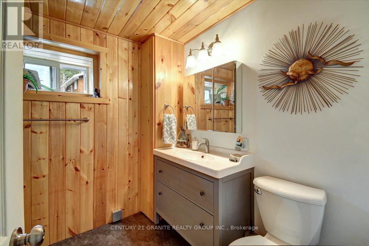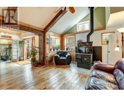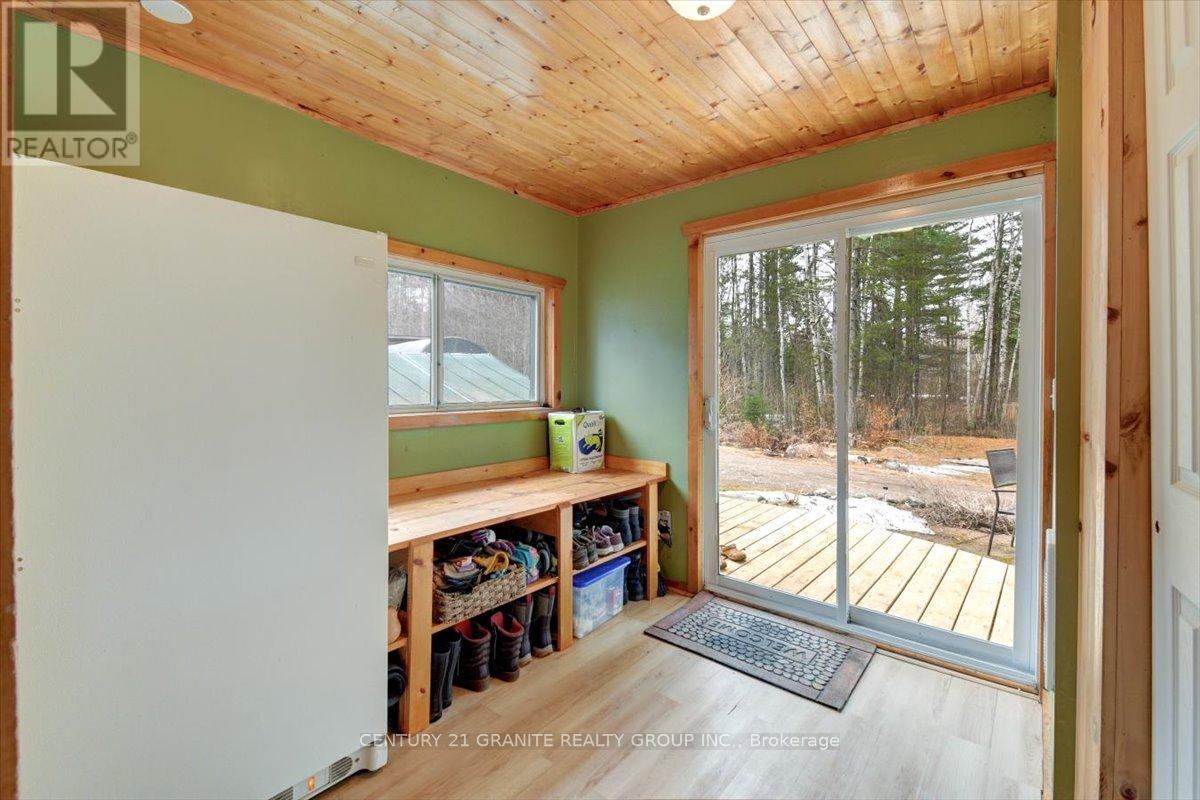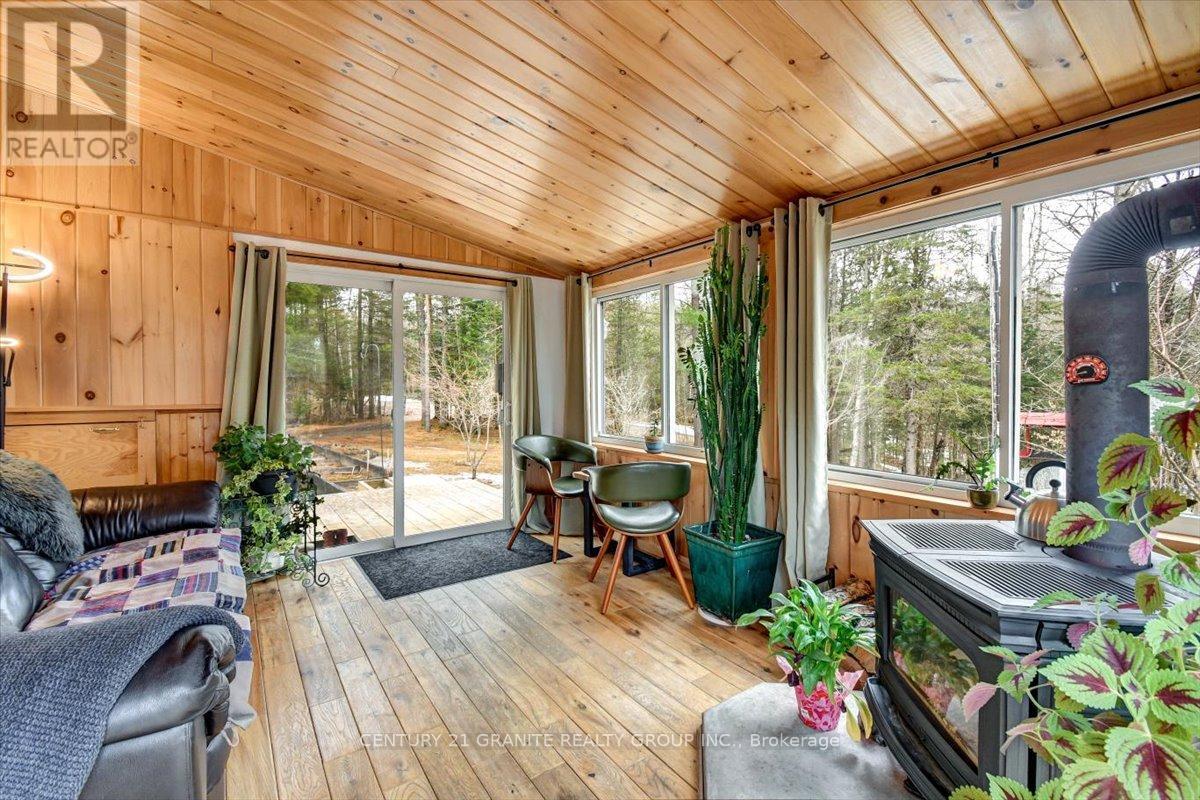 Position your lifestyle in beautiful Boulter, on a rare 28 acre retreat offering not one but two fully functional and independent homes, creating an unparalleled opportunity for multi generational living, income flexibility, or a private family compound. Surrounded by mature forest, perennial gardens and abundant wildlife, this property delivers scale, versatility and meaningful optionality. The main residence is warm, inviting and thoughtfully renovated. It features an open concept layout with soaring ceilings, hand hewn beams, hardwood floors and abundant natural light. Two bedrooms, a full bathroom, a bright sunspace and multiple decks support comfortable year round living. Heating is optimized through a heat pump, woodstove and charming cookstove. Upgraded insulation, electrical and a steel roof further enhance efficiency and durability. The second dwelling is equally compelling and functions as a true stand alone home. Built for flexibility, it offers two oversized bedrooms, each with its own ensuite and private balcony, plus a full additional bathroom. Baseboard heating and a woodstove support four season use, and generous recreation space provides exceptional utility. Both homes are serviced by their own septic systems and a shared drilled well. Exterior features include lush perennial gardens, raised vegetable beds, mature fruit trees, a substantial greenhouse, and multiple storage buildings. The gently sloping terrain, wooded trails and absence of visible neighbours create a serene, private environment ideal for four season enjoyment. Located on a year round municipally maintained road, the property offers seamless access to nearby communities including Bancroft, Combermere and Barry's Bay. Foster Lake Beach, Conroy Marsh Conservation Reserve, recreational trails and other community amenities are located minutes away. If you are seeking seclusion without isolation, this distinctive offering positions a new owner to leverage both lifestyle and investment. (id:61423)