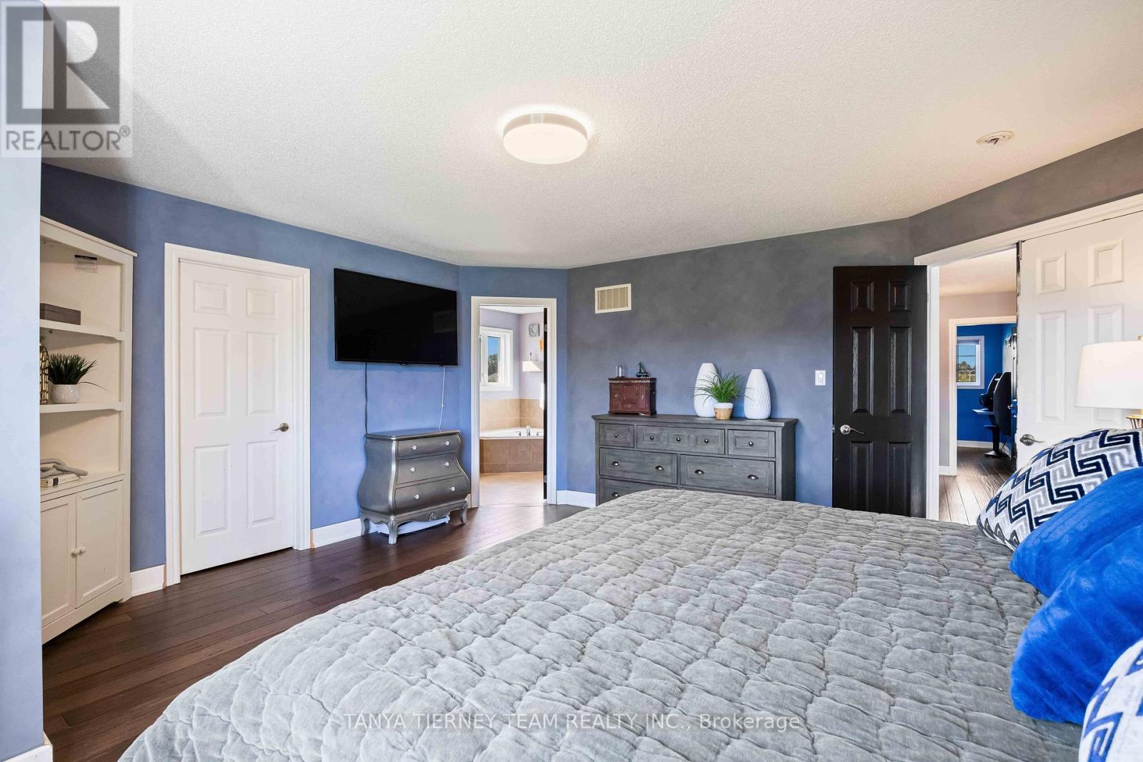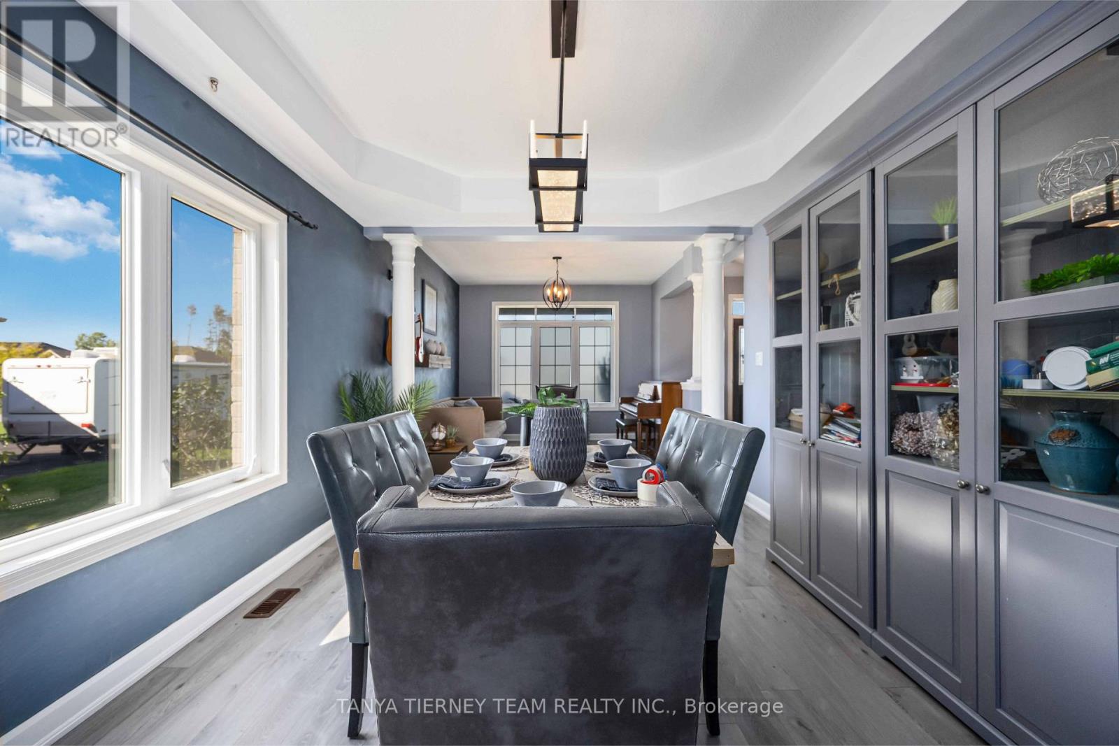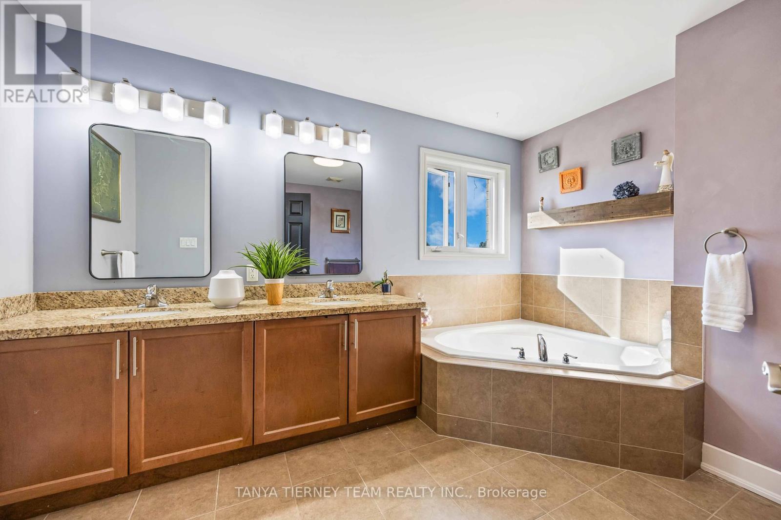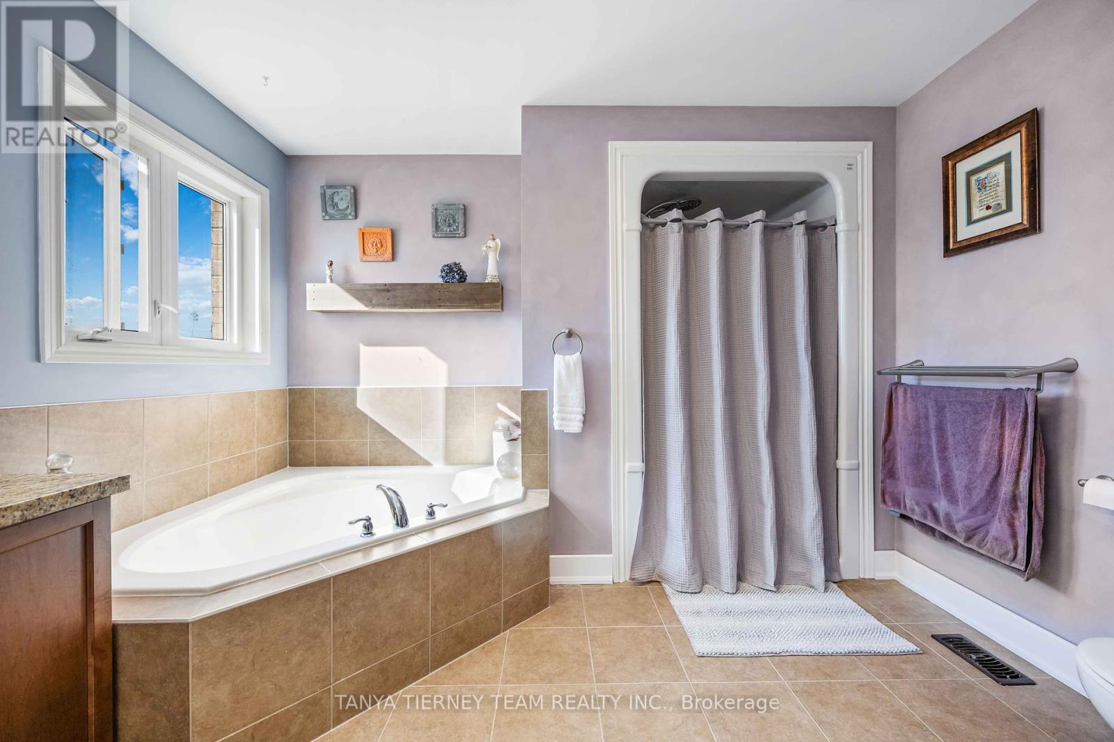 Incredible value and rarely offered 4+1 bedroom, 3 car garage, estate home with walkout basement, on a picturesque 0.7 acre pie shaped lot bordering on pristine conservation land. Welcome to the amazing community of Eden Park, a hamlet of custom built estate homes located on the outskirts of Clarington just a minute from 401 access. Ample parking on the triple wide and extra deep driveway, with landscaped exterior and path to the oversized porch. Inside you'll find 9 foot ceilings and over 3100 square feet that features an open concept layout filled with natural light. Upgraded lighting and flooring throughout the main level, with a stunning and spacious granite kitchen and breakfast area walkout to the elevated deck with pergola and sitting area overlooking the greenspace. The great room is truly the centrepoint to this layout, with 15 foot ceilings open to the above hall, granting panoramic views from both levels, and a gas fireplace for cozy evenings. The main floor laundry with access to the huge 3 car garage has a brand new washer and dryer. The upper level is entirely done in gorgeous bamboo flooring, with the primary bedroom boasting a deep walk in closet, and large 5 pc ensuite with dual sinks, granite counters and soaker tub. Additionally, the 2nd bed offers his and hers closets with built in custom shelving. The 3rd and 4th beds are both spacious with large windows, and a large 4 piece main bath with granite counters. What more could you ask for? How about a bright walk out basement with an additional finished 5th bedroom, and some interior walls installed just waiting for your finishing touches! (id:61423)