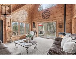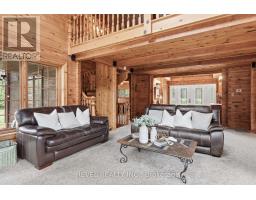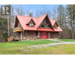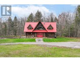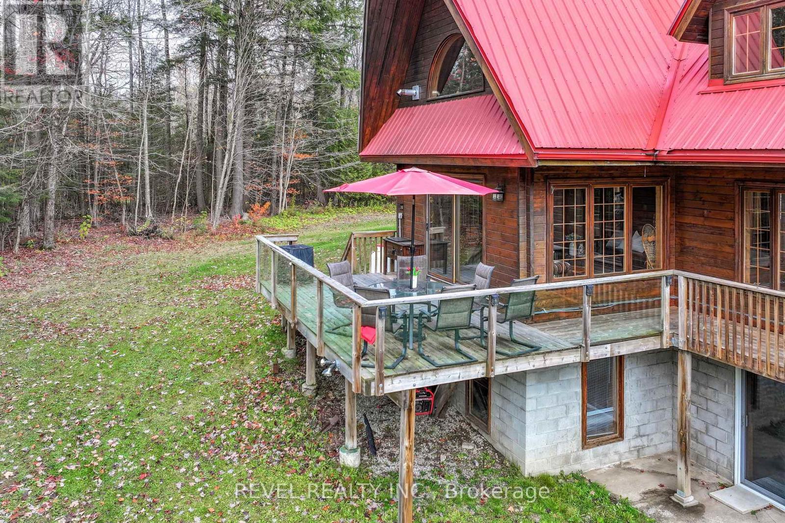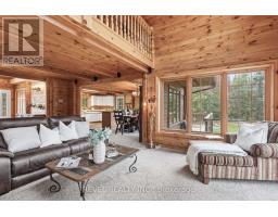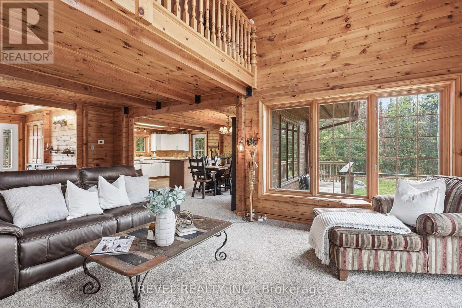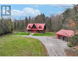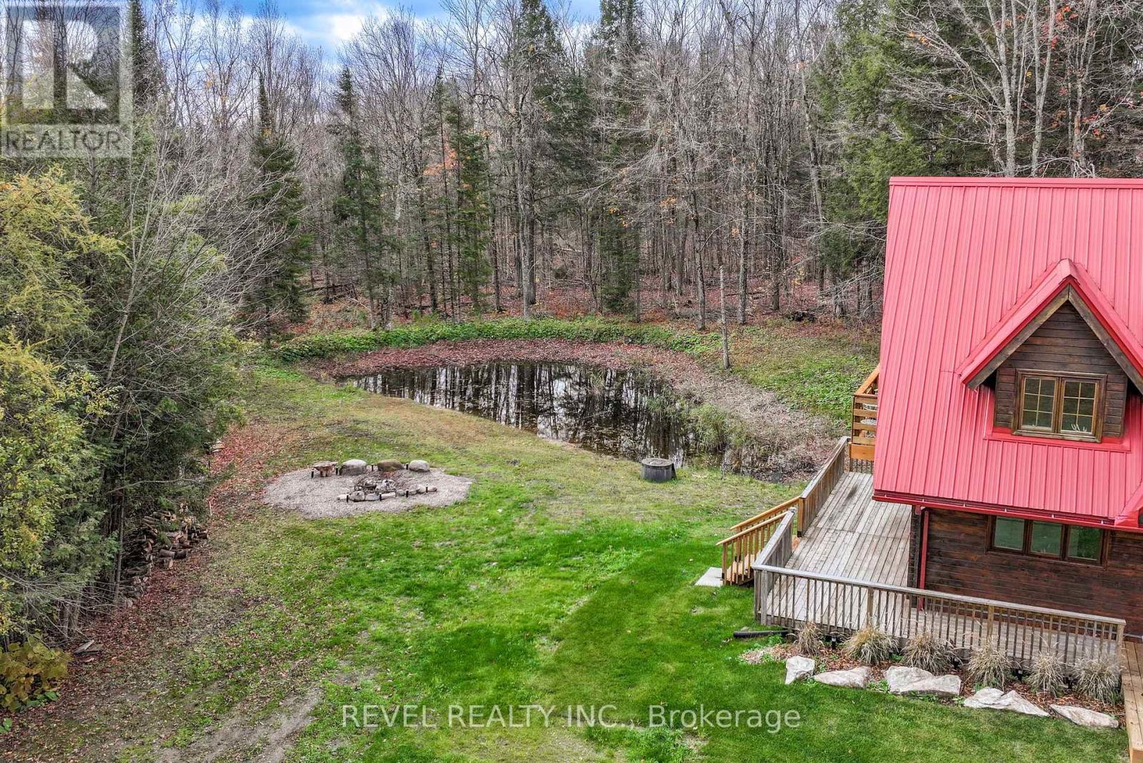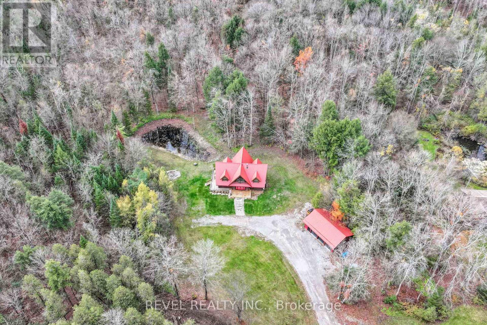 4+1 bedroom 3 bathroom log home with metal roof, offers the perfect balance of rustic charm and modern comfort. Walk in and be mesmerized by the grand foyer & living area, cathedral wood ceilings, cozy fireplace and abundant natural light from picturesque windows creating a warm and inviting atmosphere.The kitchen/dining combo is a cooking paradise, featuring newer appliances, propane stove, OTR microwave, pantry and ideal for both daily living and entertaining. Gorgeous spiral natural wood staircase leading you to the upper level of the home with additional bedrooms, full bathroom and sitting area loft. Primary Suite with walk out Juliet Deck. Lower level with full recreational room, laundry area, sauna, work out area, bathroom and walk out to yard. Step outside to the expansive wraparound deck with breathtaking views of the pond and surrounding 1.89 acres of forest. Bonus three car detached garage with hydro. (id:61423)