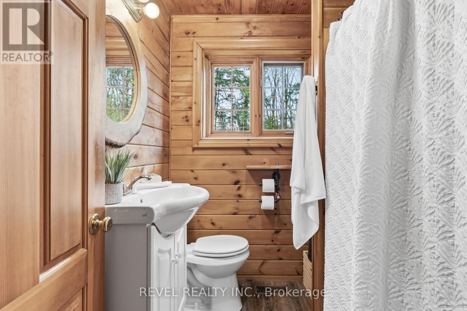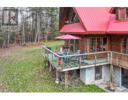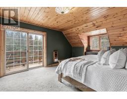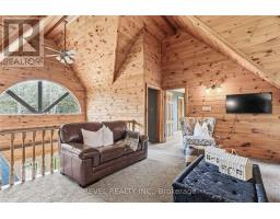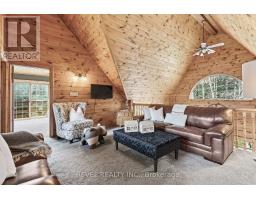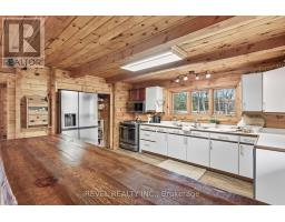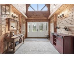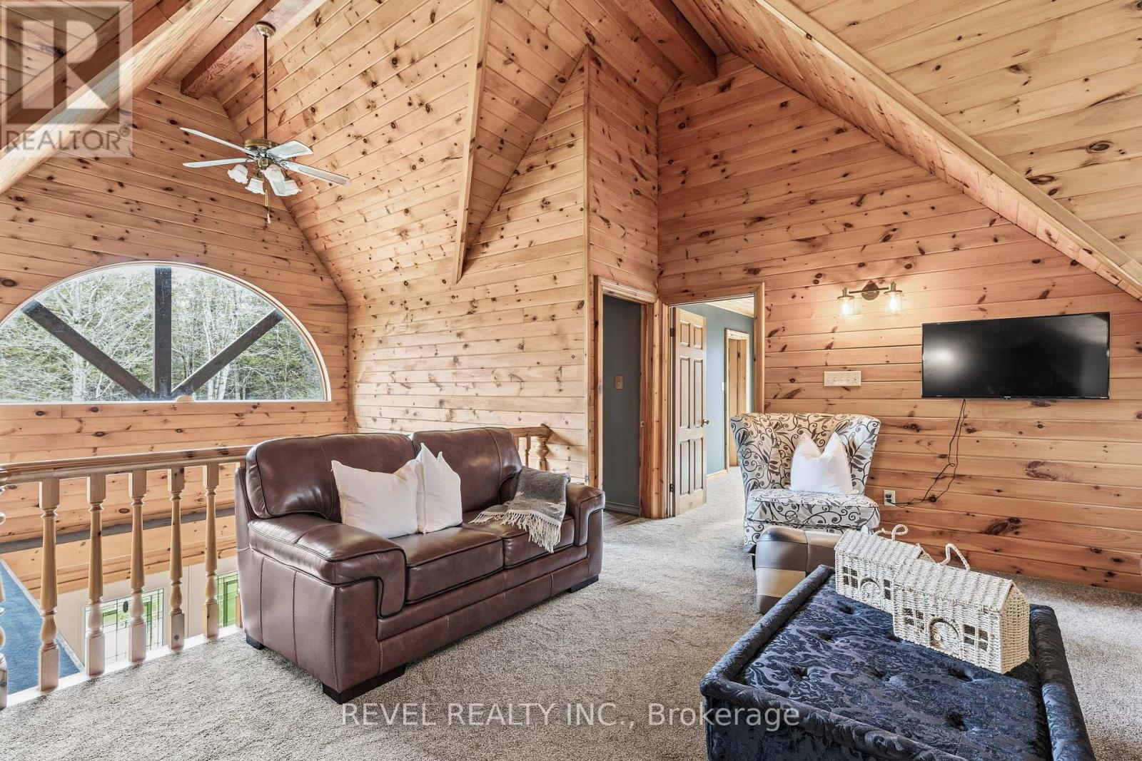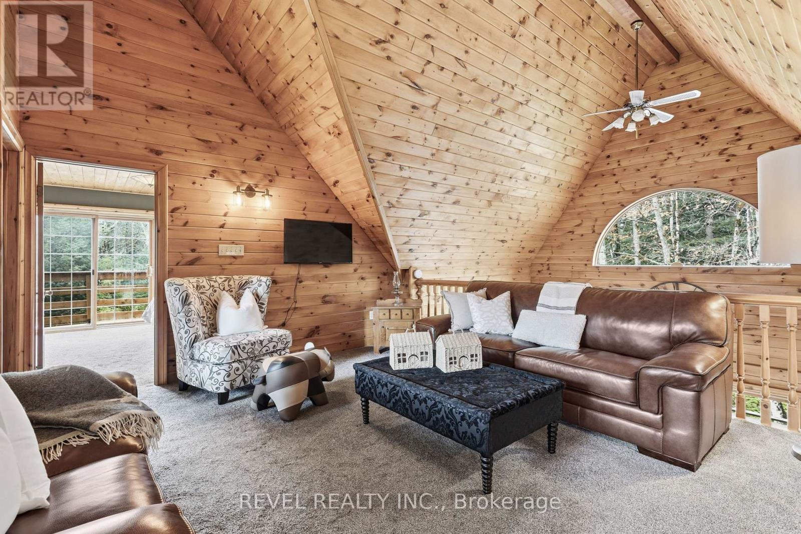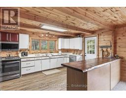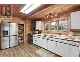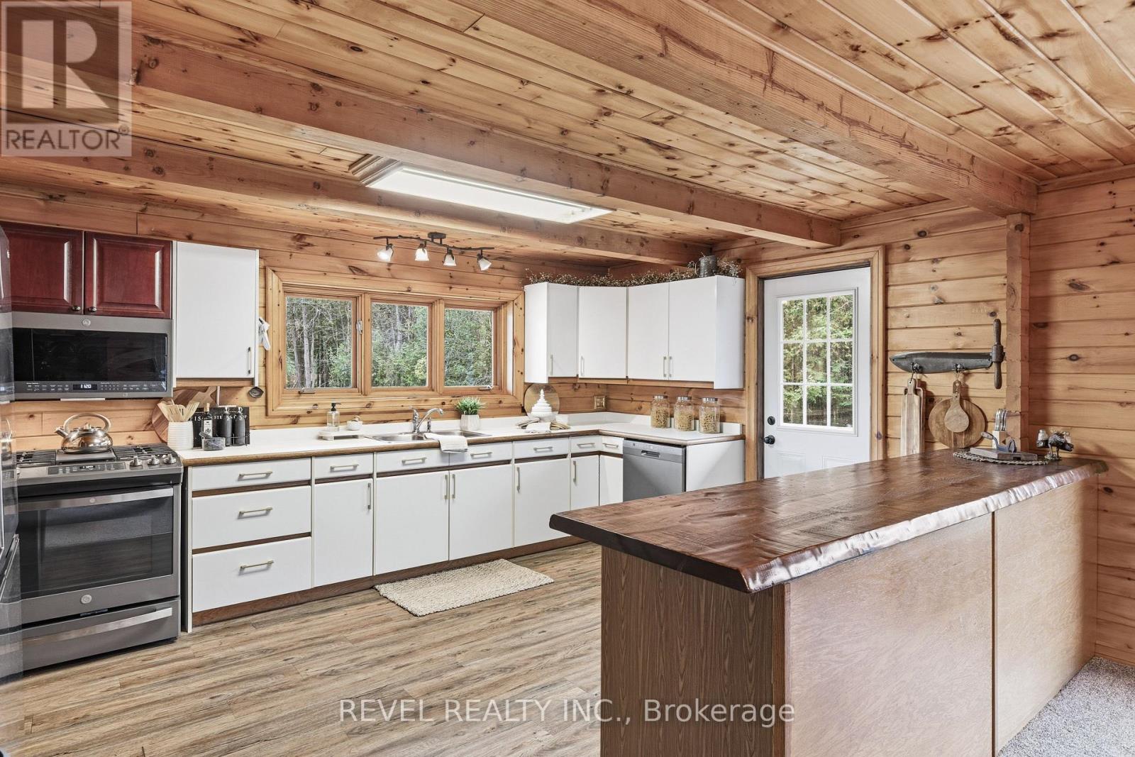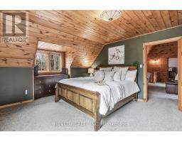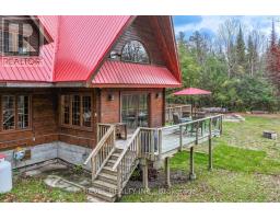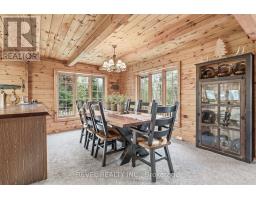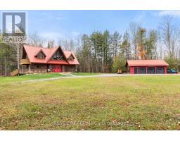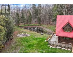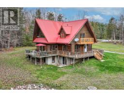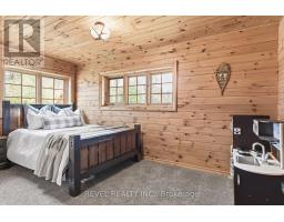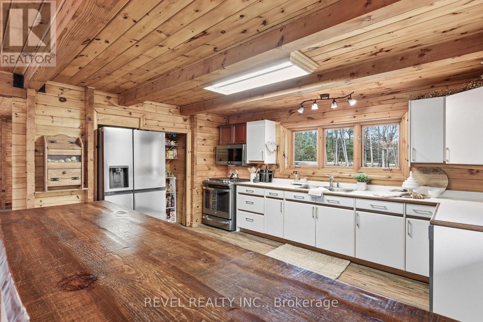 4+1 bedroom 3 bathroom log home with metal roof, offers the perfect balance of rustic charm and modern comfort. Walk in and be mesmerized by the grand foyer & living area, cathedral wood ceilings, cozy fireplace and abundant natural light from picturesque windows creating a warm and inviting atmosphere.The kitchen/dining combo is a cooking paradise, featuring newer appliances, propane stove, OTR microwave, pantry and ideal for both daily living and entertaining. Gorgeous spiral natural wood staircase leading you to the upper level of the home with additional bedrooms, full bathroom and sitting area loft. Primary Suite with walk out Juliet Deck. Lower level with full recreational room, laundry area, sauna, work out area, bathroom and walk out to yard. Step outside to the expansive wraparound deck with breathtaking views of the pond and surrounding 1.89 acres of forest. Bonus three car detached garage with hydro. (id:61423)