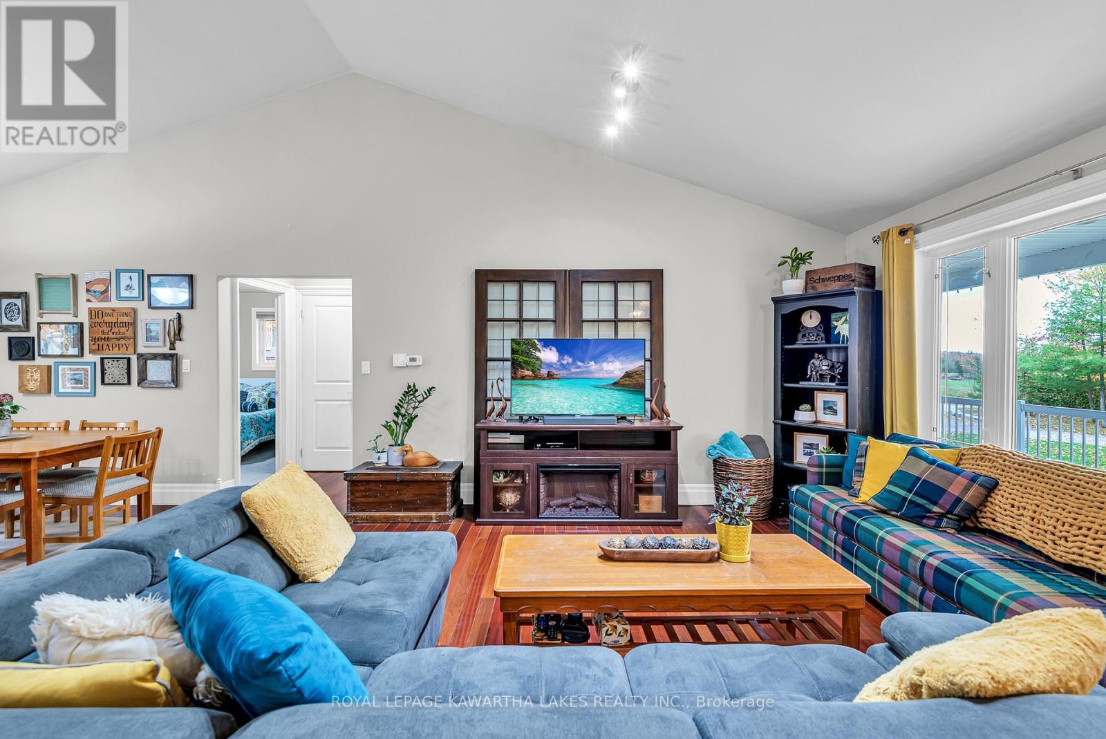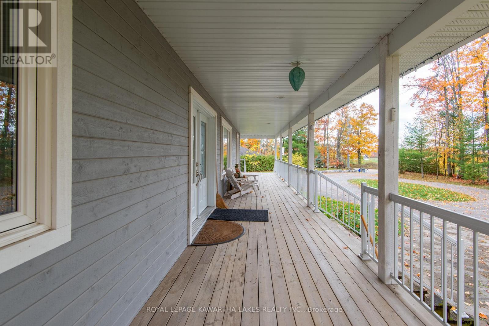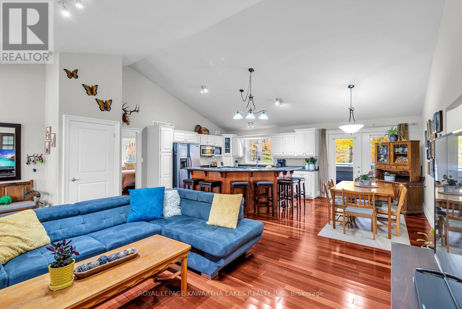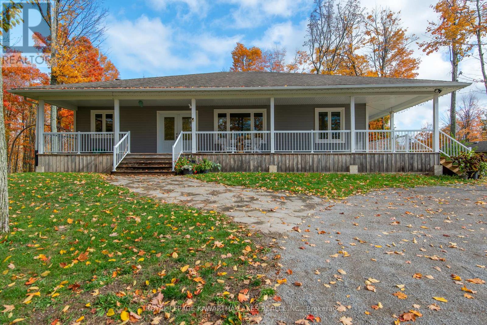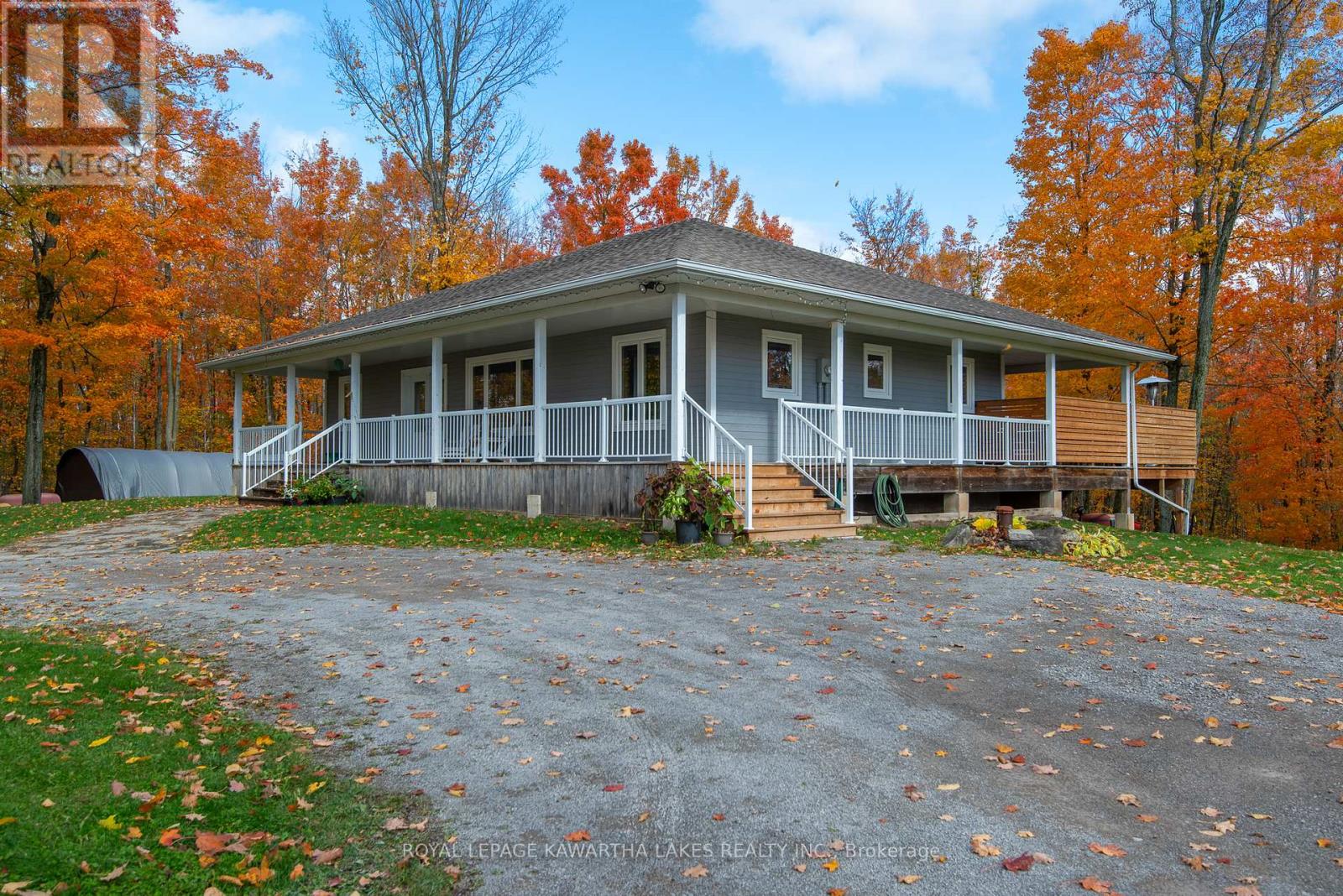 Welcome To This Well Built Bungalow On A 1 Acre Lot Just Minutes Outside Bobcaygeon, Offering The Perfect Blend Of Country Tranquility And Modern Comfort. Backing Onto A Peaceful Mixed Forest With Mature Maple Trees, This Home Features Premium Maibec Wood Siding, A Circular Driveway With Armour Stone Landscaping, And A Wrap-Around Covered Porch. Inside, You're Greeted With An Open-Concept Living, Dining, And Kitchen With Beautiful Brazilian Cherry Wood Flooring & Walk-Out Access To The Rear Covered Porch, Perfect For Entertaining Or Relaxing Outdoors. The Primary Bedroom Features A 5-Piece Ensuite With Double Vanity, While Two Additional Bedrooms Share A 4-Piece Bath On The Opposite Side Of The Home. The Partially Finished Basement Offers 9-Foot Ceilings, A Walk-Out To The Backyard, A Roughed-In Bath, And A Cozy Wood Stove For Backup Heat. Complete With Forced Air Oil Heating, Central Air, A Drilled Well, Septic System, This Property Is Ready To Enjoy! (id:61423)