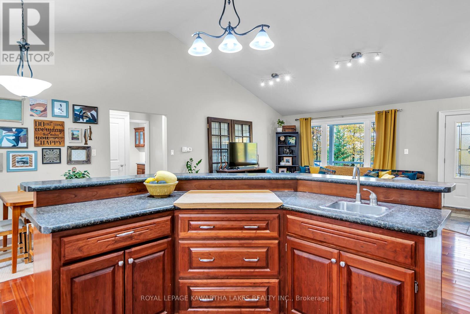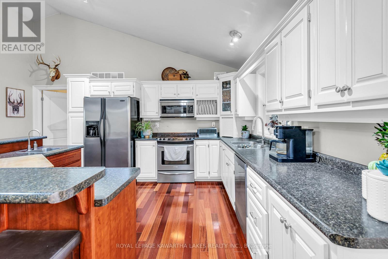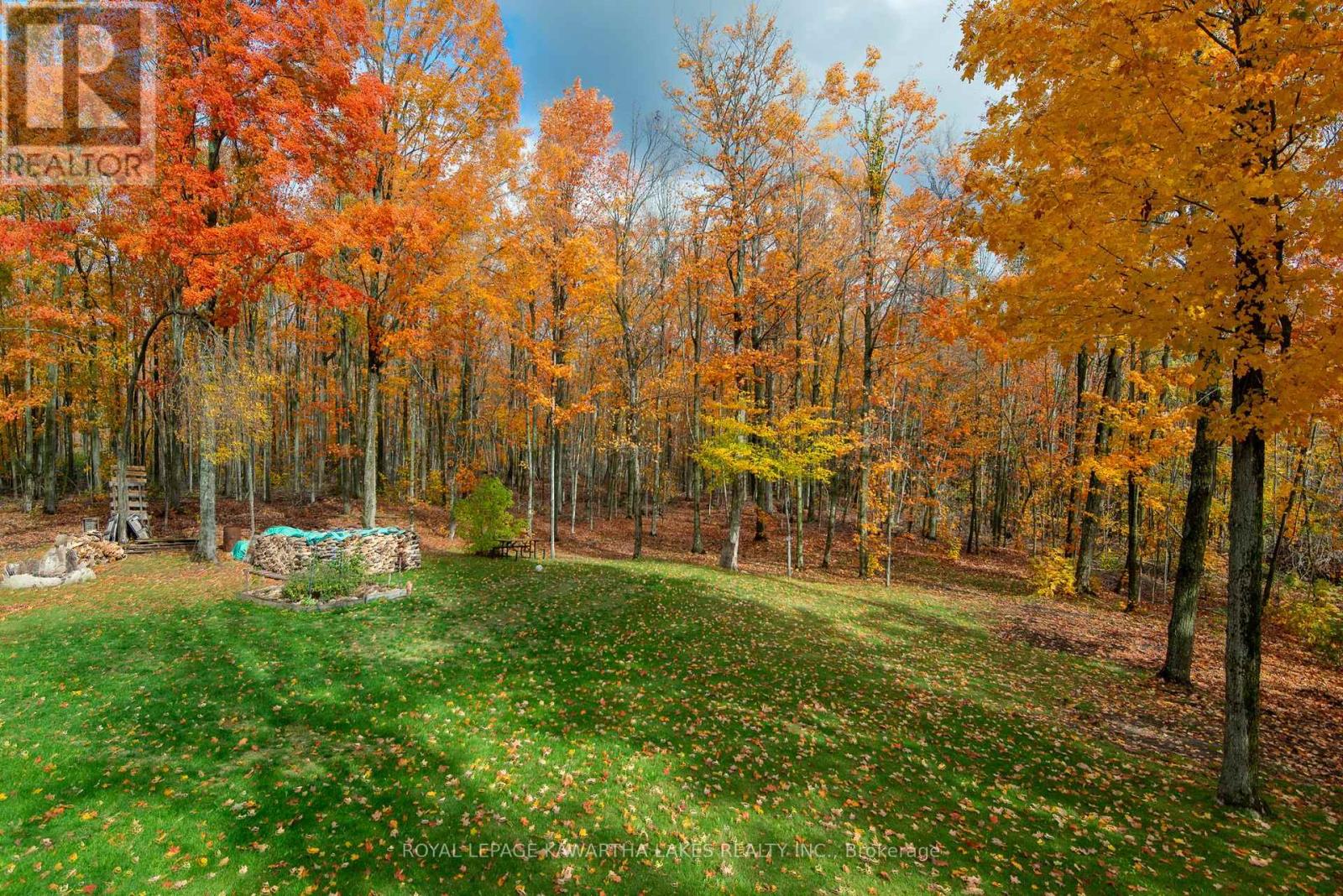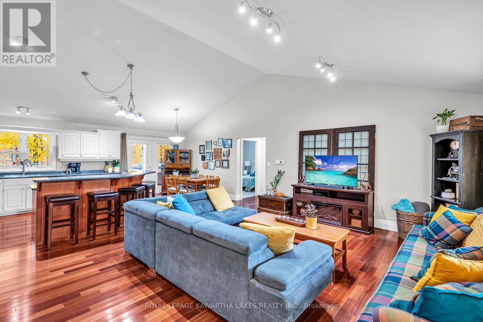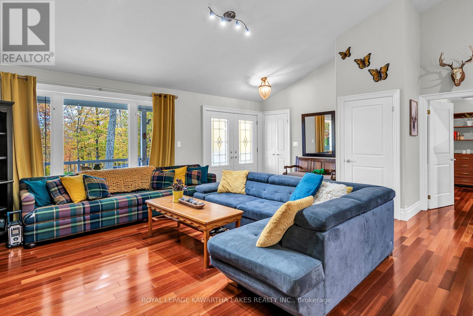 Welcome To This Well Built Bungalow On A 1 Acre Lot Just Minutes Outside Bobcaygeon, Offering The Perfect Blend Of Country Tranquility And Modern Comfort. Backing Onto A Peaceful Mixed Forest With Mature Maple Trees, This Home Features Premium Maibec Wood Siding, A Circular Driveway With Armour Stone Landscaping, And A Wrap-Around Covered Porch. Inside, You're Greeted With An Open-Concept Living, Dining, And Kitchen With Beautiful Brazilian Cherry Wood Flooring & Walk-Out Access To The Rear Covered Porch, Perfect For Entertaining Or Relaxing Outdoors. The Primary Bedroom Features A 5-Piece Ensuite With Double Vanity, While Two Additional Bedrooms Share A 4-Piece Bath On The Opposite Side Of The Home. The Partially Finished Basement Offers 9-Foot Ceilings, A Walk-Out To The Backyard, A Roughed-In Bath, And A Cozy Wood Stove For Backup Heat. Complete With Forced Air Oil Heating, Central Air, A Drilled Well, Septic System, This Property Is Ready To Enjoy! (id:61423)